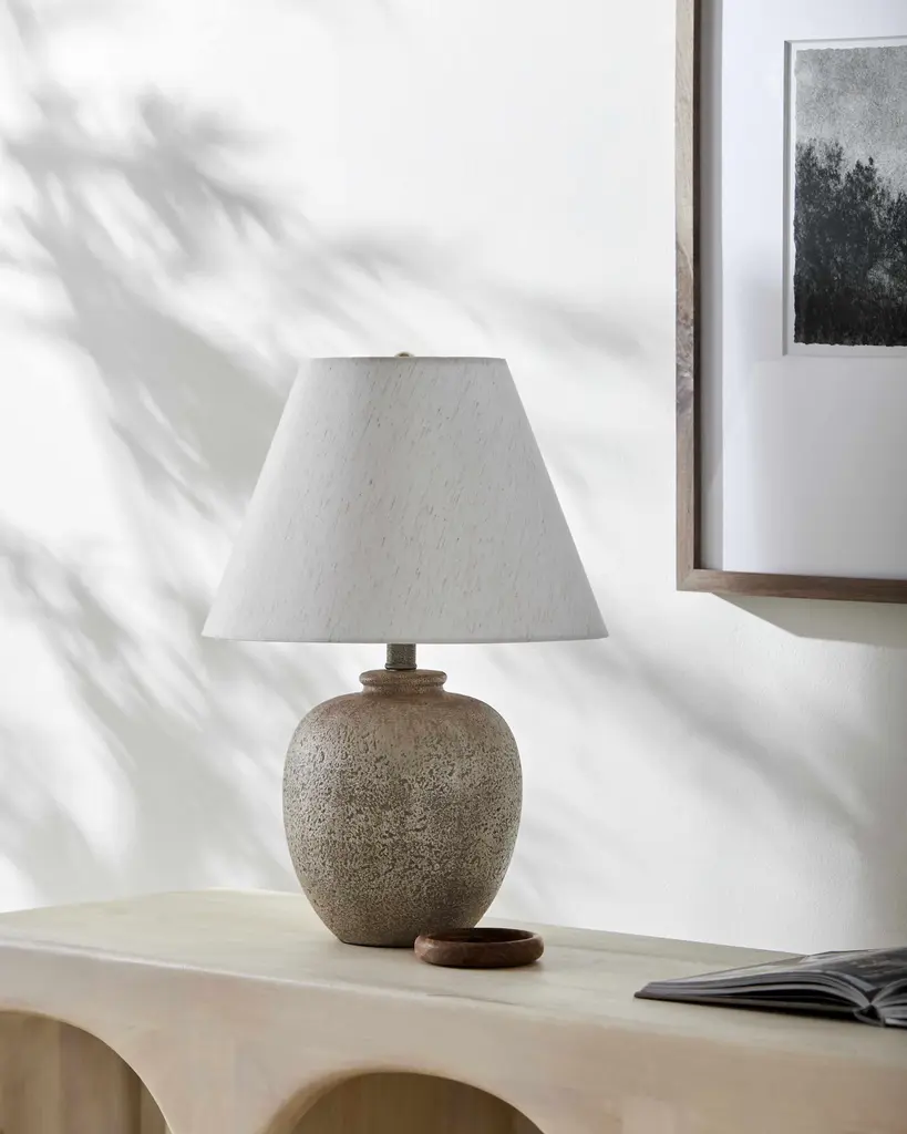 Collection: Montecanal Colors: Light Gray, Beige, Metallic - Brass, Translucent Material: Body: Ceramic / Shade (Outside): Linen / Shade (Inside): Polyester / Finial: Iron Styles: Traditional Made In: China Lighting Type: Accent Table Lighting Shade Material: Linen, Polyester Shade Color: Beige, Beige Cord Length: 6' Switch Type: On/Off Number of Bulbs: 1 Socket Type: E-26 Bulb Wattage: 60W