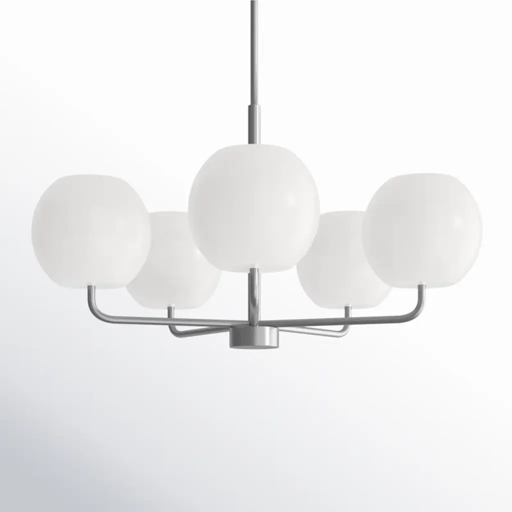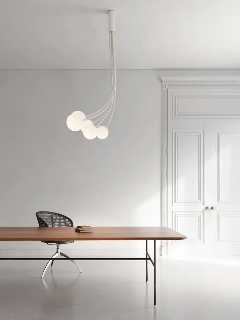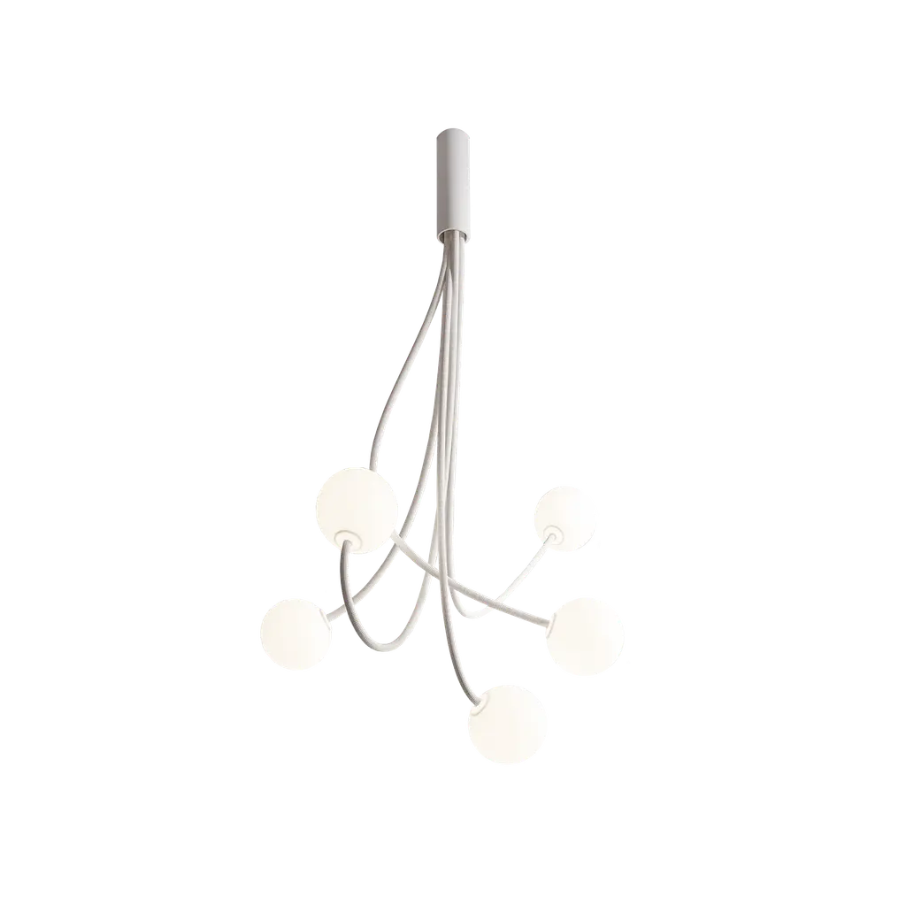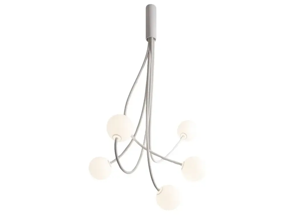 Moony is a ceiling lamp for indoor use, with flexible arm. Marcantonio design.Technical featuresCategory: IndoorTypology: CeilingLight Source: LEDE27 5x max 7W LED IP 20 (bulb not provided)Material: metal rod, covered with white canvas, globe diffuser in white frostedDescription: Structure in white canvas stocking, diffuser in frosted glassWhen you have the moon and you’d like to change your mood, then all you need to do is move Moony, which reflects different states of mind.Moony by Marcantonio shows its best side by adapting to moods, thanks to its flexible arm.A versatile family, set out in single-arm applique fittings, a free-standing lamp in two heights, and a down light with single, three or even five arms to suit more complex personalities.The floor version faces upwards to the ceiling or is bent on itself, like a reading lamp. The applique version can be directed as needed, with the three- or five-arm fittings that are freed from a small cylinder secured to the ceiling, or any way your creativity can offer.The mobile rod in metal, with a white covering supports a frosted globe containing the LED light source.The semisphere base in cement offers two heights for the Moony floor lamp.