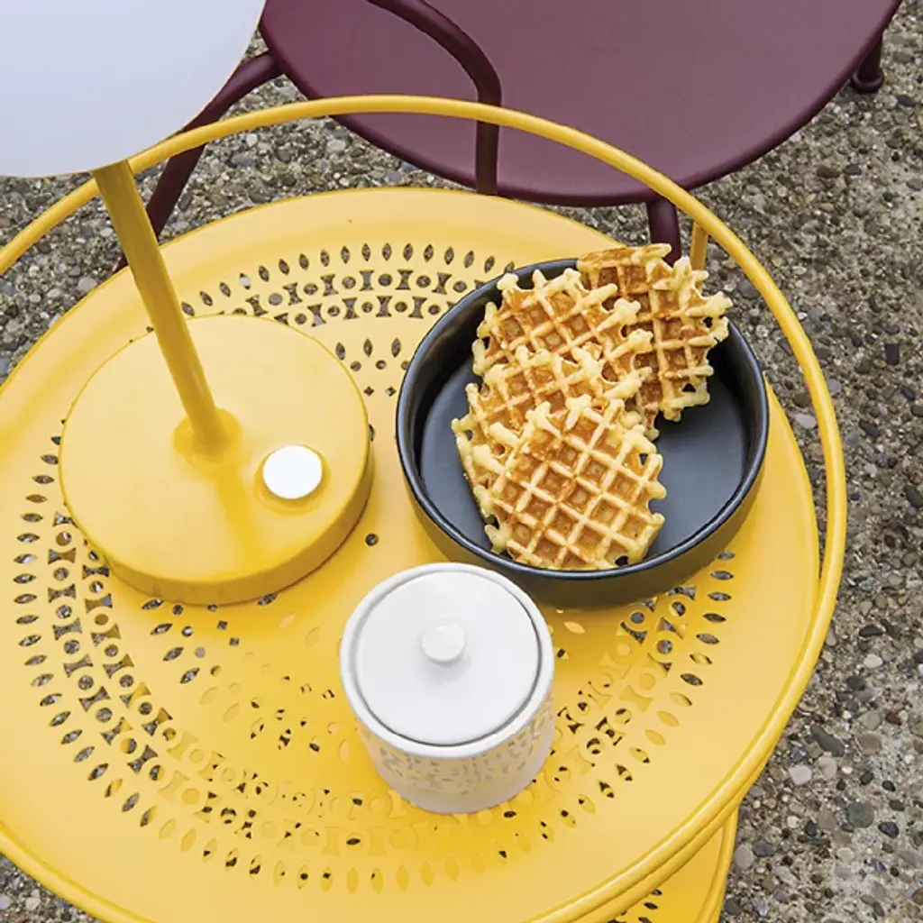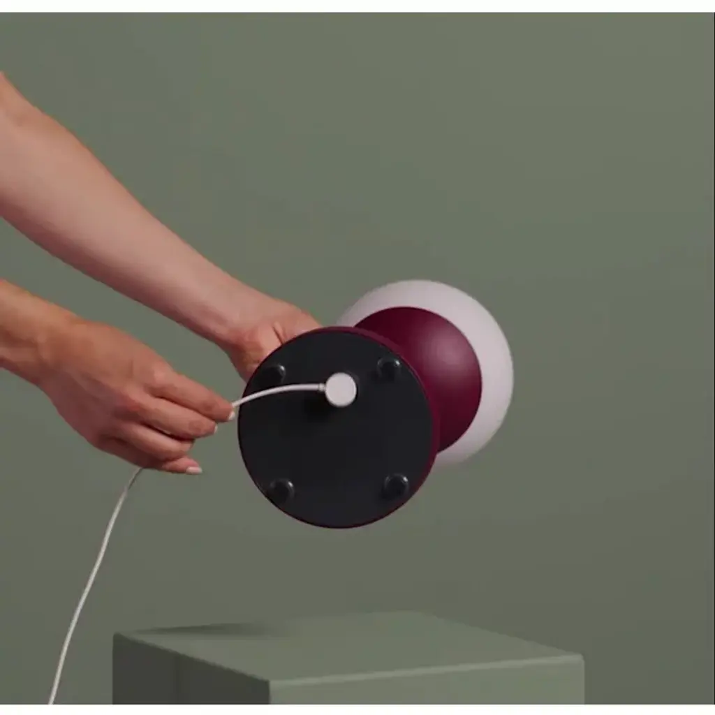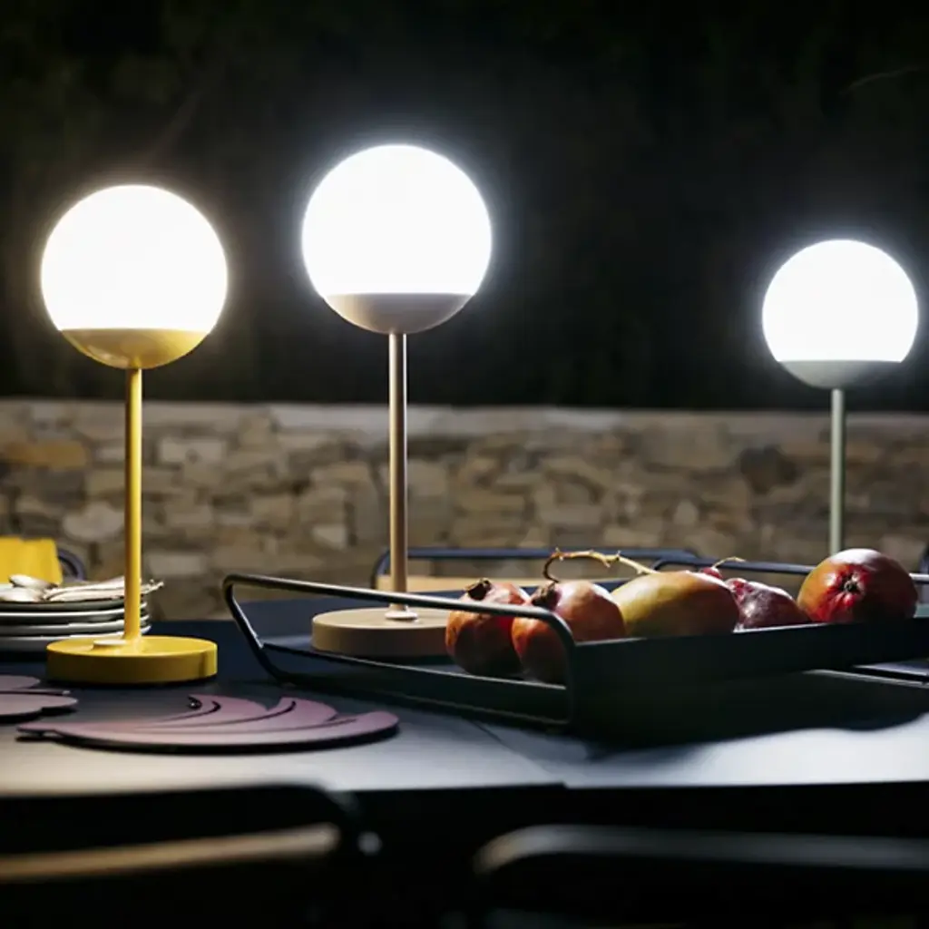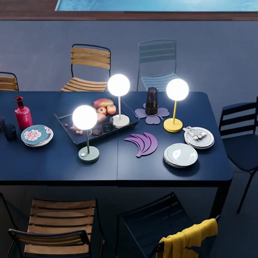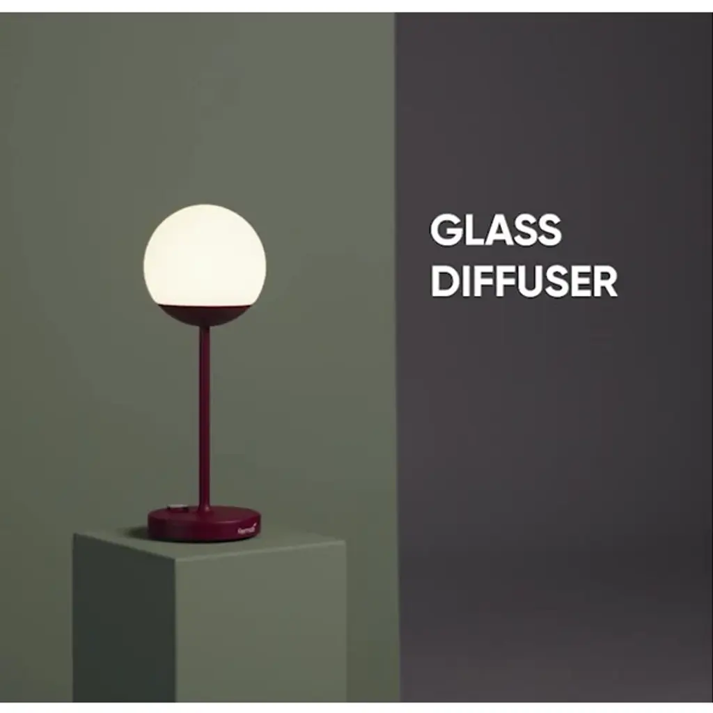 Modern mood lighting. Inspired by Paris street lamps, the Fermob MOOON! LED Table Lamp is a unique design by Tristan Lohner. It features a lightweight Aluminum stand with an anti-UV powder coating and White Polyethylene sphere shaped diffuser. Perfect for entertaining outdoors, the versatile LED table top lamp has a built-in rechargeable battery that runs for up to 10 hours. Set it out on your patio for an evening of outdoor dining and entertaining friends or plug it in and give it a permanent place indoors as an accent light or bedside lamp. An inspirational piece, it offers cool white (6000K) and warm white (4000K) settings with a dimmer function for the perfect ambiance.
