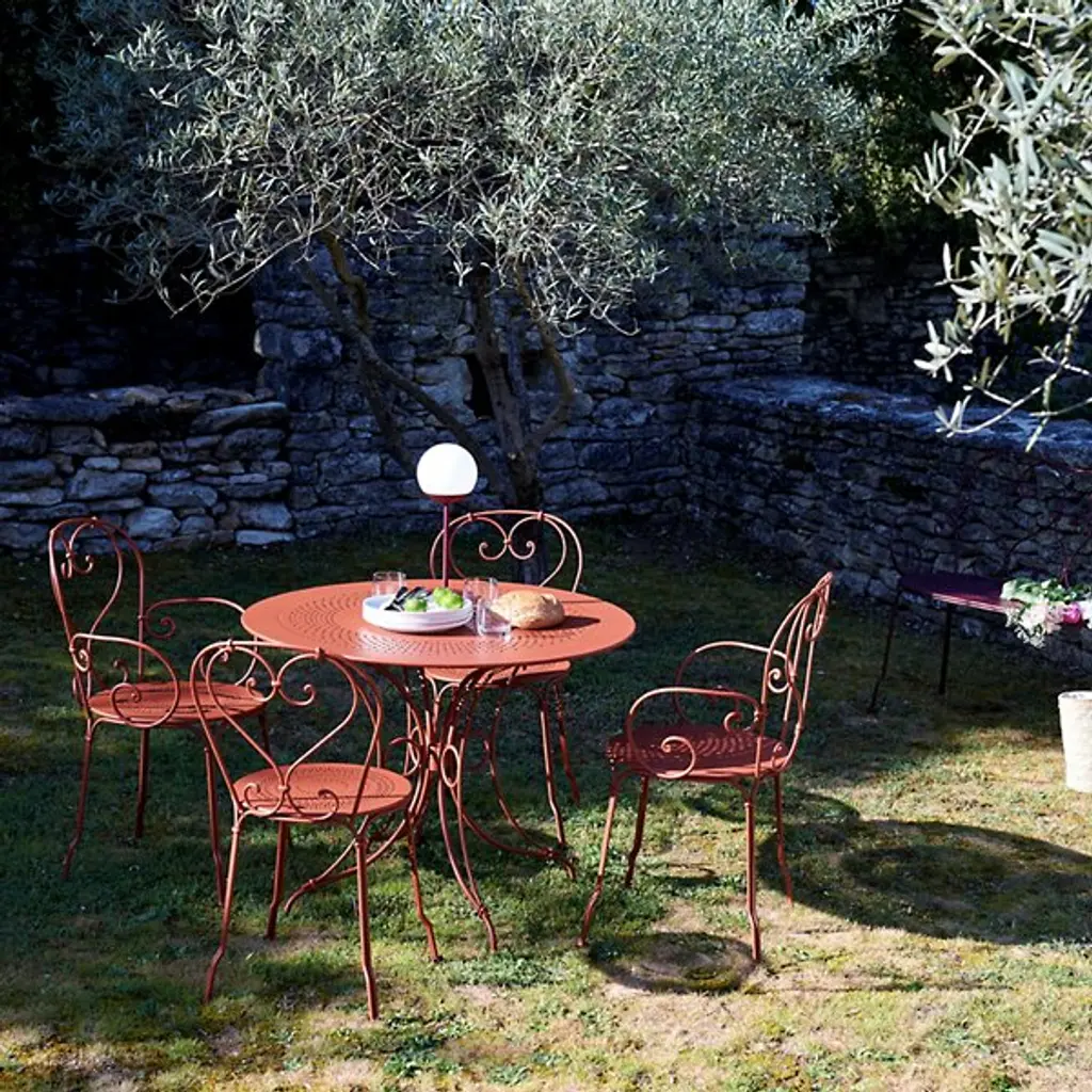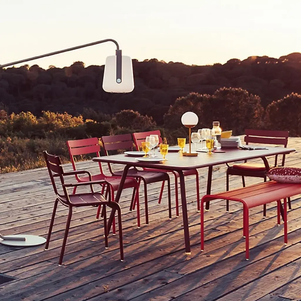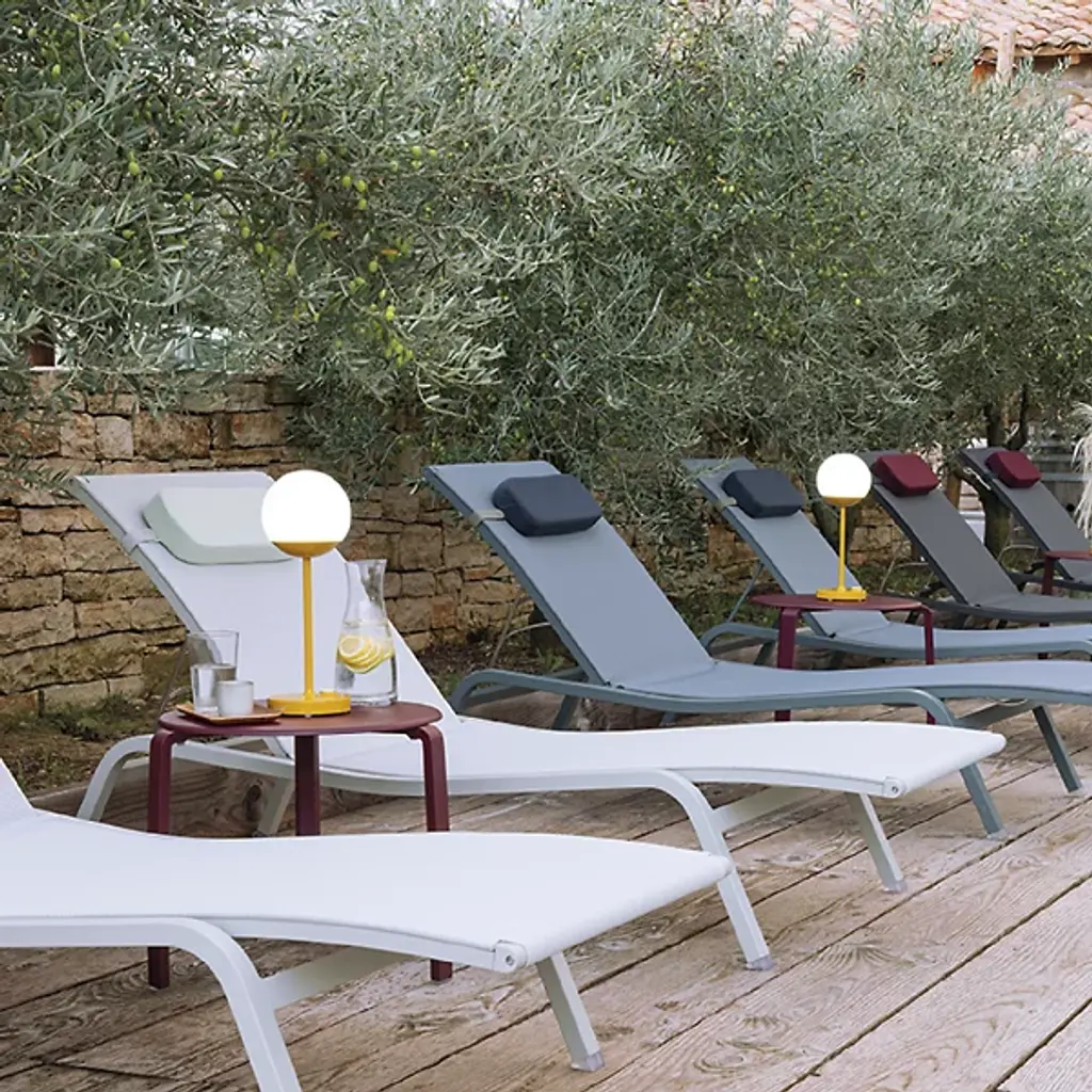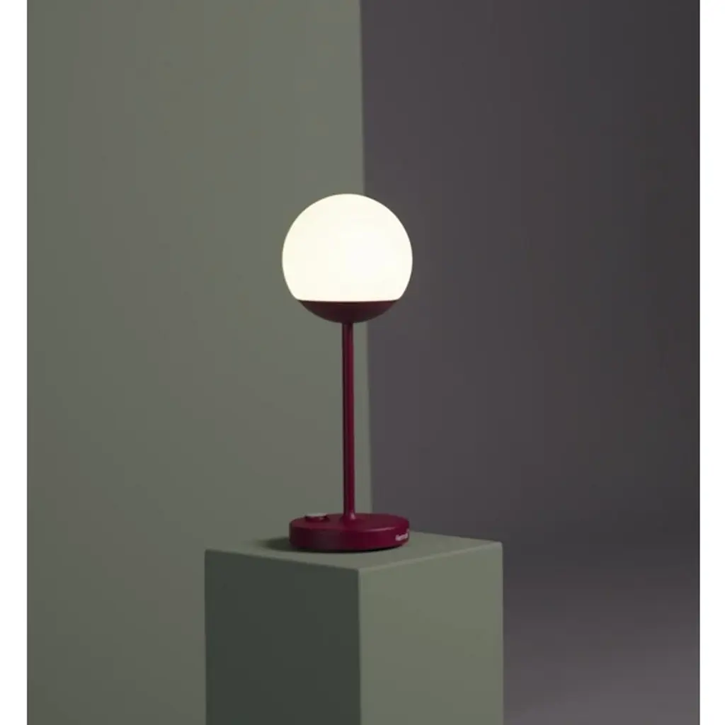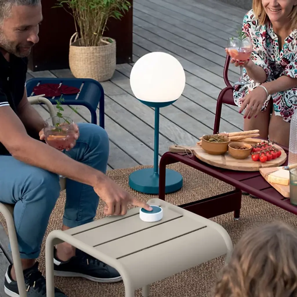 Modern mood lighting. Inspired by Paris street lamps, the Fermob MOOON! LED Table Lamp is a unique design by Tristan Lohner. It features a lightweight Aluminum stand with an anti-UV powder coating and White Polyethylene sphere shaped diffuser. Perfect for entertaining outdoors, the versatile LED table top lamp has a built-in rechargeable battery that runs for up to 10 hours. Set it out on your patio for an evening of outdoor dining and entertaining friends or plug it in and give it a permanent place indoors as an accent light or bedside lamp. An inspirational piece, it offers cool white (6000K) and warm white (4000K) settings with a dimmer function for the perfect ambiance.