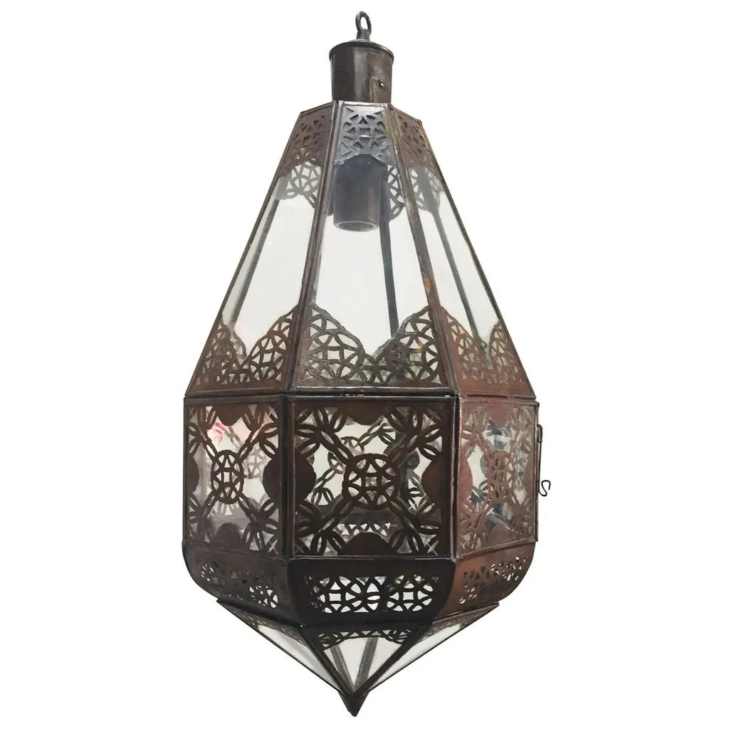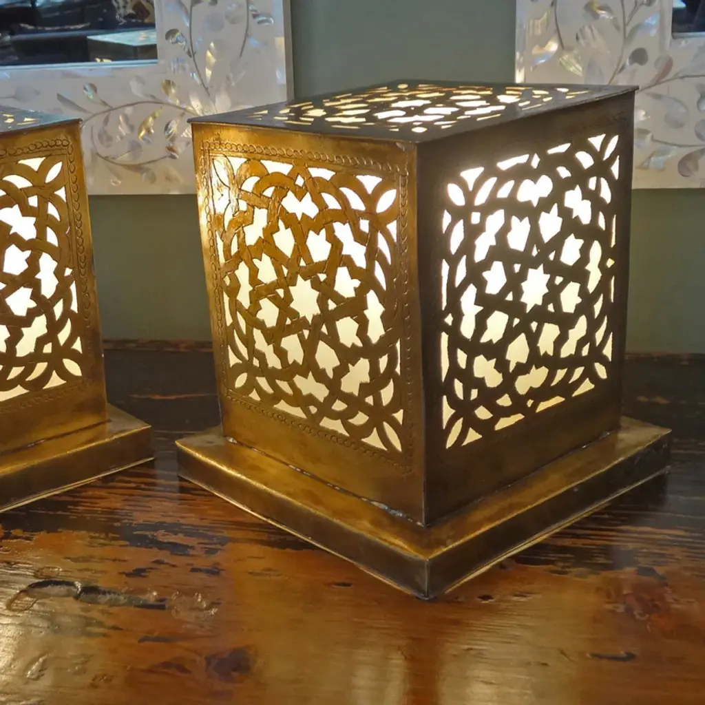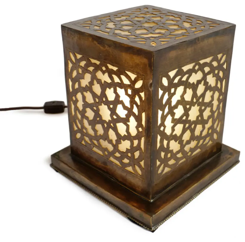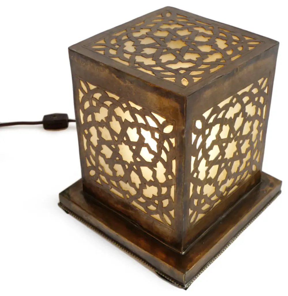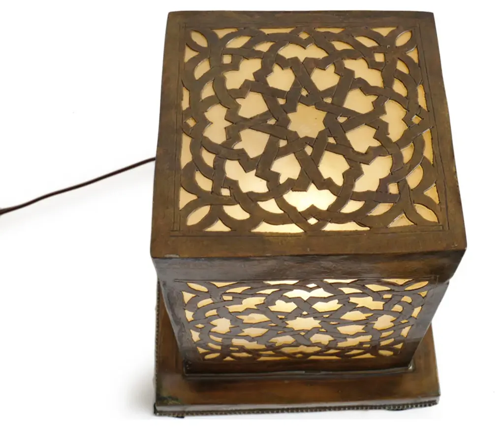 Beautiful vintage hand crafted Moroccan brass table lamp. Traditional Moorish design pattern box shaped table lamp with frosted white glass panels. Cord switch with 100 watt max fixture. This item is non-returnable - all sales are final.Bulb Type: 100 Watt MaxNumber of Bulbs: 1Bulbs Included: 0UL Certified