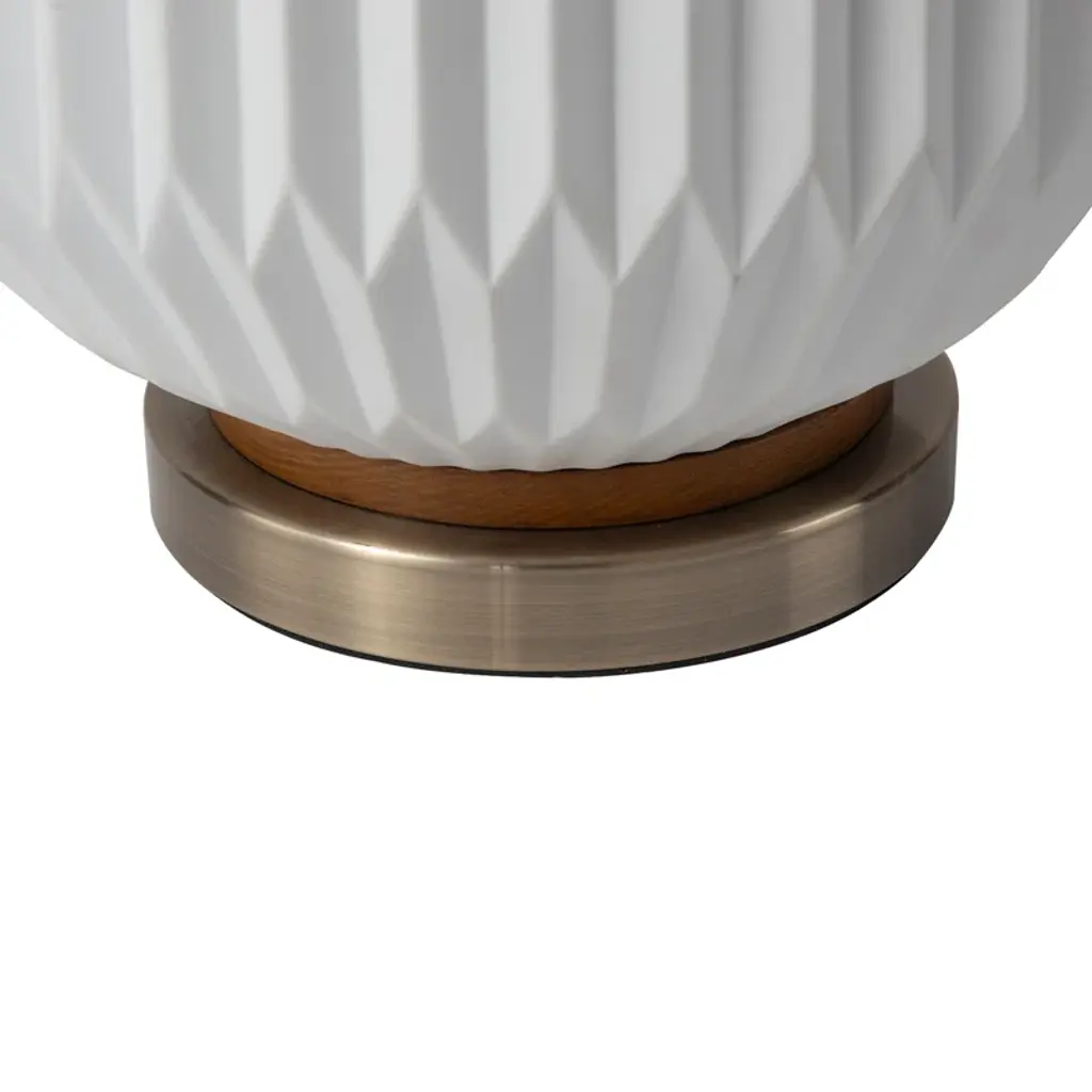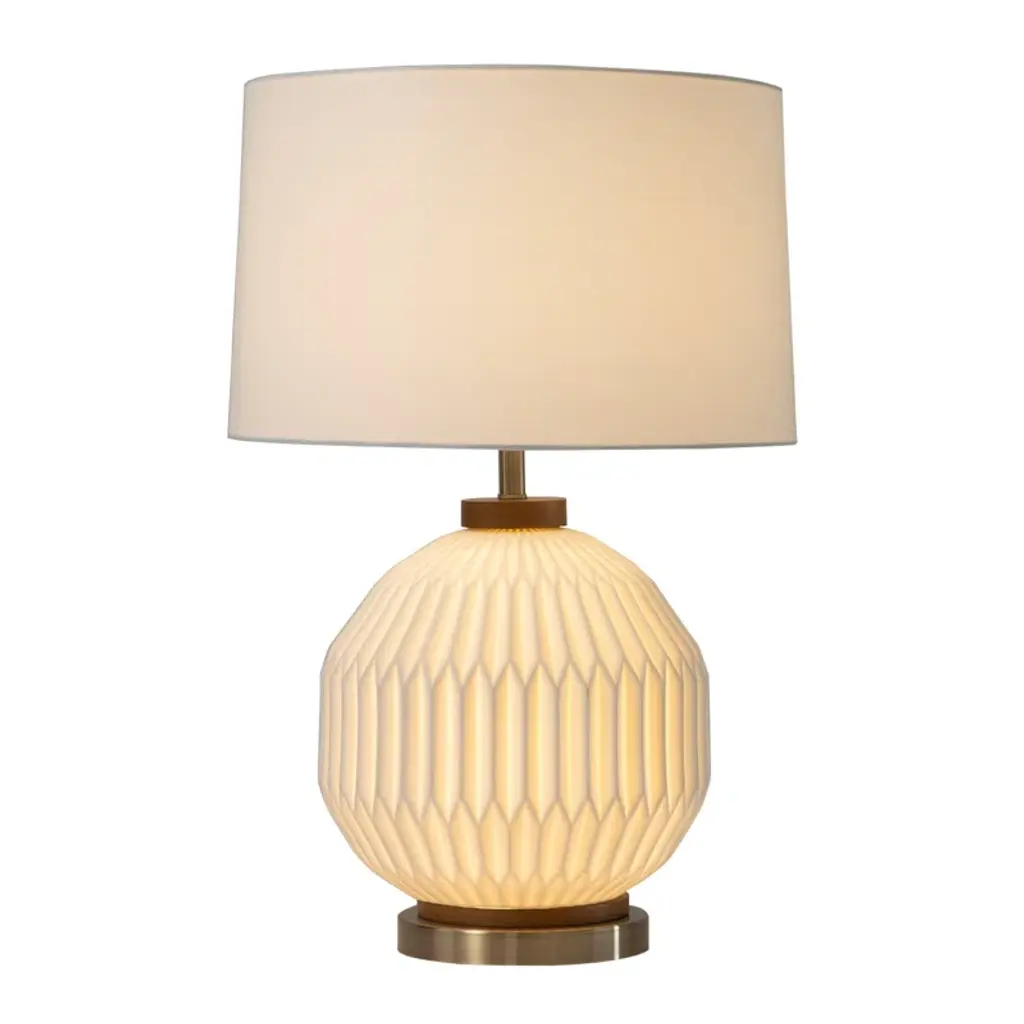 Discover the Moraga Table Lamp, an elegant lighting solution with a delightful hidden night light feature. The lamp's cutwork bone porcelain body conceals an LED light source that, when illuminated, casts a warm and exquisite glow, suitable for creating ambient lighting or serving as a comforting nightlight. Switch on the upper light and it fills the room with warm light. The intricate pattern within the orb-shaped body enables light to vary in intensity, enhancing the visual allure. The lamp features a 4-way rotary switch that allows you to customize the lighting experience. You can choose to have the shade light, body light, both lights on, or both lights off. The lampshade is skillfully crafted from white linen, adding to its sophisticated appeal. Elevate your space with the Moraga Table Lamp, where aesthetics meet functionality in perfect harmony.