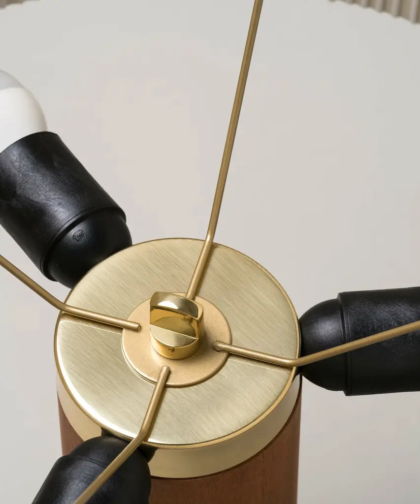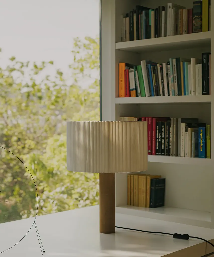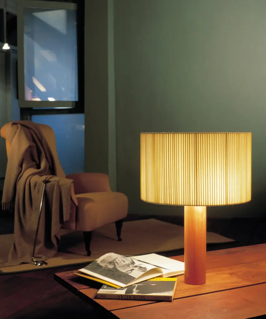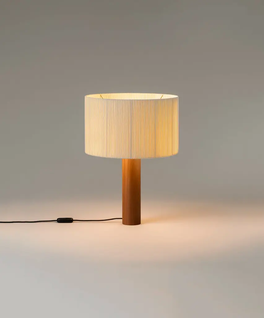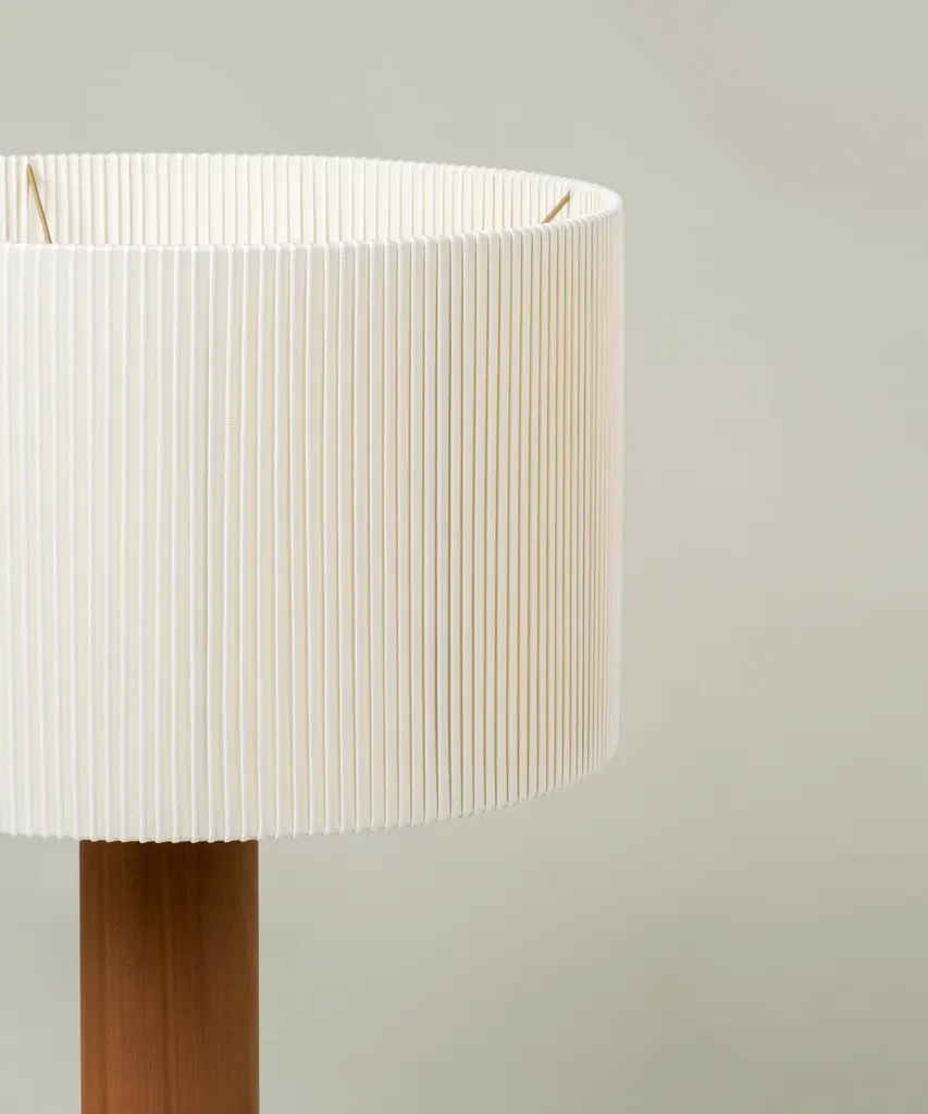 A sturdy wooden cylinder supports a head with three bulbs, surrounded by a generous circular shade. The shade is made from cotton ribbon and has a thread running along the edge, reminiscent of bookbinding, forming an asymmetry that creates a splendid contrast of light and shadow. Produced by the Barcelona-based lighting purveyor, Santa & Cole.