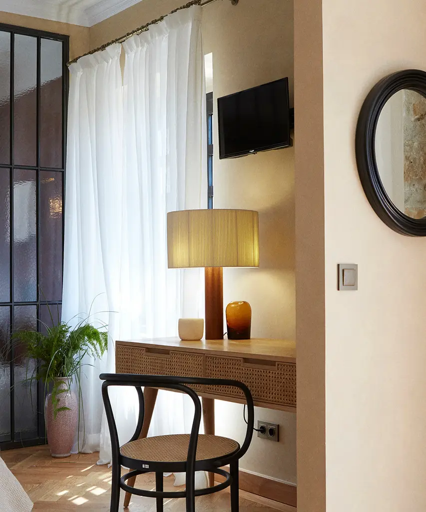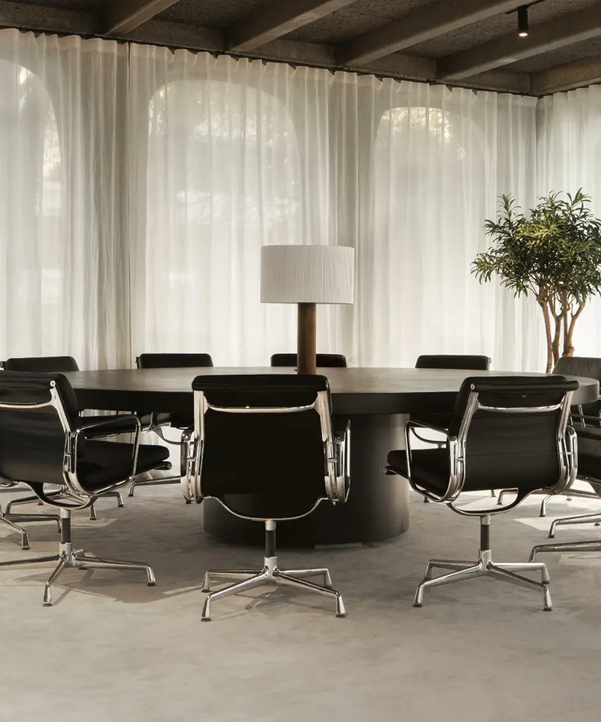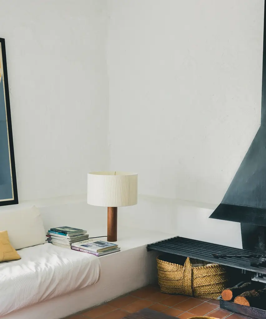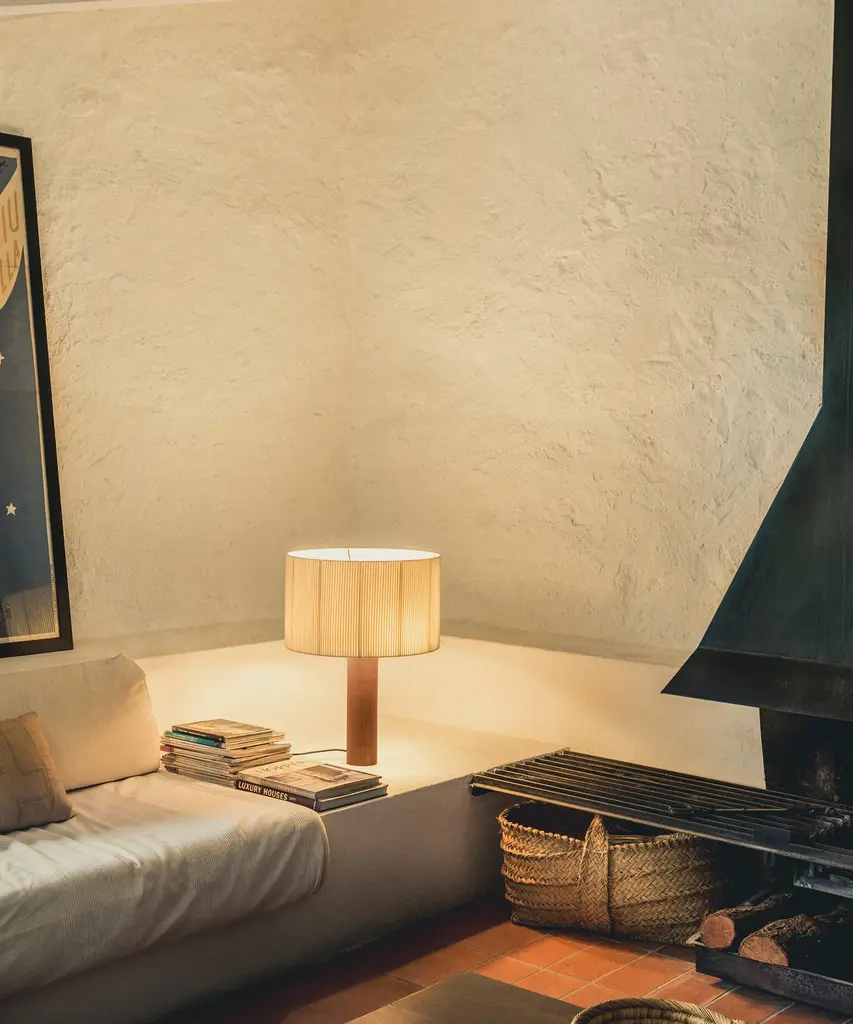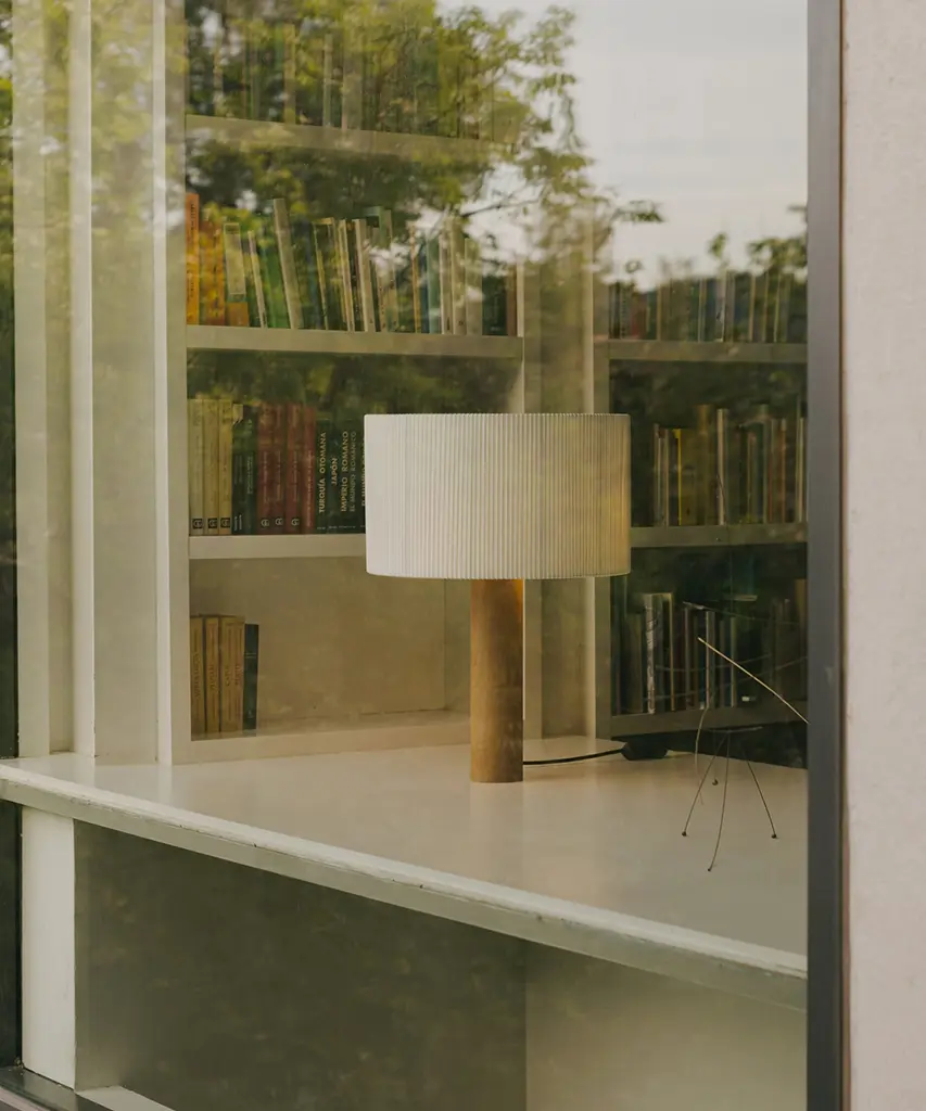 A sturdy wooden cylinder supports a head with three bulbs, surrounded by a generous circular shade. The shade is made from cotton ribbon and has a thread running along the edge, reminiscent of bookbinding, forming an asymmetry that creates a splendid contrast of light and shadow. Produced by the Barcelona-based lighting purveyor, Santa & Cole.
