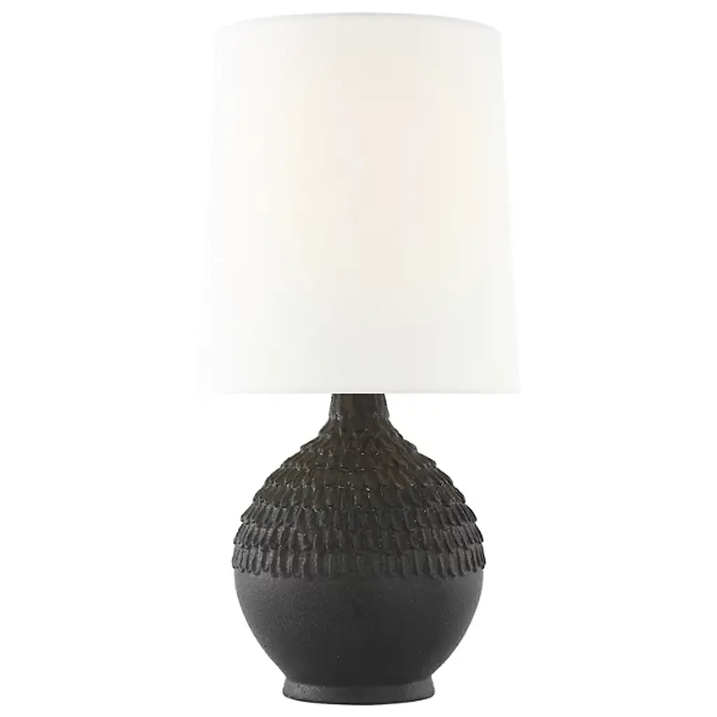 The Morava Hand-Carved Table Lamp from Visual Comfort Signature displays intricate artisanal patterns that catch the light and cast subtle shadows on surrounding surfaces. AERIN's design celebrates the tactile quality of handcrafting with its textured ceramic base that invites touch. Each carving reflects human involvement in its creation, with minute variations that distinguish it from machine-made products. The brass fittings provide a refined contrast to the ceramic's organic quality. This lamp brings artisanal character to bedside tables, consoles, or living room surfaces where its craftsmanship can be appreciated up close.