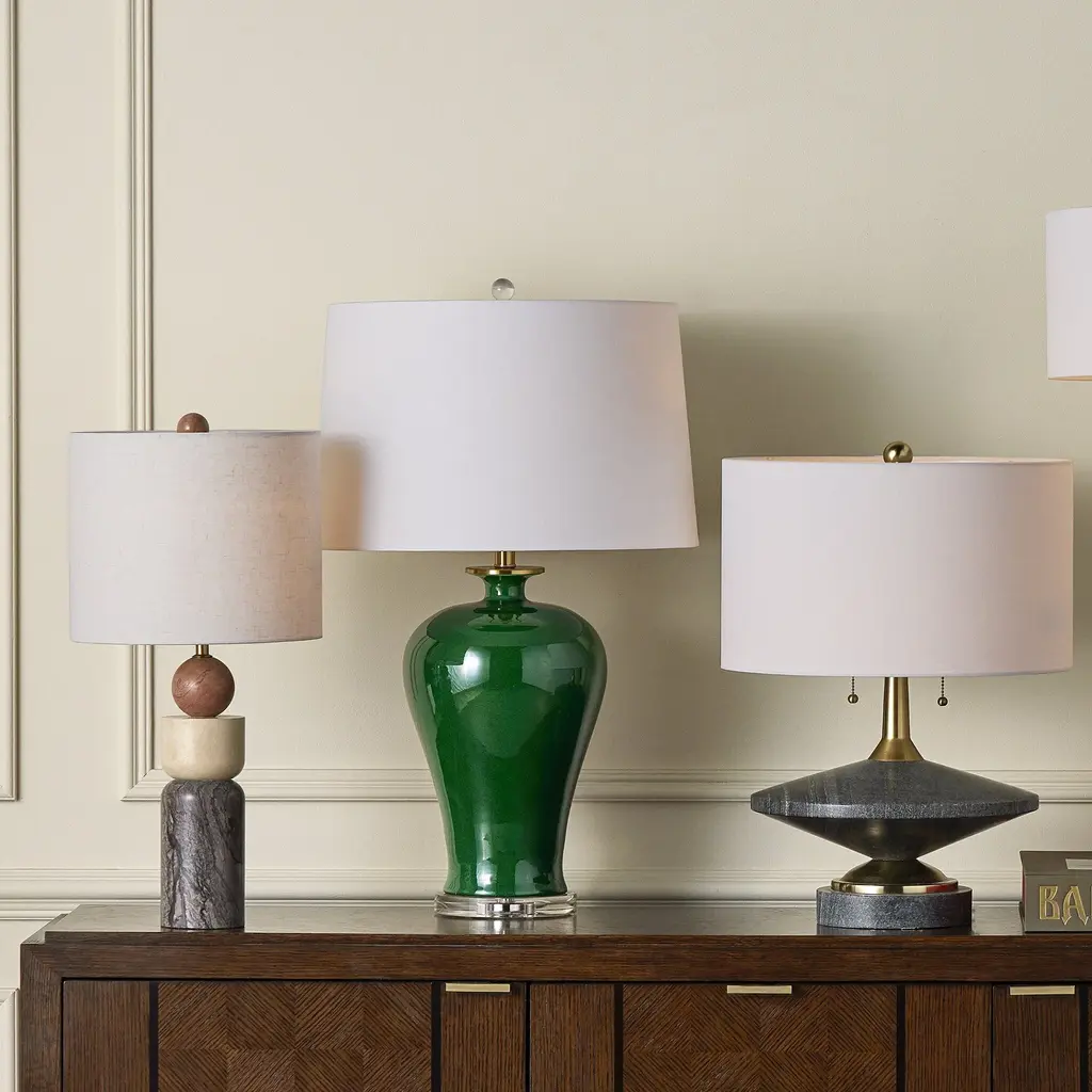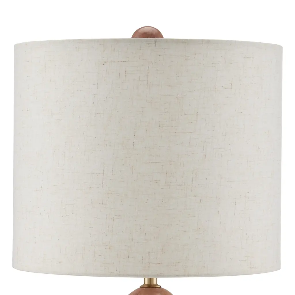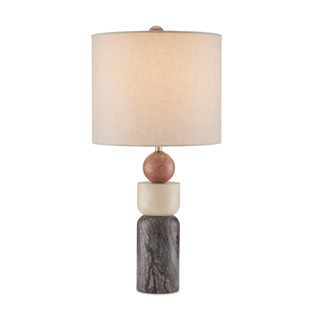 A delightfully geometric composition, the Morena Table Lamp is made of sections of Rosa Cappuccino Marble, Camello Neve Marble, and Breccia Marble. Designed by Aimee Kurzner, the multi-colored lamp is fitted with a beige poplin shade that is fastened with an orb finial, which matches the top Rosa Cappuccino marble ball. Because this contemporary lamp is made of natural stone, colors and patterns will vary. Ships In 7-10 Business Days This image is for illustrative purposes only. The colors shown are accurate within the constraints of lighting, photography, and the color accuracy of your screen.