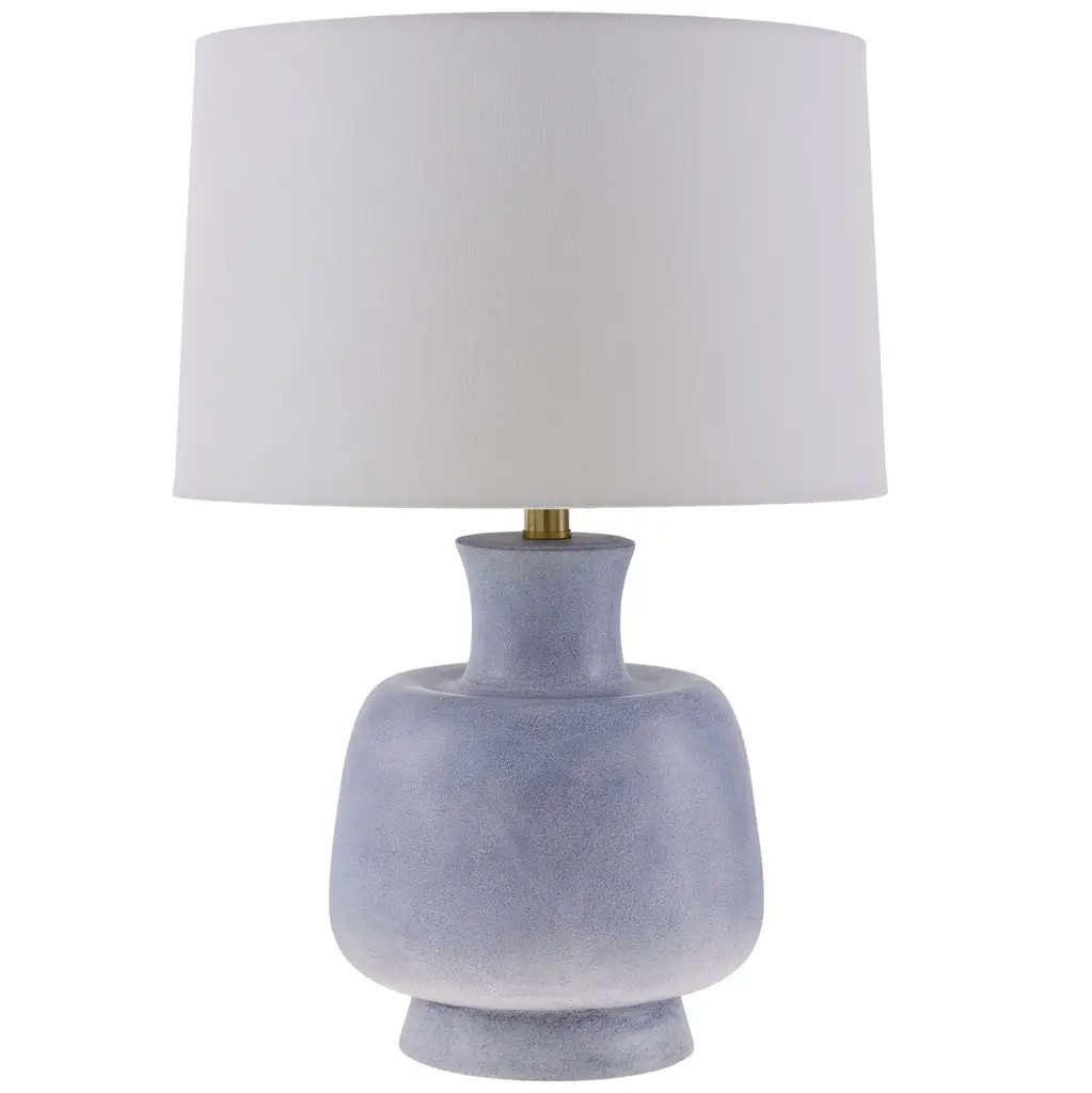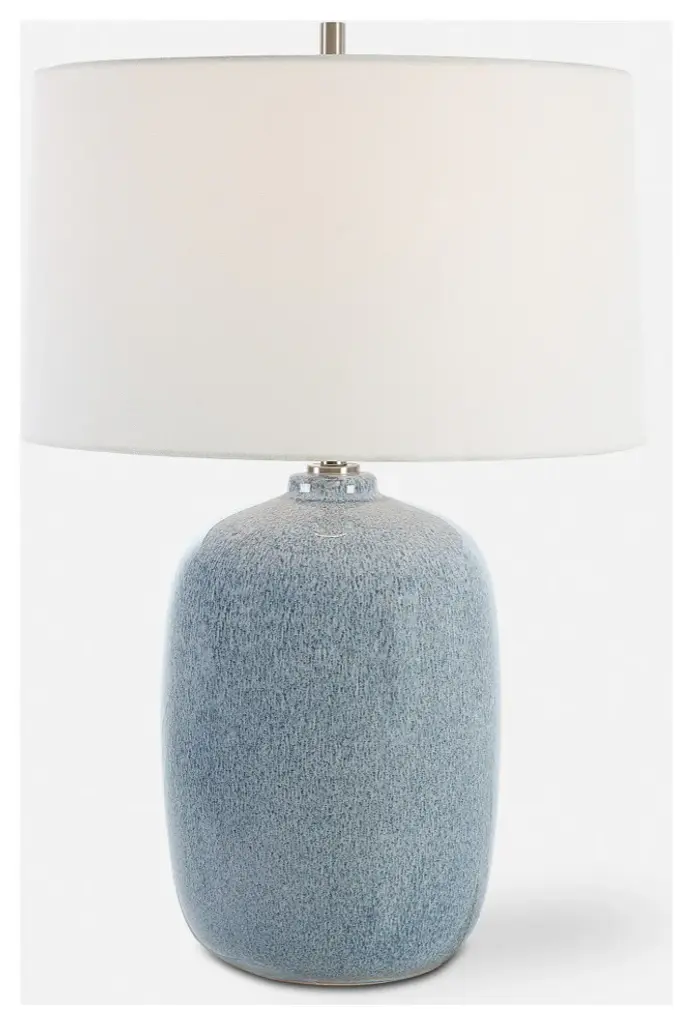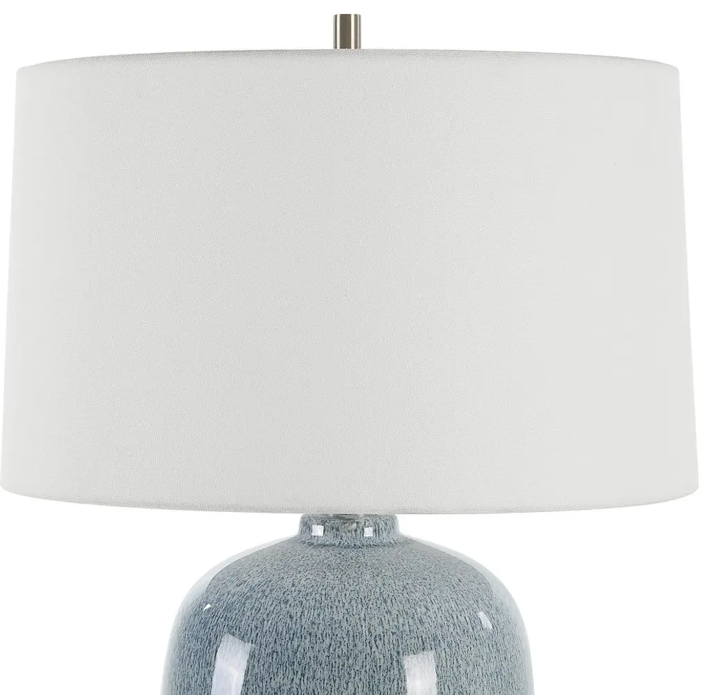 This ceramic table lamp features a peaceful sky blue glaze with cobalt mottled details paired with plated brushed nickel accents. The round hardback shade is covered in a crisp white linen fabric. Due to the nature of fired glazes on ceramic lamps, finishes will vary slightly.18"W x 18"D x 27"H. Weighs 13 lbs.Hand Finished Ceramic and Metal. Linen Fabric Shade.UL listed. Uses one max 150W Type A bulb (not included). 3 way socket switch.Heirloom Quality - Expertly hand crafted and hand finished. Due to the hand crafted nature of this piece, each piece may have subtle differences.