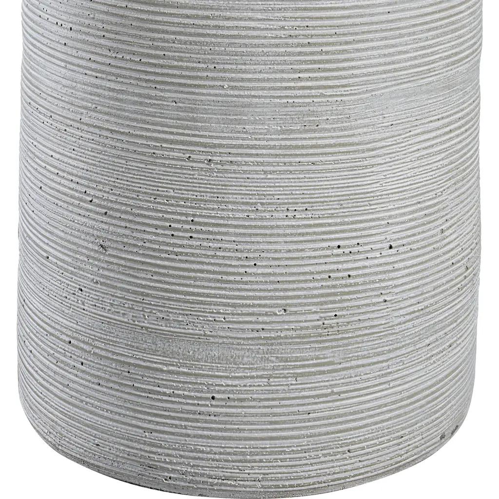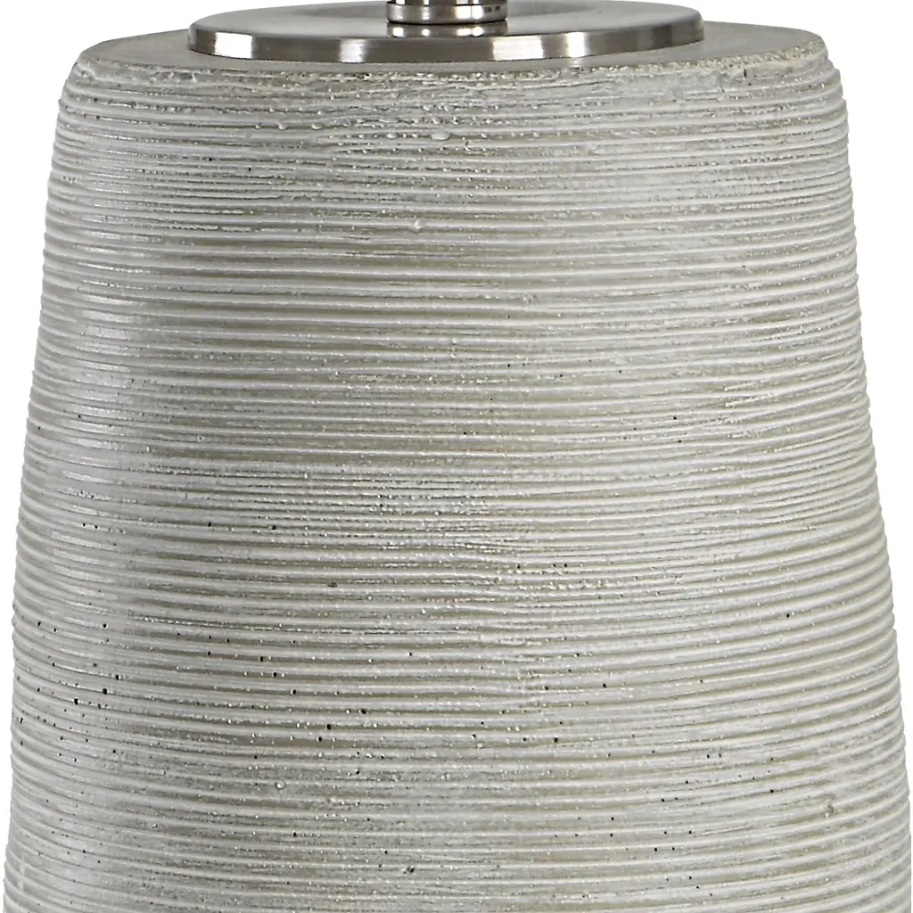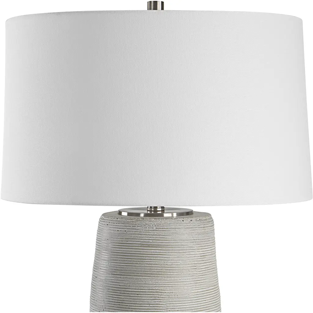 Handcrafted In An Artisanal Style, This Table Lamp Is Formed From Ceramic In Neutral Off-white And Gray Tones With Carved Ring Detailing. Steel Accents Are Finished In A Complementary Brushed Nickel. The Hardback Drum Shade Is Covered In A White Linen Fabric.