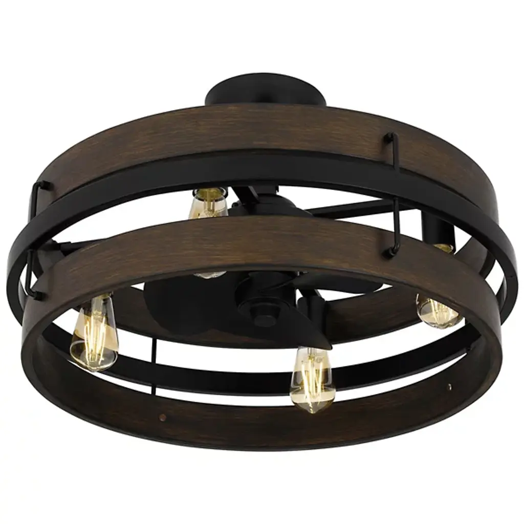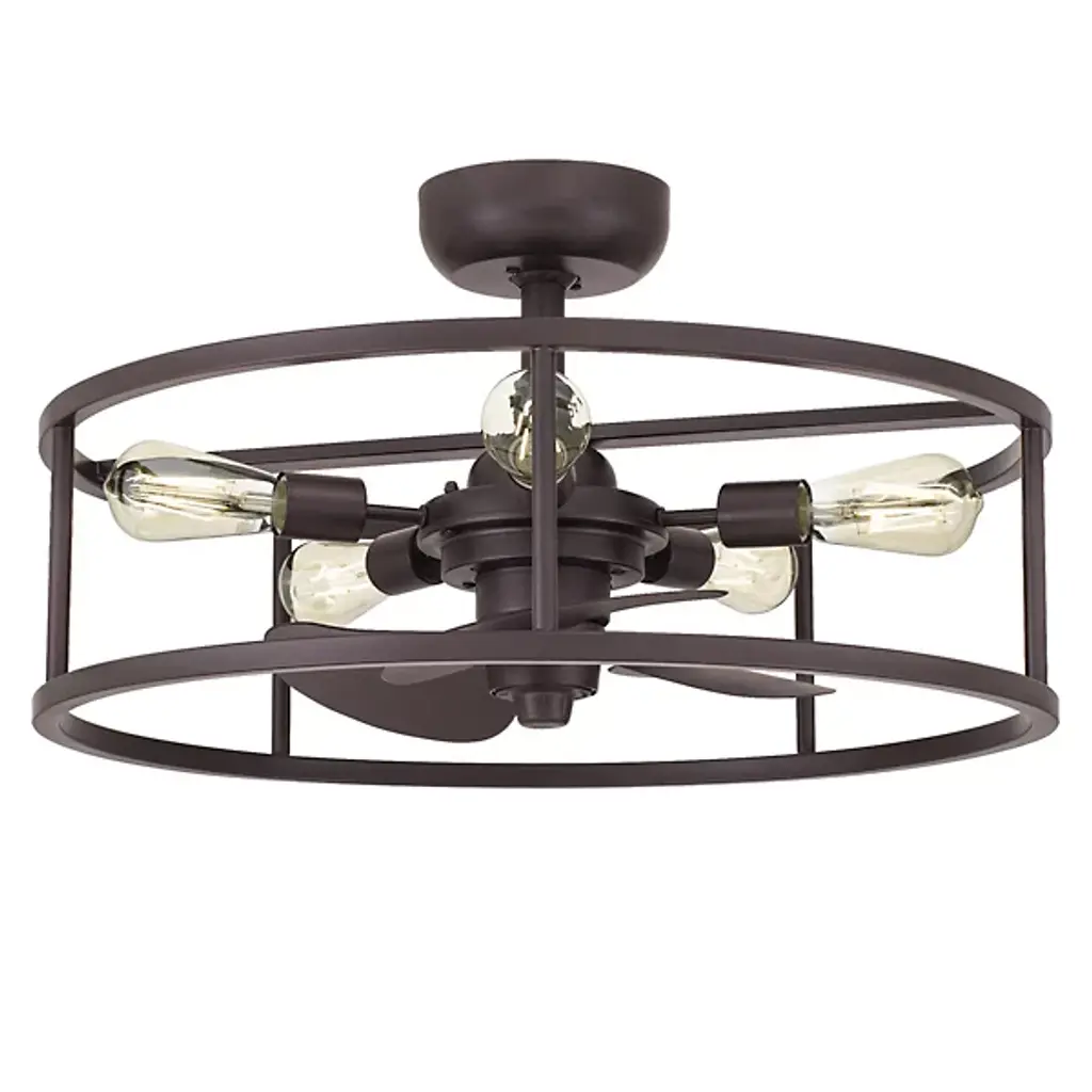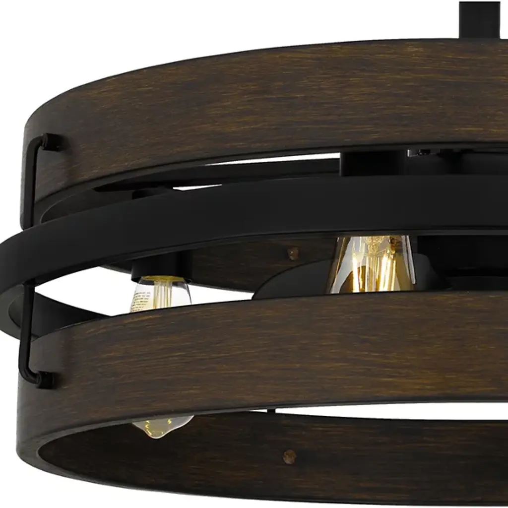 Give your spaces a cool breeze and ambient light with the Moyer Fandelier from Quoizel, a fusion of functionality and vintage aesthetics. Its transitional style leaves the lamping on partial display in a drum-shaped steel frame, with a small fan between them to add airflow. The design draws inspiration from the rich texture and grain of wood, its artistic texture bringing organic elements to its environment, providing sculptural appeal and structural impact.