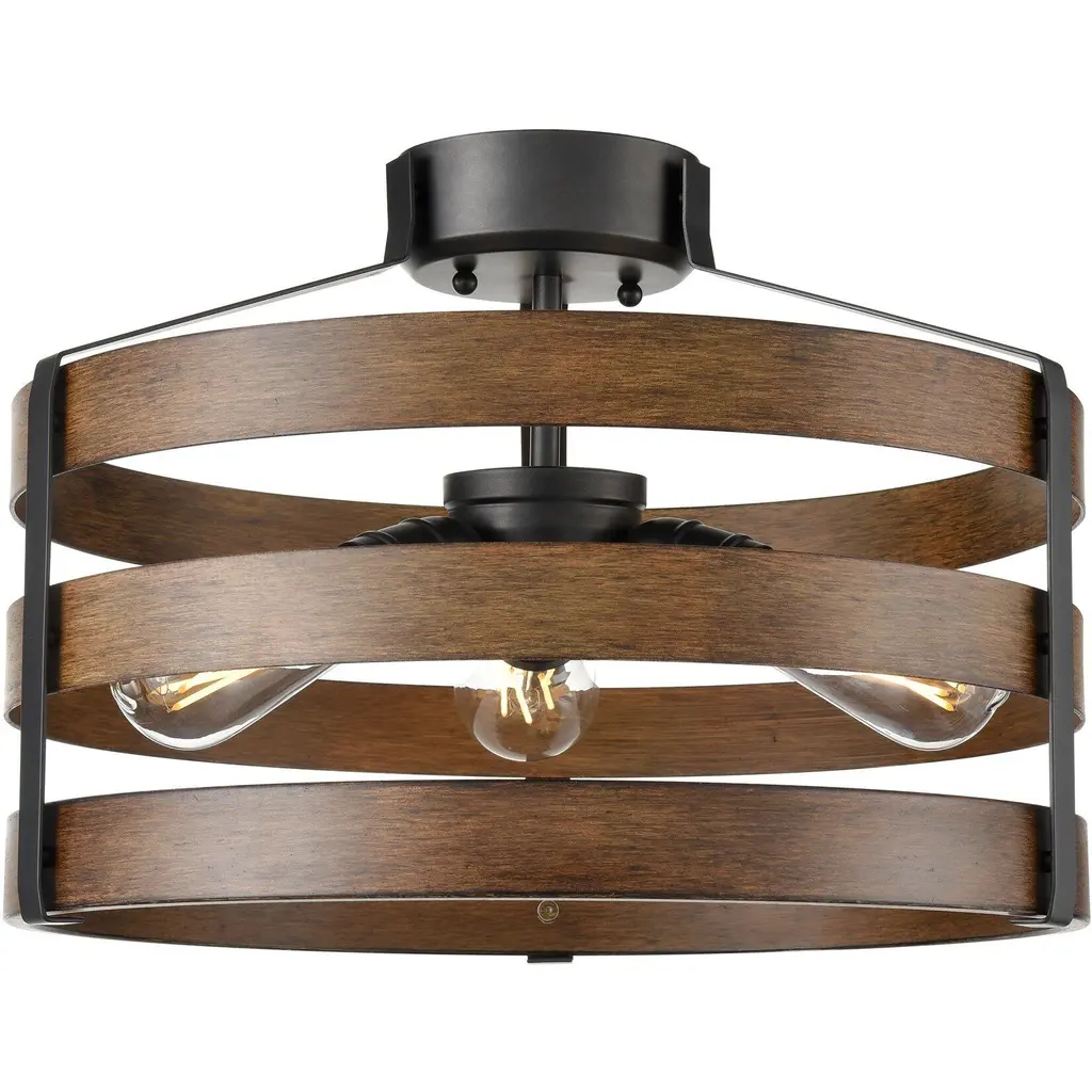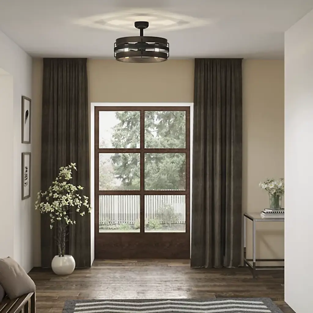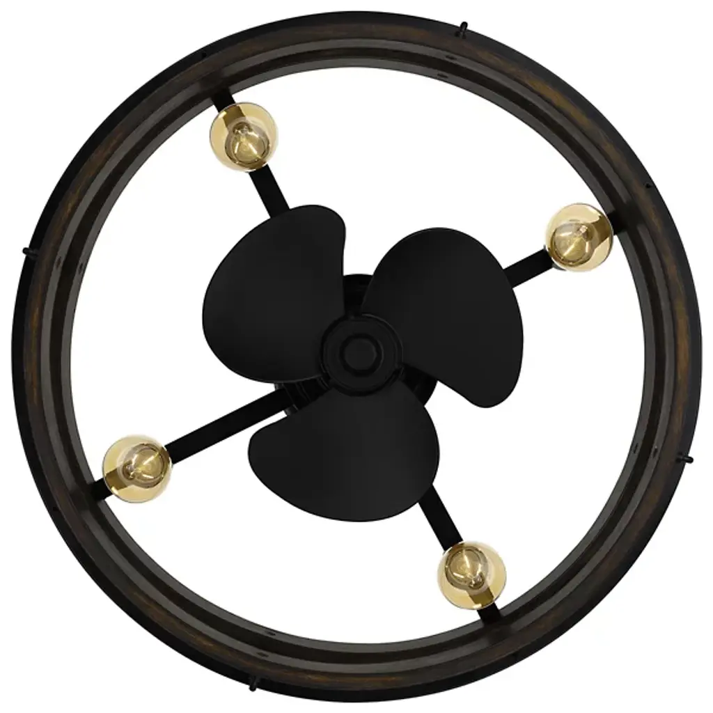 Give your spaces a cool breeze and ambient light with the Moyer Fandelier from Quoizel, a fusion of functionality and vintage aesthetics. Its transitional style leaves the lamping on partial display in a drum-shaped steel frame, with a small fan between them to add airflow. The design draws inspiration from the rich texture and grain of wood, its artistic texture bringing organic elements to its environment, providing sculptural appeal and structural impact.