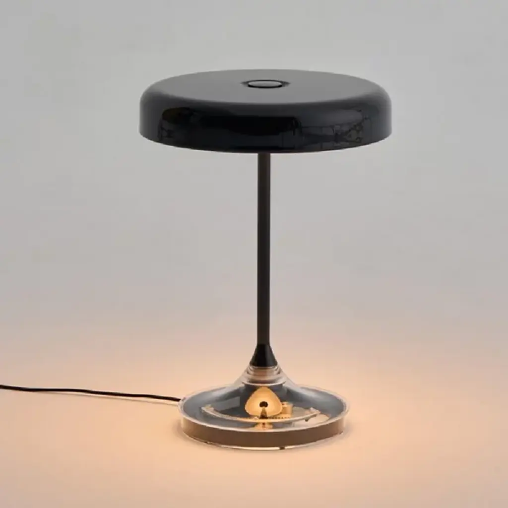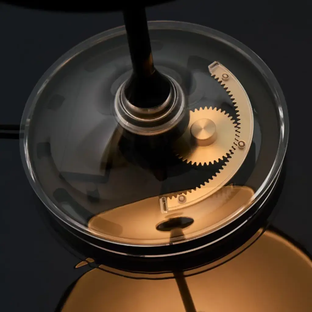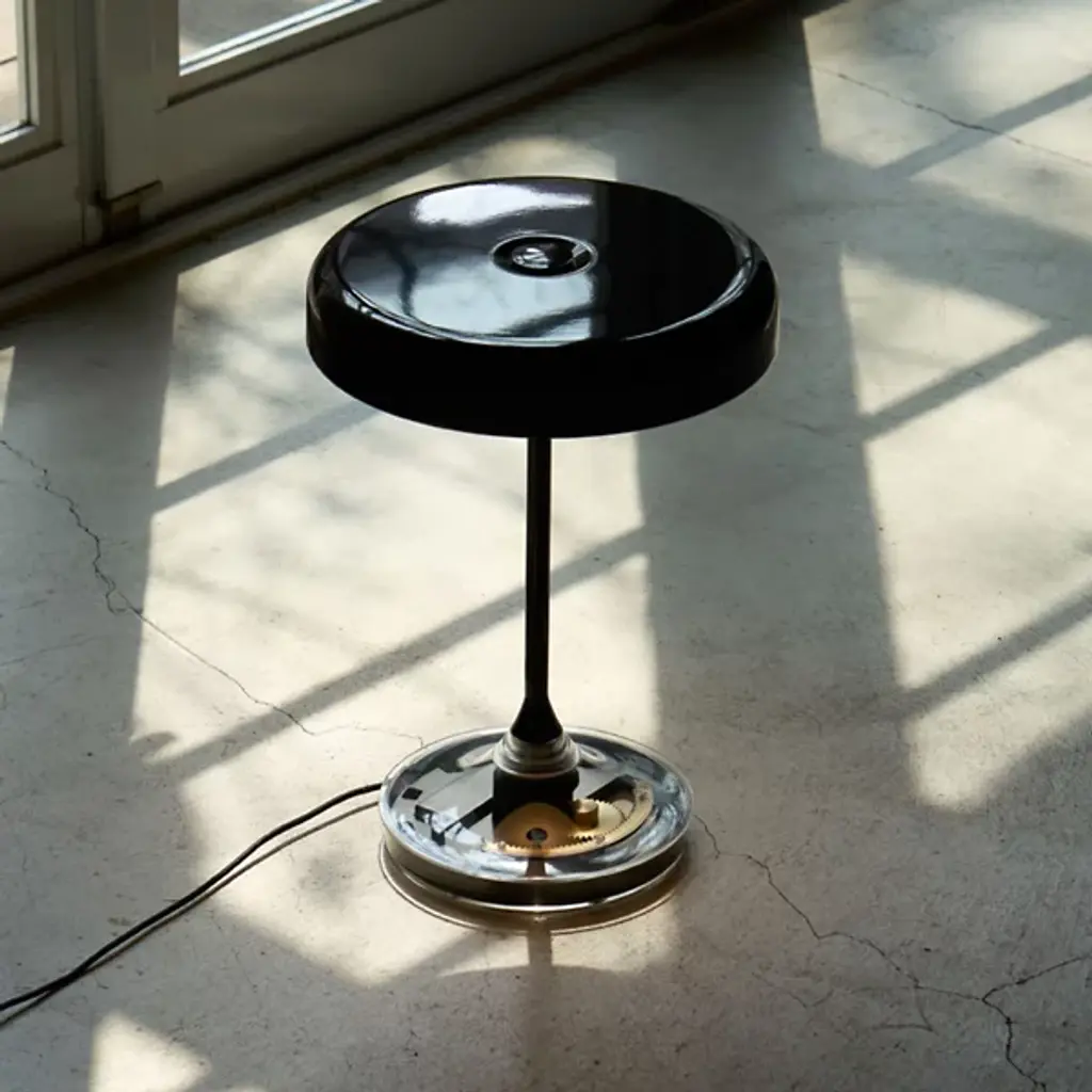 The Mr. DJ LED Table Lamp from Seed Design brings a playful yet sophisticated touch to any surface it's set on. This lamp replaces traditional switches with a dynamic design, featuring a rotating base to turn on and geared clockwork visible for adjusting the brightness. The translucent base shows off intricate, genuine brass gears reminiscent of a precision clock. Constructed from PMMA, brass, and steel, it merges modern innovation with mid-century modern charm, creating something that is at once functional and visually captivating.