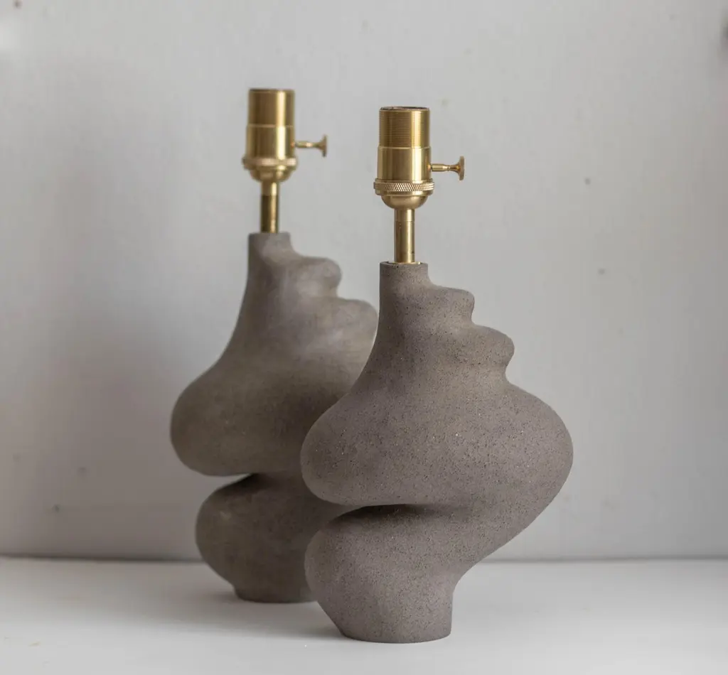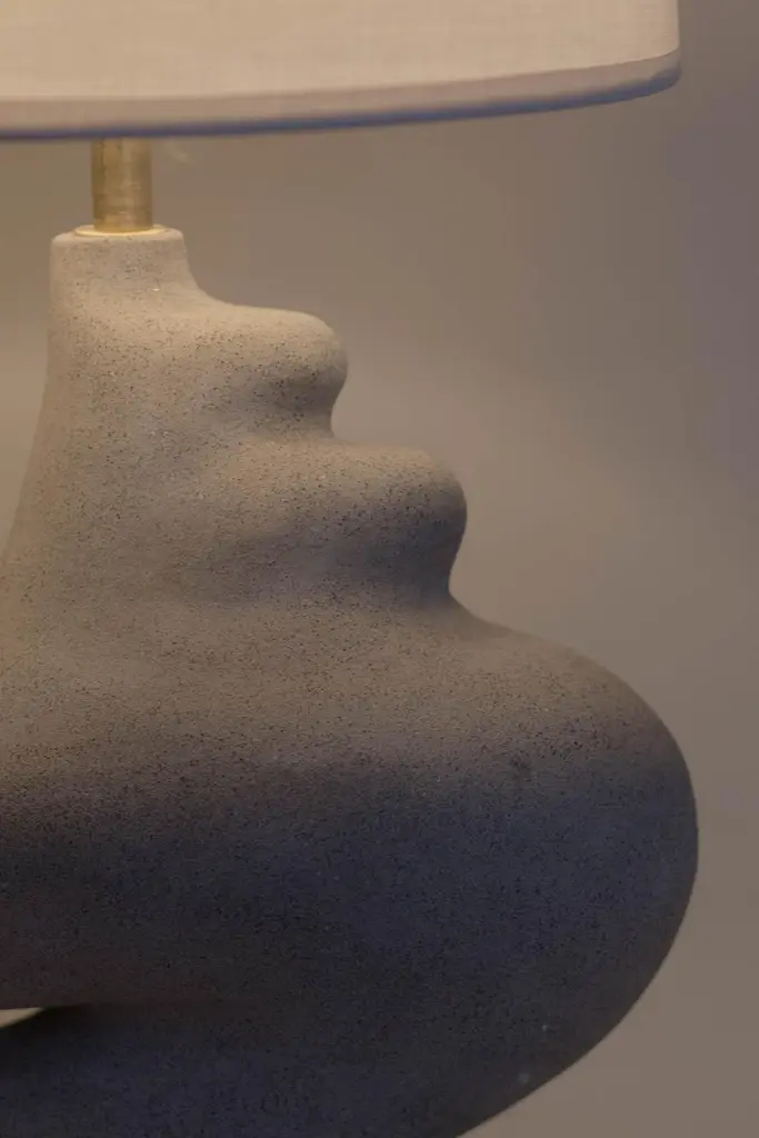 Muf lamp by Aysun AyDimensions: D 20 x H 44Materials: stoneware ceramic, brass hardware, cotton drum, CE certified twisted cable, non-slip bottom soleSculptural pieces can vary slightly as each is a unique piece of art.All our lamps can be wired according to each country. If sold to the USA it will be wired for the USA for instance. Muf lamp is made from with stoneware clay using hand building techniques. Only natural textured clay is used.Aysun Ay (1995) is a designer living in Istanbul. She works with stoneware clay bodies using hand building techniques. Having an architectural background, Aysun explores for the conceptual relationship between body and environment through material, function, light and color. She focuses on asymmetrical and curvy forms and their energy in her works.
