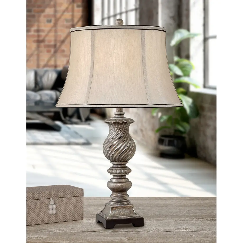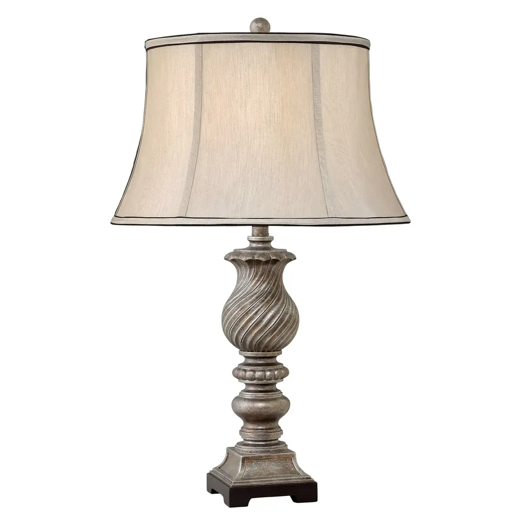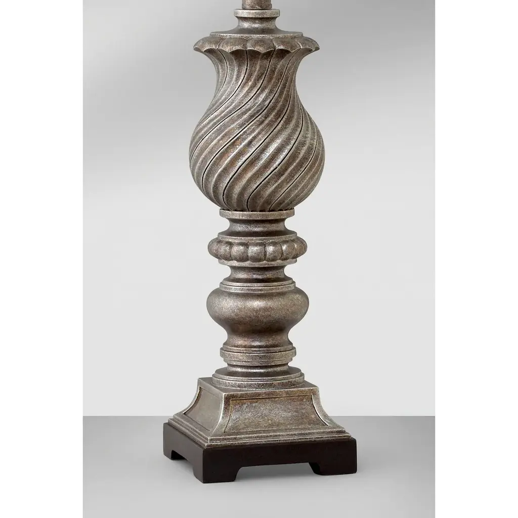 This is a traditional table lamp that features a striking aged silver with black Finish. It is constructed from handcast & sanded resin, painted and antiqued by hand. This unique lamp is a sure conversation piece in any room!Specifications:
