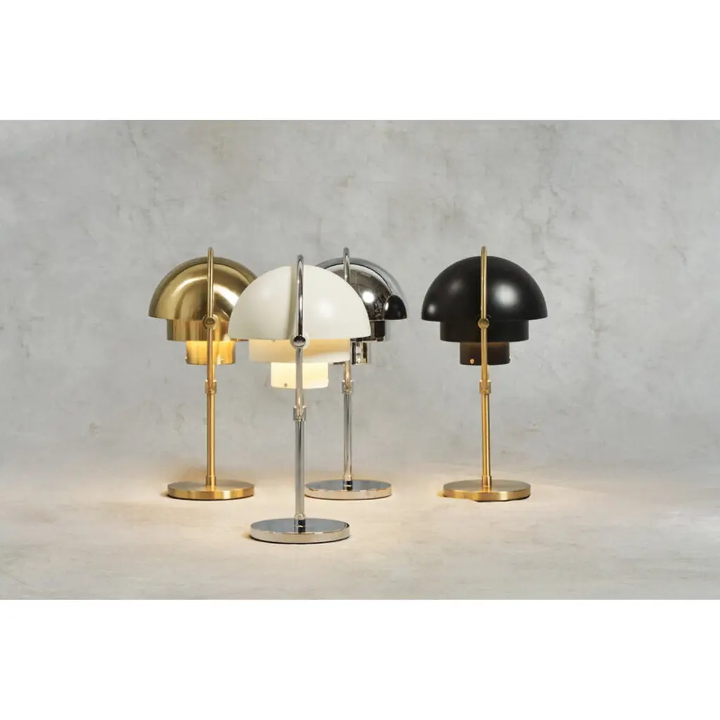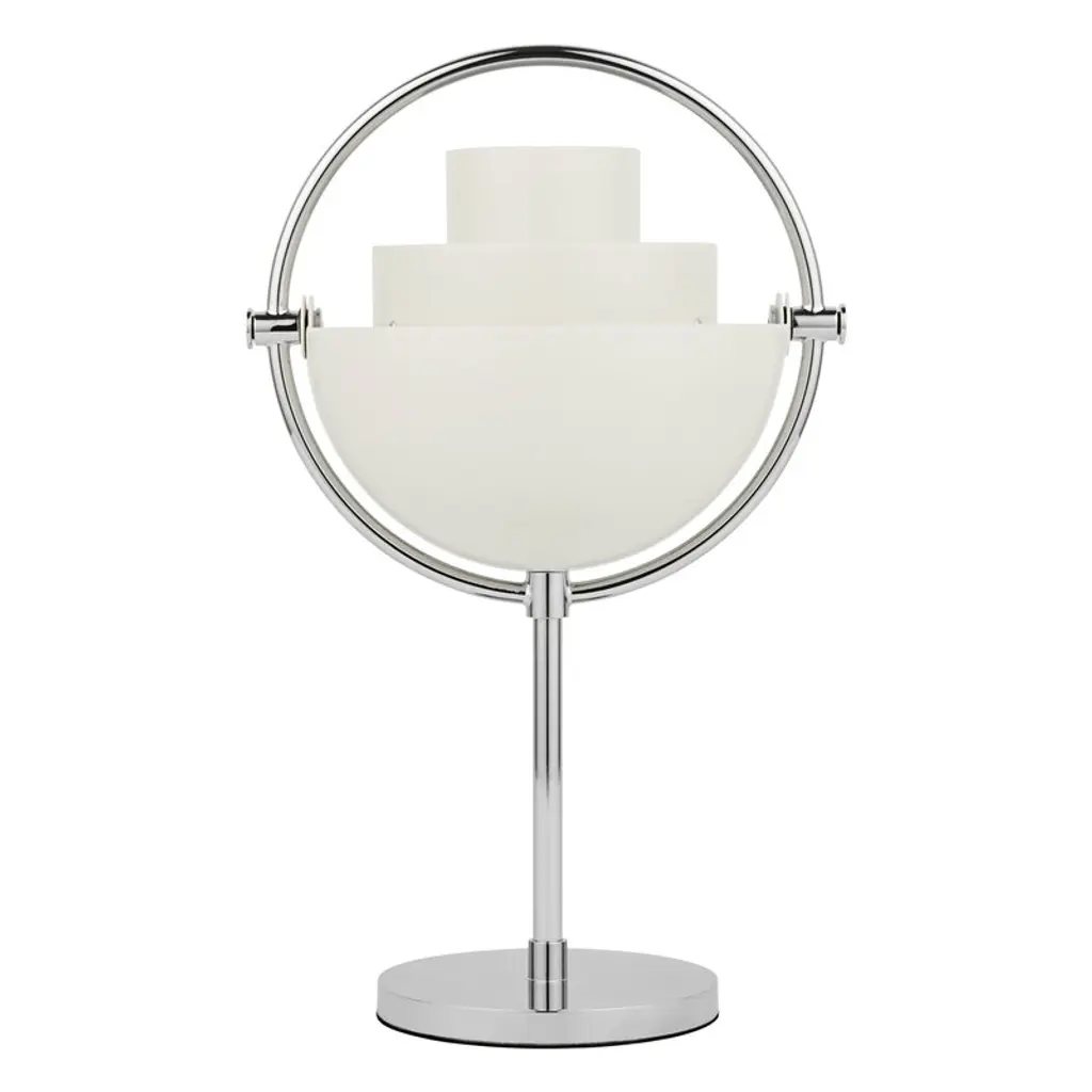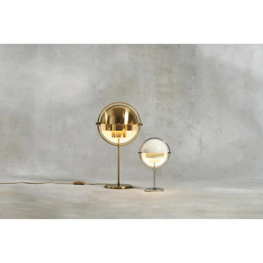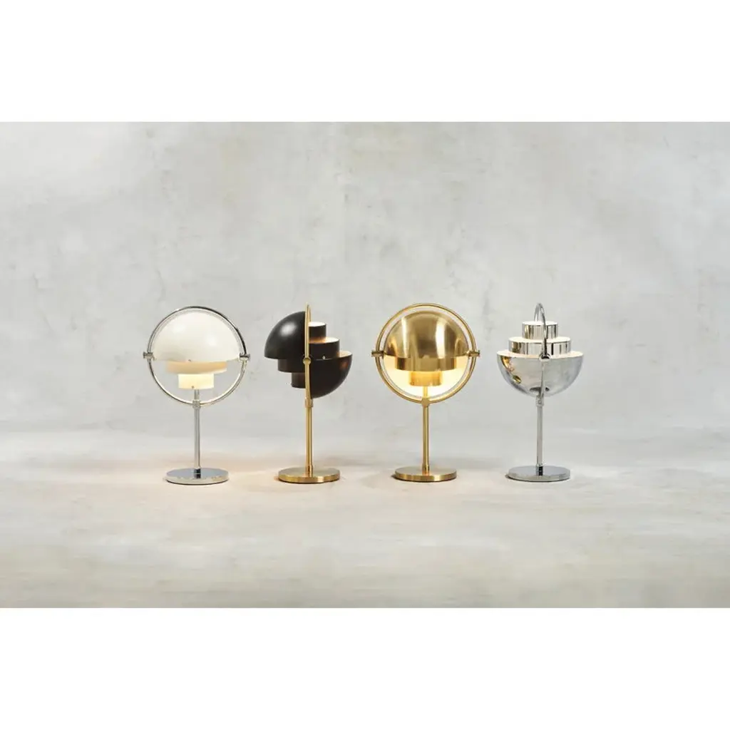 GUBI's portable Multi-Lite is a cordless version of a beloved table lamp, designed by Louis Weisdorf in 1972, playing with elegant geometric shapes. As its name suggests, the lamp has multiple uses and configurations: by rotating the two shades around the cylindrical middle light can be cast up, down and to the sides. Manufactured originally by Danish Lyfa, Multi-Lite features a timeless and sculptural metal design that makes a bold addition to many kinds of interiors. The wireless table lamp provides light at full setting for up to six hours.