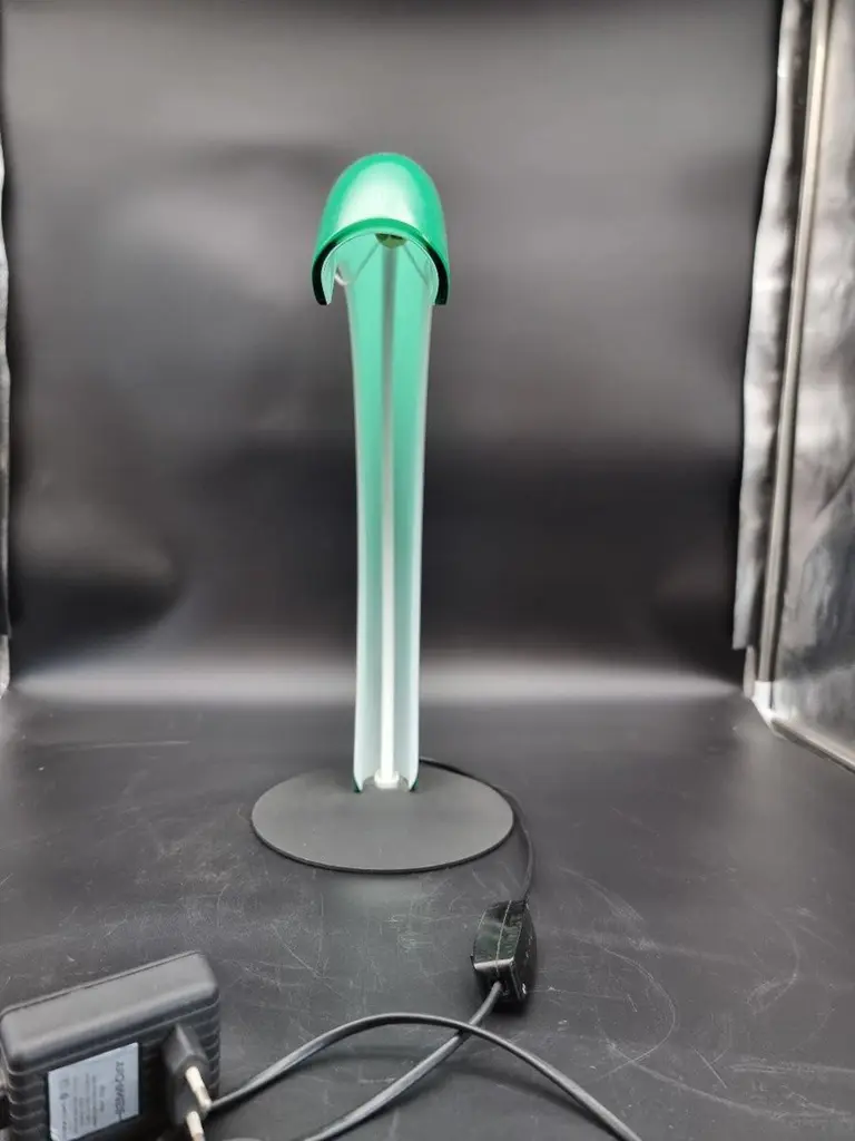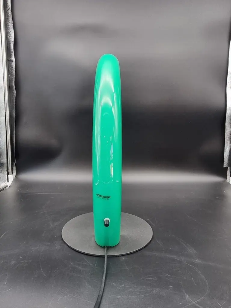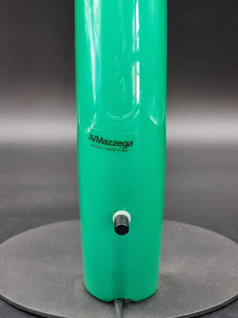 Blown glass table lamp prodoBlown glass table lamp produced by A.V. Mazzega, made in Italy around the 1980s. The model, known as "Mudguard," features an arched Murano glass structure with a white opaline inner diffuser and green glass outer part. The base is made of black painted metal, while the electric cable, original from the period, is still present and fully functional. The marking "AV Mazzega" is visible on the back. Balanced proportions: height 41 cm, overall length 47 cm. Authentic object of Italian design of the second half of the twentieth century, suitable for modern or collectible environments. Contact us for more information. Worldwide shipping.