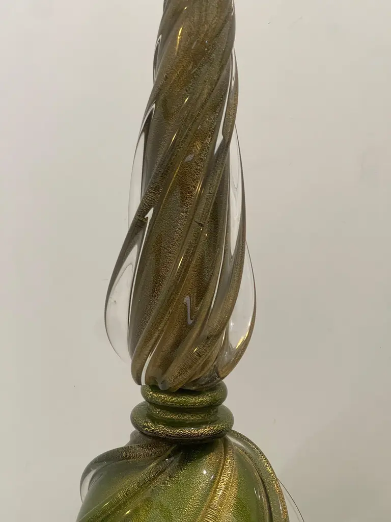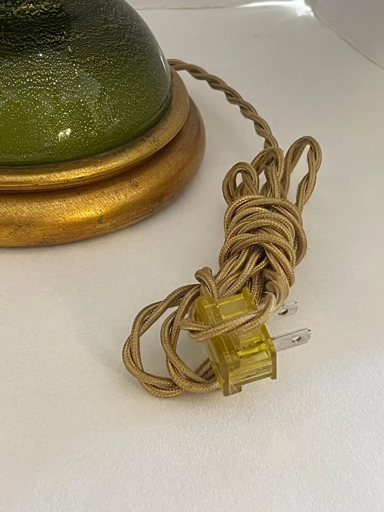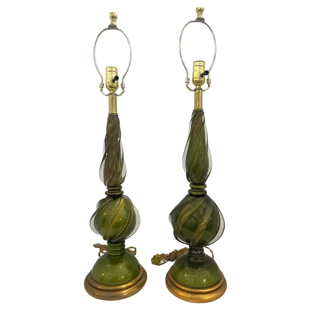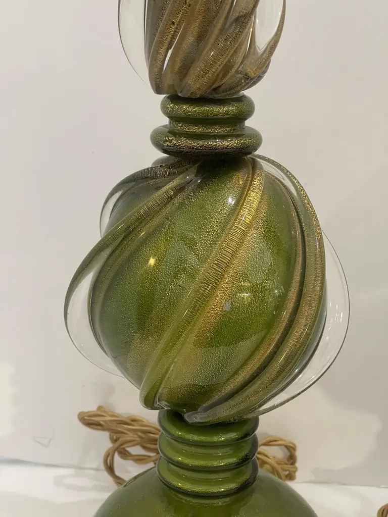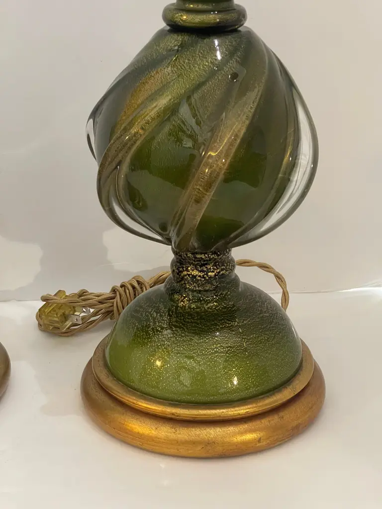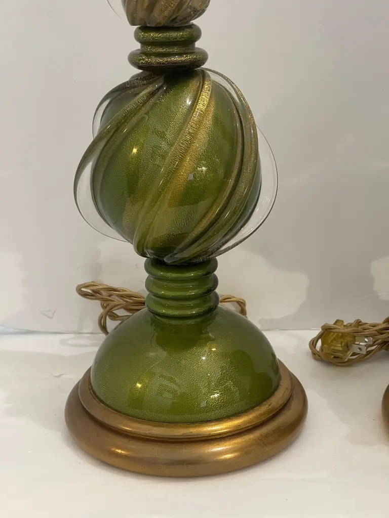 Just in this wonderful pair of Murano Glass Table Lamps in Green & Gold Flecks on Gilt Wood Base,.This pair has a mouth blown Twisted bulbous bottom and a twisted candle like top.The color is Green with Gold flecks through out. these lamps stand on Gult wood round bases.New corded wiring to both.Total height to finial is 31"Very good vintage condition, consistent with age and use, no chips or repair