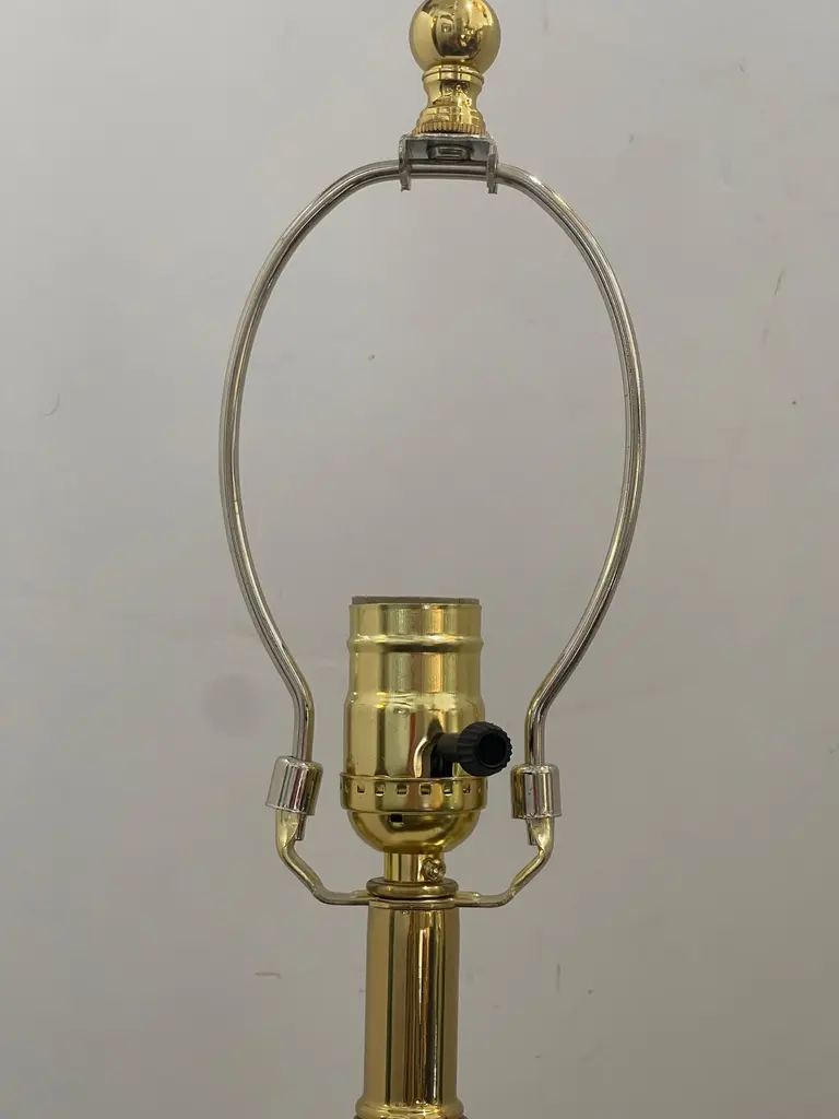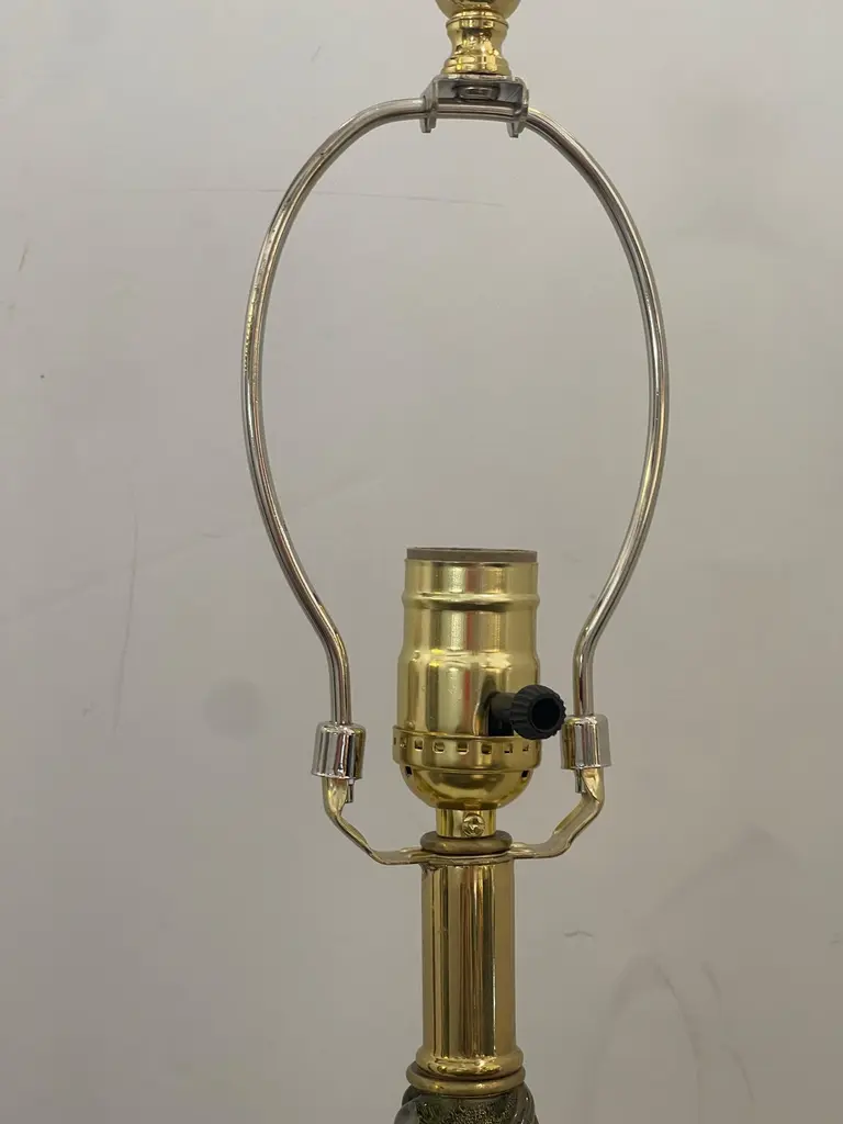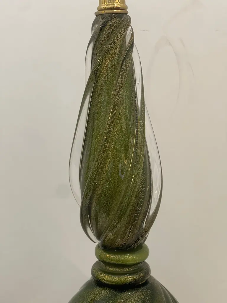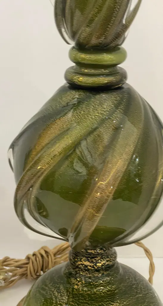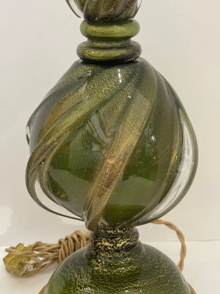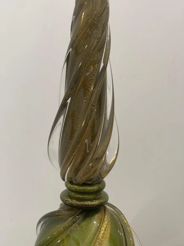Just in this wonderful pair of Murano Glass Table Lamps in Green & Gold Flecks on Gilt Wood Base,.This pair has a mouth blown Twisted bulbous bottom and a twisted candle like top.The color is Green with Gold flecks through out. these lamps stand on Gult wood round bases.New corded wiring to both.Total height to finial is 31"Very good vintage condition, consistent with age and use, no chips or repair