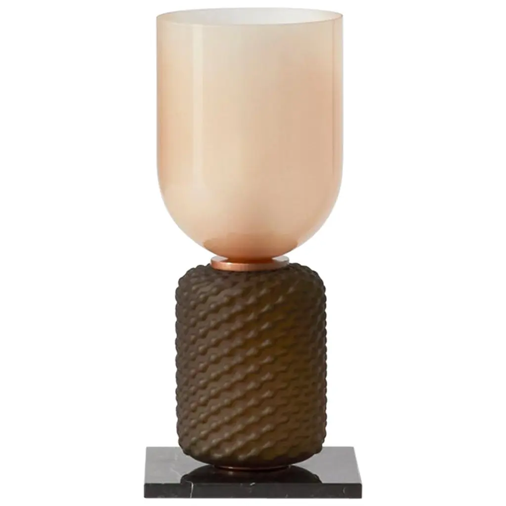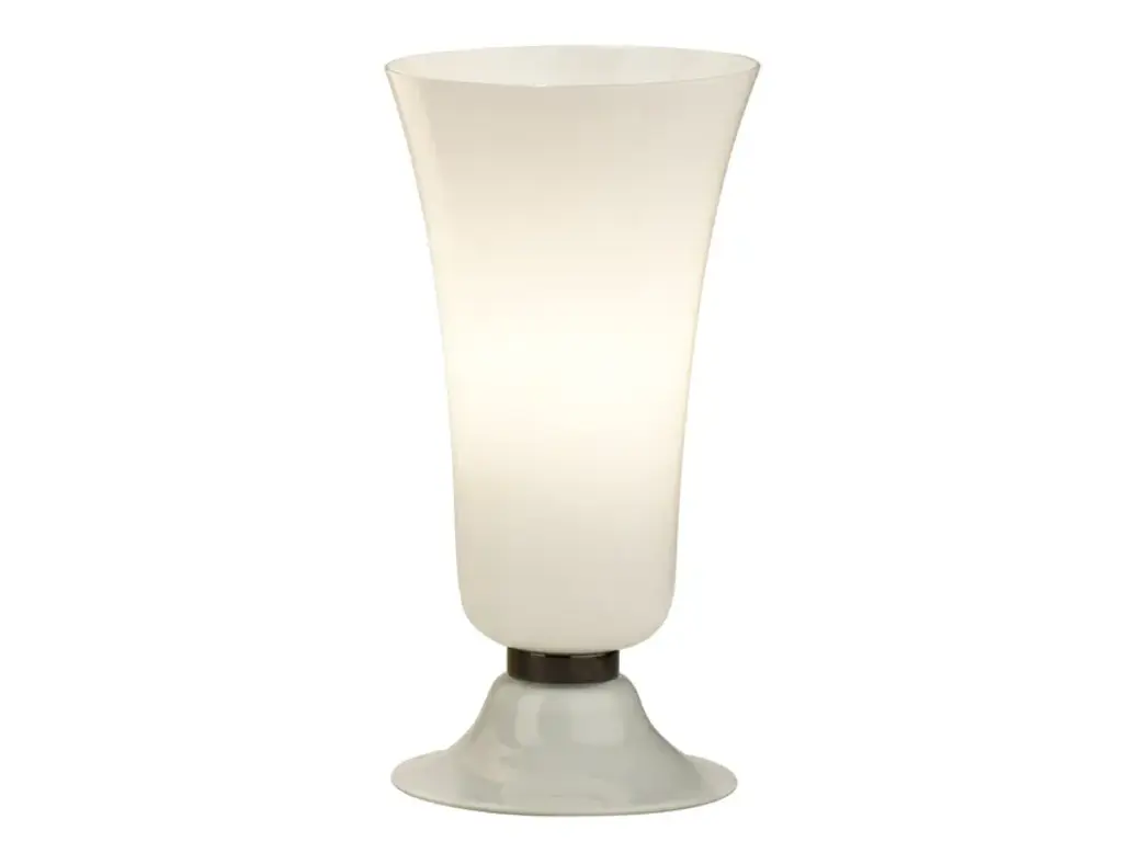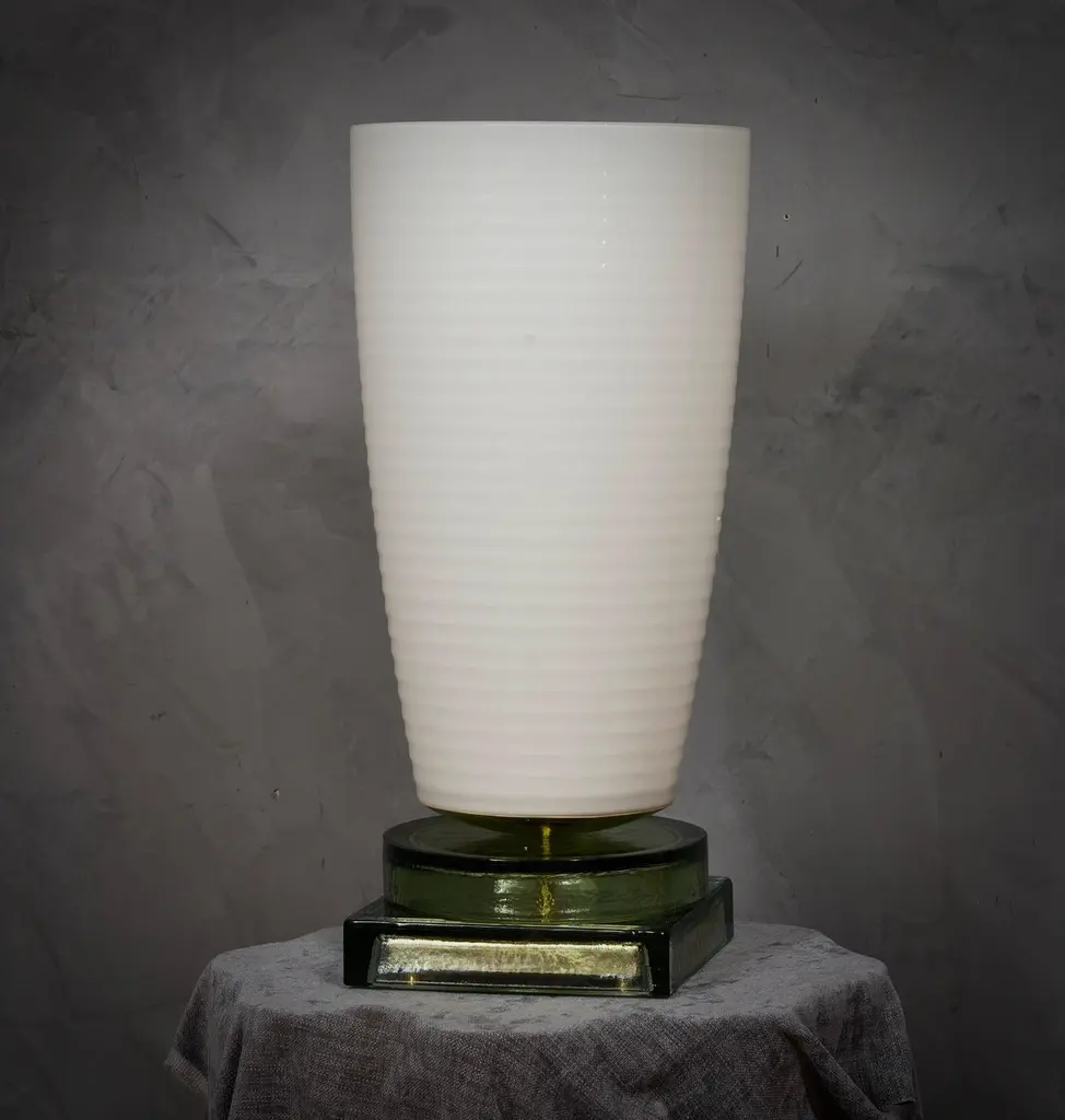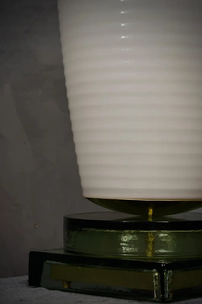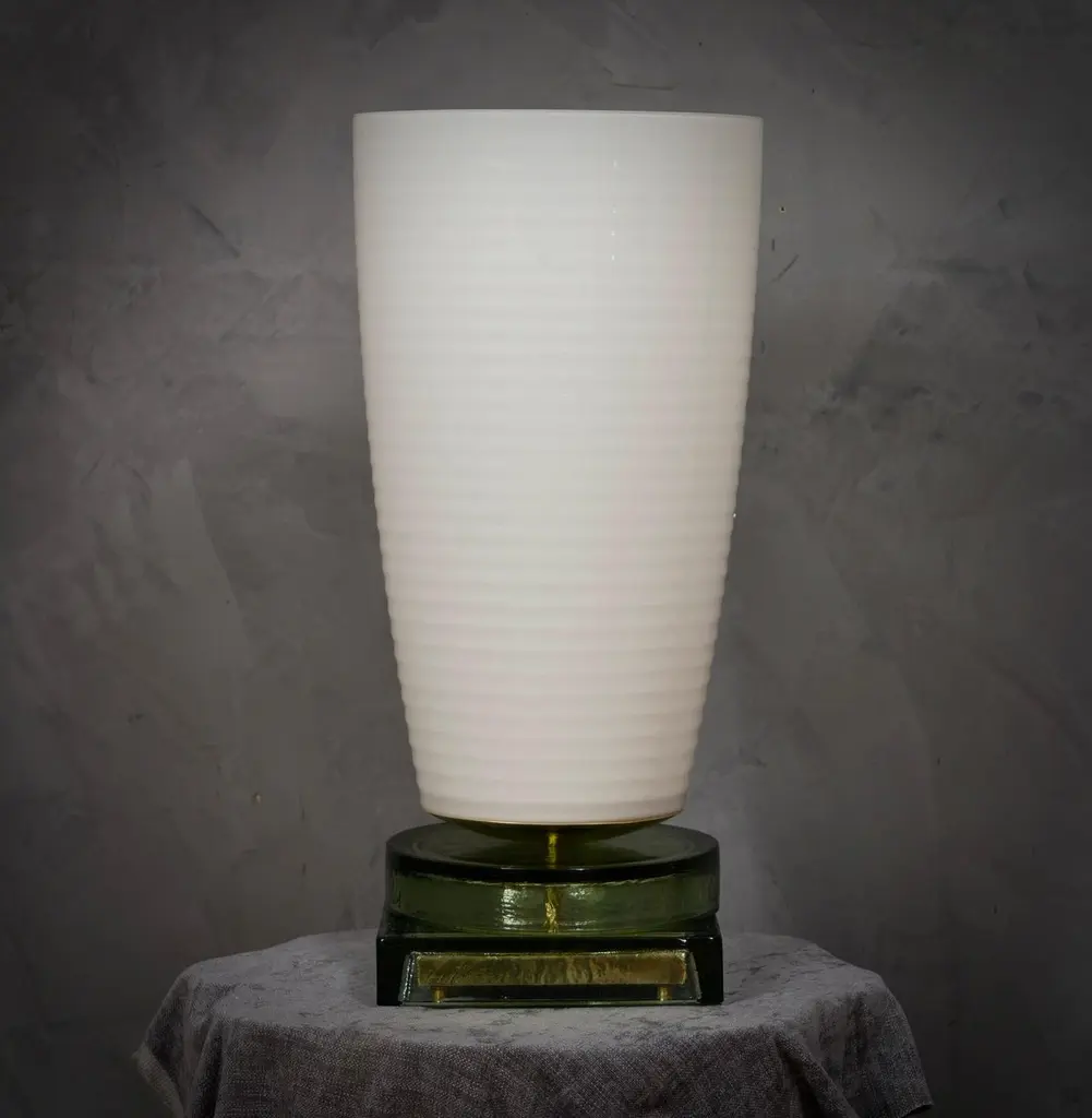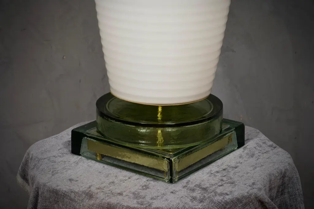 Precious and unique hand-blown Murano white glass, classic but original design with a strong contrast between the large white vase and the transparent glass base.The lamp is characterized by a large white vase with a slightly flared shape, with horizontal workings that accompany the whole size of the cup from the bottom to the top. The large white cup is precisely the characteristic of the lamp, which is then placed on a brass disc. Still under the brass disc there is a beautiful base also in transparent Murano glass, with a very particular shape as you can see in the photo. Refinement and style as it is in the style of Vistosi, one-of-a-kind pieces and pieces that always remain precious. When turned on, the lamp is very bright having a bulb with a large lamp holder, it will perfectly illuminate your home.