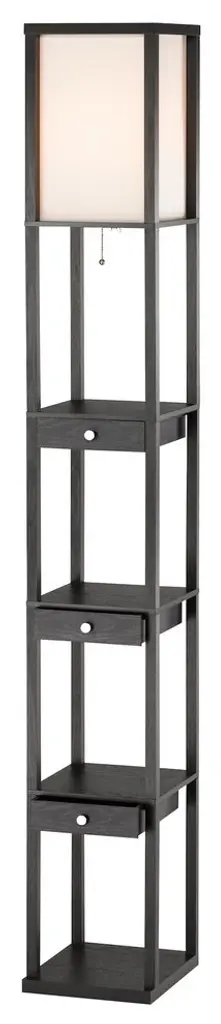 A grand-scale shelf lamp offers three drawers for storage. This open-box frame has an off-white collapsible poly-cotton shade. Chrome-finished metal drawer knobs. The bottom and three additional shelves provide four storage/display spaces, and the 2.25" deep drawers beneath each shelf add extra room for storing small items. Black MDF veneer constructionBall-accented On-off pull-chain switch150-watt incandescent or equivalent CFL bulbMeasures: 72.5" height, 10.5" squareClearance between each shelf: 11.5" Clearance from top shelf to shade: 13.75" Base: 10.5" width, 11.25" depth Plastic drawers: 2.25" height Inside dimensions: 7.75" width, 10" depthBulbs not included