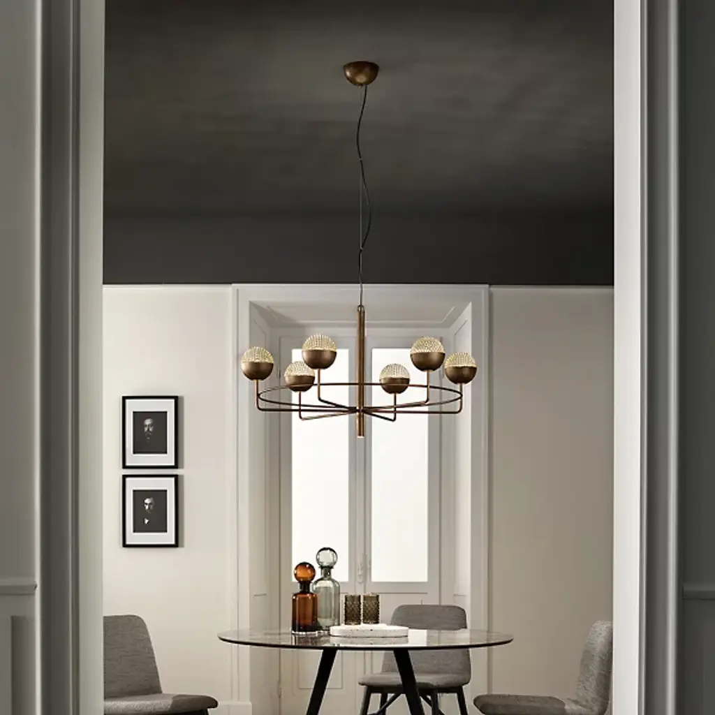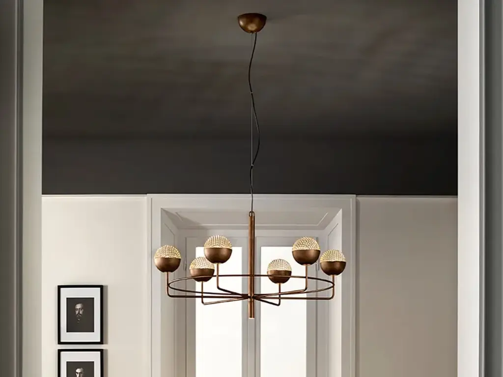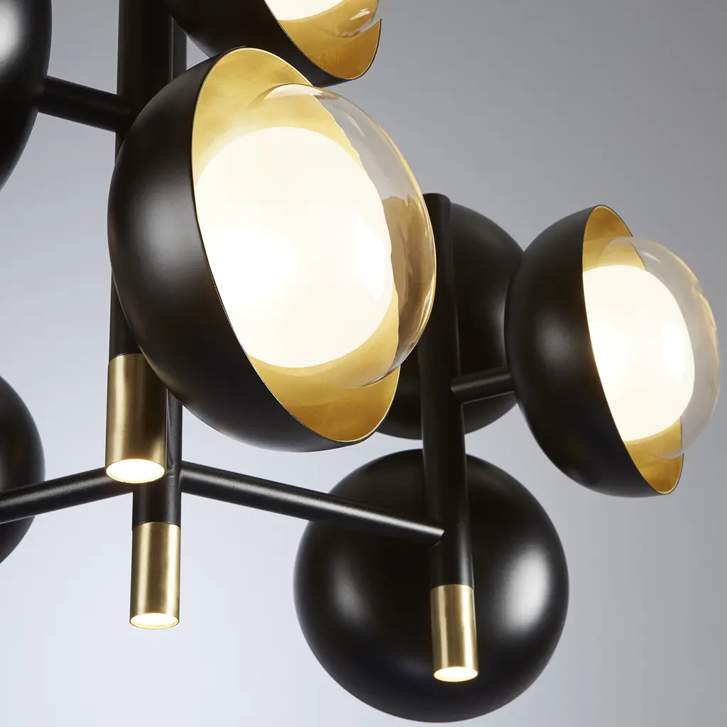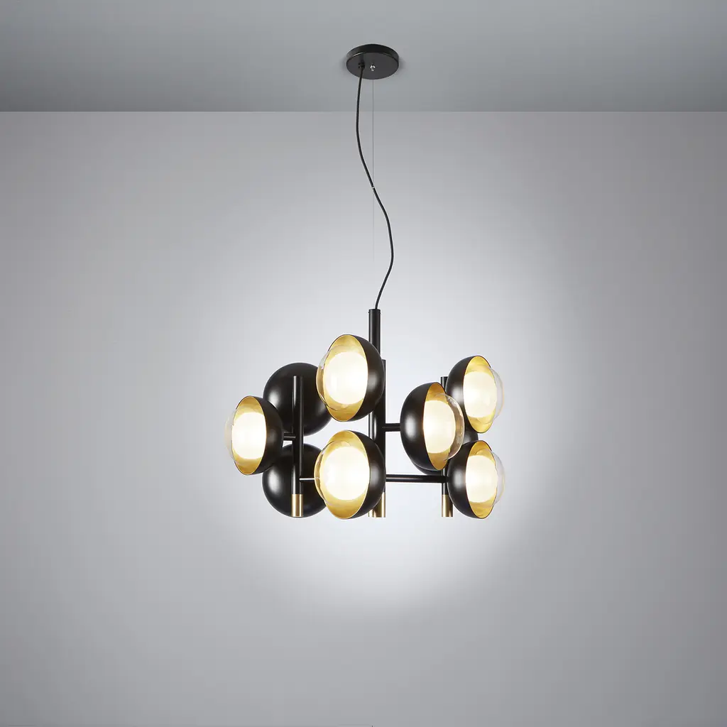 Collection of neo-vintage metal lamps with a double-sided diffuser in borosilicate glass. The metal domes (one internal and the other one external) have the internal side with different colors or finishing: they can be painted or finished in polished brass and bright copper, thus to create different textural combinations. The collection presents hanging lamps, floor lamp, table lamp, wall and ceiling. The hanging and wall lamp version are provided with a further G9 source located in the lower part of the lamp.
