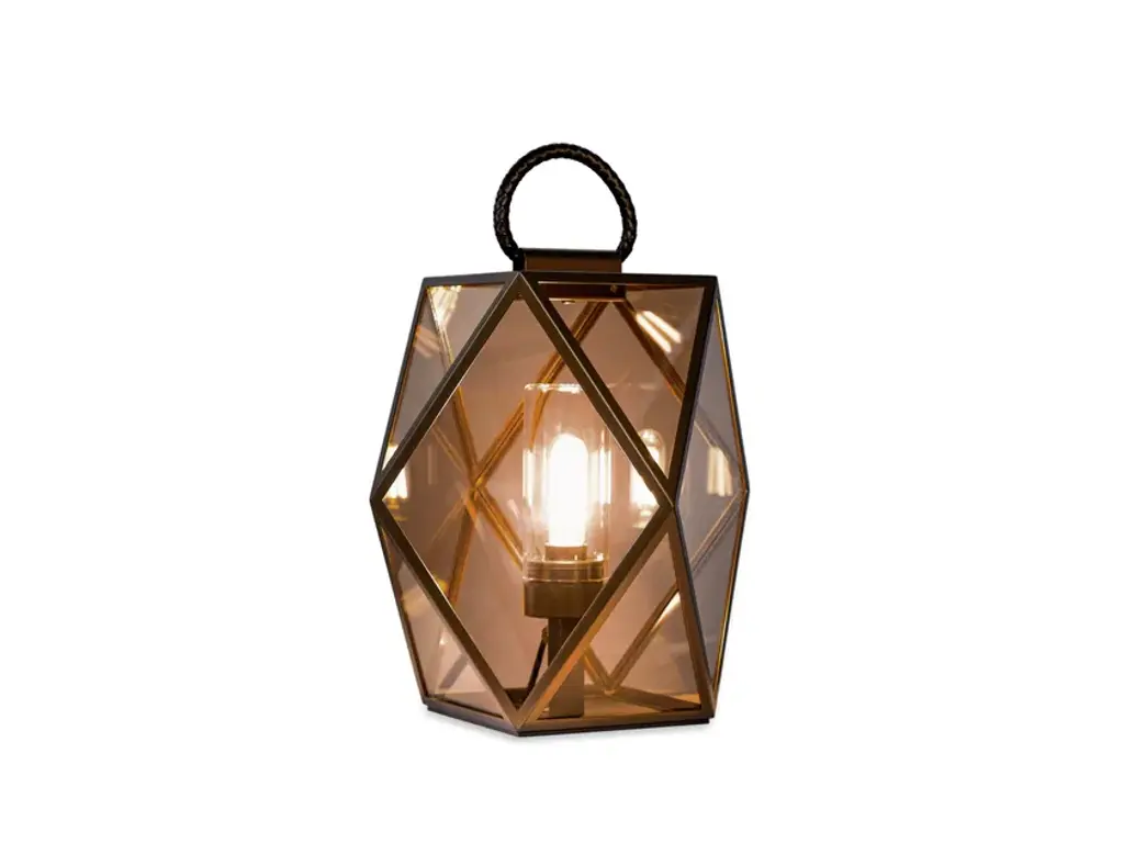 Muse Lantern Outdoor is a lantern for outdoor use, available in 2 sizes.Light source1 X T8 E27Tubular LED bulbip65An iconic Contardi product, Muse Lantern is a lantern with an original and precious design thanks to sophisticated details such as the honey-coloured braided silk handle, the satin bronze finish and the vintage-look structure. The free standing version is available in three different sizes (small, medium and large) to adapt to any environment. The suspension has instead an elegant touch given by the metal chain with rings combined with the silk rope.Muse Lantern Outdoor can be battery-powered or wired. In the wired version the light source is placed inside a glasscylinder that is suitably sealed to guarantee IP65 protection. For the battery-powered version, a particularly interestingsolution has been created: reproducing the shape of a light bulb in engraved plexiglass that, stimulated by a LED sourcehidden in the internal part of the structure, seems to emanate its own light. The bronze finish of Muse Lantern hasobviously been treated to resist in outdoor spaces and weathering, with a braided leather handle. The plastic diffuser in the Lantern version keep the transparent amber finish.