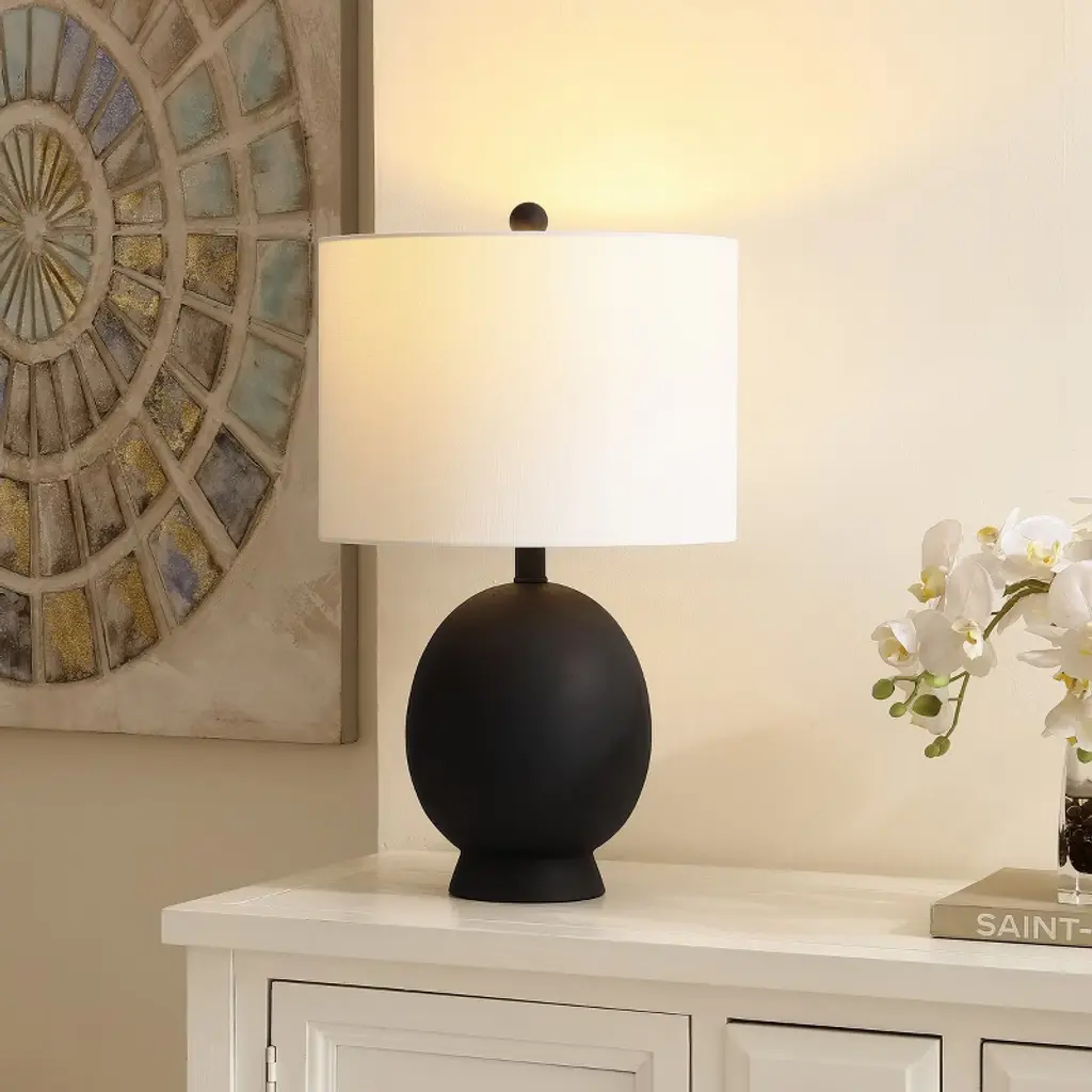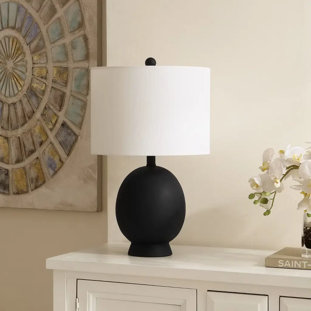 Introducing the Muse 20.5 inch black resin table lamp, a blend of style and functionality that fits beautifully in your space. The elegant black finish of the resin base adds a contemporary touch, while the cotton shade ensures a gentle and warm light. Designed with quality resin and sturdy iron, this lamp stands as a reliable companion for any room. Its compact size makes it versatile for placement on desks, side tables, or nightstands. Elevate your decor with the Muse table lamp and experience the perfect balance of form and function. Add a touch of sophistication to your living area with this chic lighting solution.
