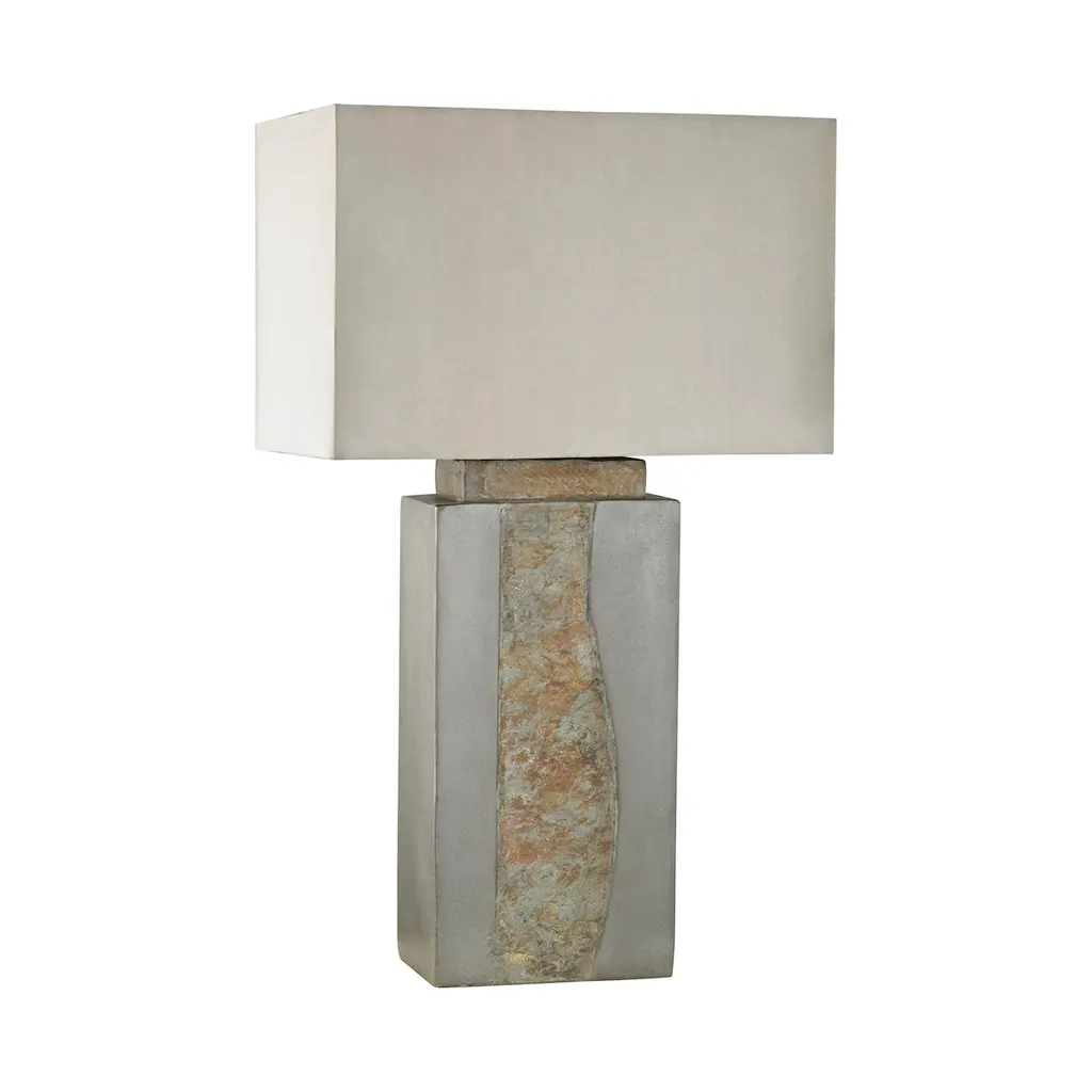 The Musee Outdoor Table Lamp offers a fashionable mixed-stone motif and seamless indoor-outdoor functionality. Weatherproof Grey and Natural stone construction withstand direct and regular outdoor exposure. Includes a heavy duty three-prong cord and a highly durable Taupe nylon shade. UL Rated for outdoor use. Dimensions: W 17", D 10", H 32" Materials: Stone Finish: Gray, Natural Slate