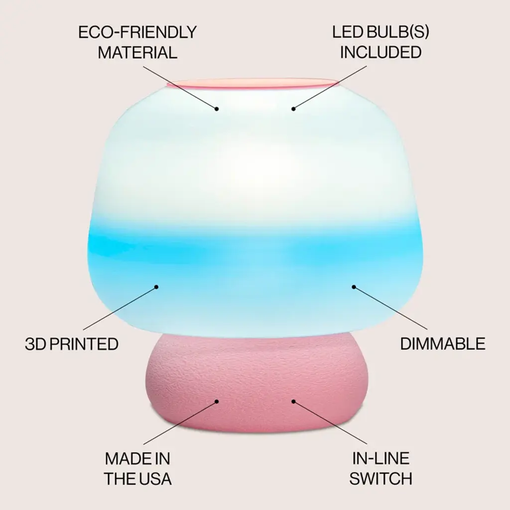 Our mushroom shaped 3D printed table lamp is perfect for traditional and modern homes alike. Featuring an in-line dimmer switch and plant based filament materials, this unique lamp is a welcome addition to any space. At 10" x 10" x 10", this lamp fits perfectly into any bedroom, office, or even kitchen.