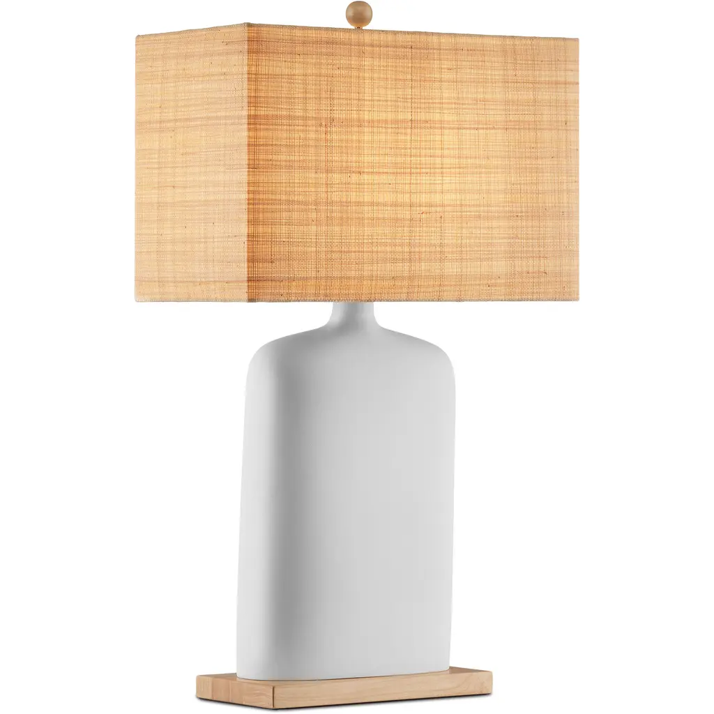 The beautiful pale matte quality of the Musing White Table Lamp is one of this lamp's strengths. Made of composite, the flask-like shape is wide and narrow, which makes it a good choice for surfaces without great depth. A natural wood base is perfectly in sync with the textural nature of the woven grasscloth shade.