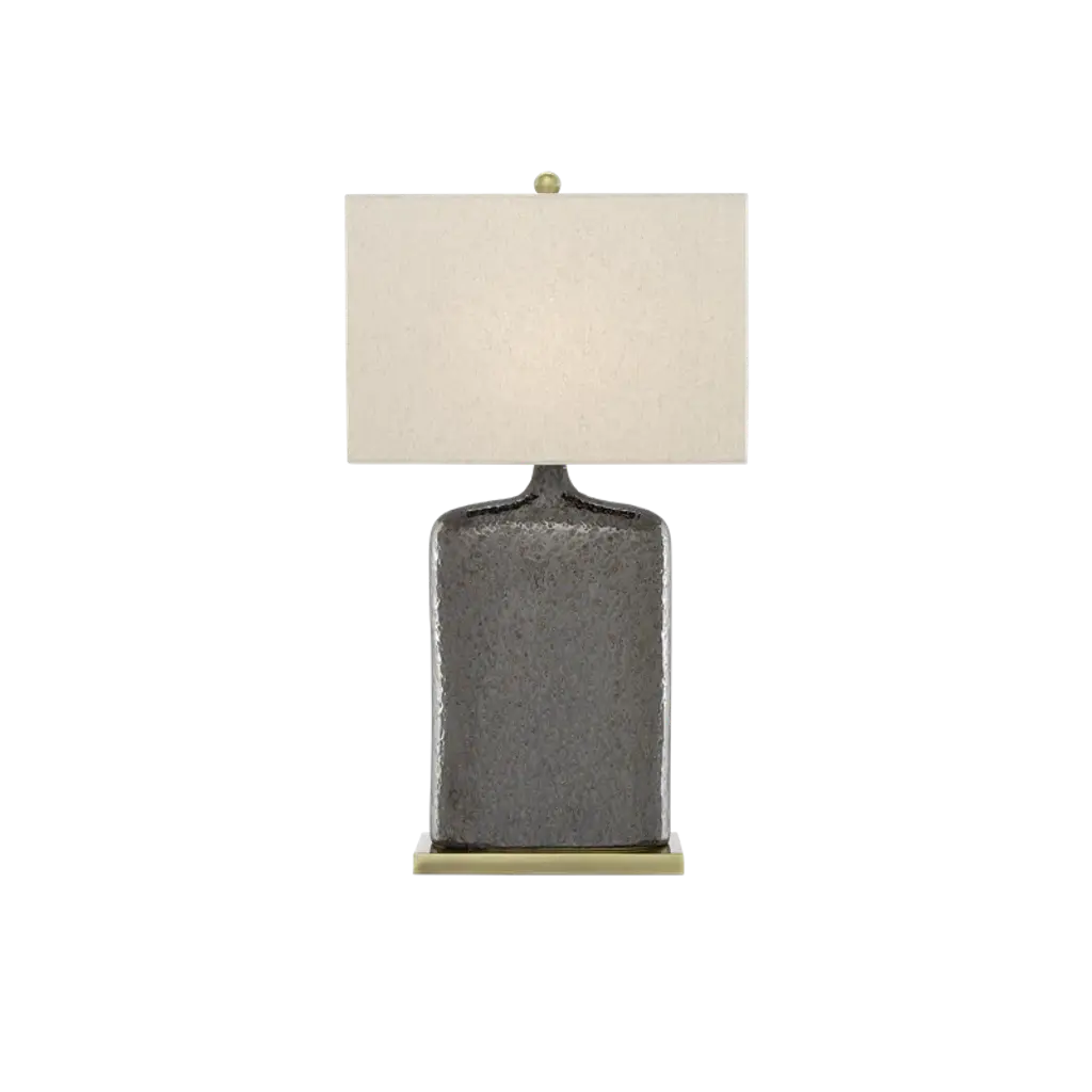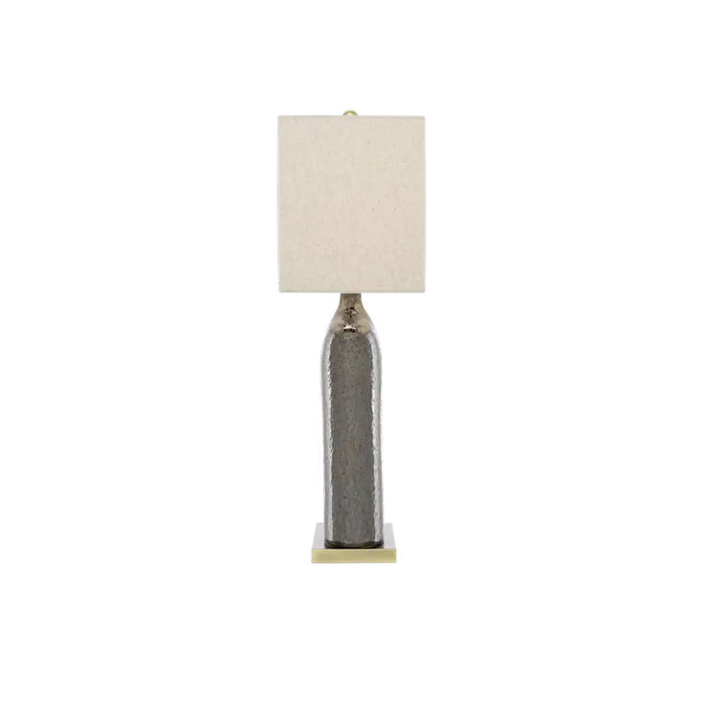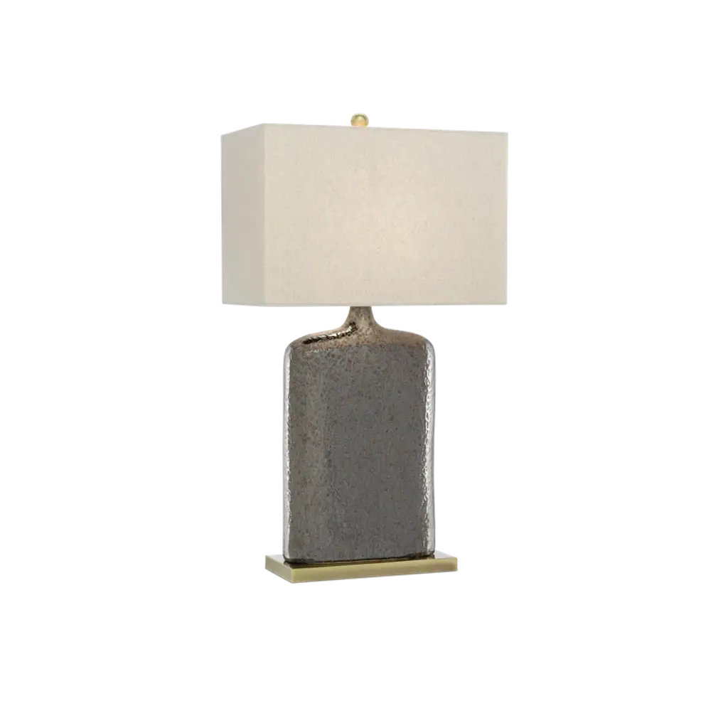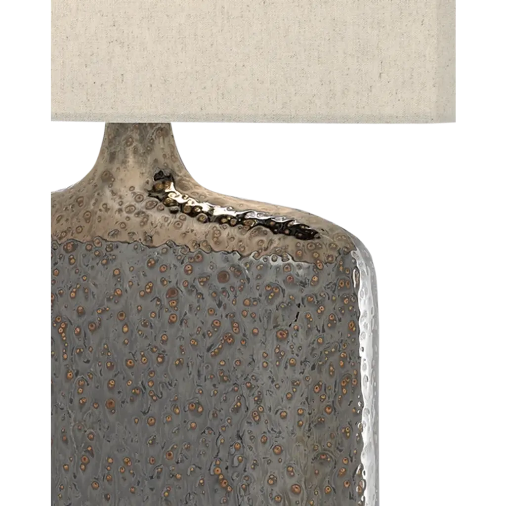 The rustic metallic bronze glaze on the Musing table lamp has natural pitting to add interest to the flask-like shape. The shallow depth of the elongated body, a metal plinth-like base in a bronze finish, and a khaki linen shade coalesce to bring the bronze lamp a rough luxe vibe.
