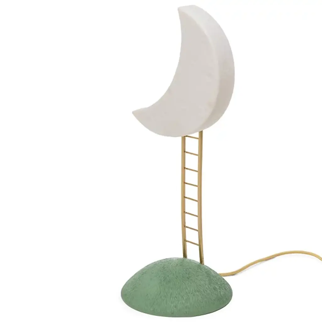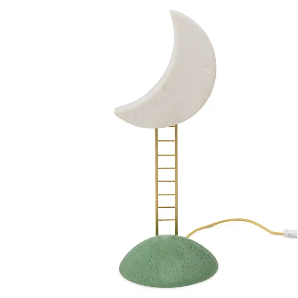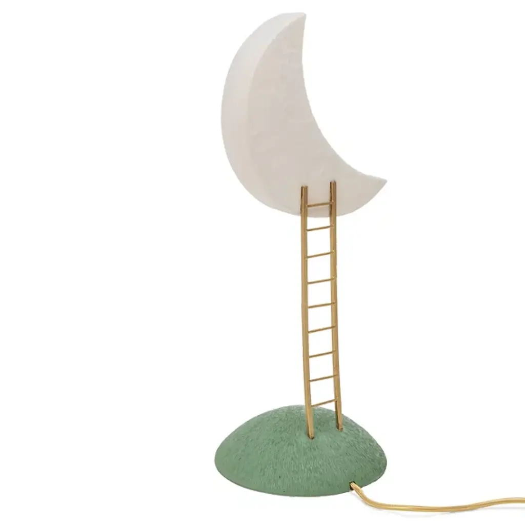 The My Secret Place LED Table Lamp from Seletti was designed by Marcantonio. This lamp transforms your environment into a realm of enchantment, featuring a ladder that gracefully unites with a crescent moon for poetic expression. Crafted from a combination of resin and metal, your table lamp is built for longevity. Enhance the ambiance to suit your mood with the lamp's dimmable feature, compatible with a separately sold ELV dimmer.
