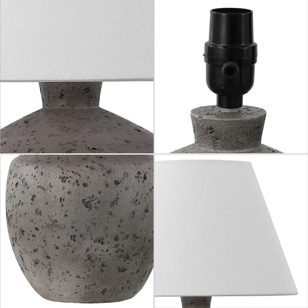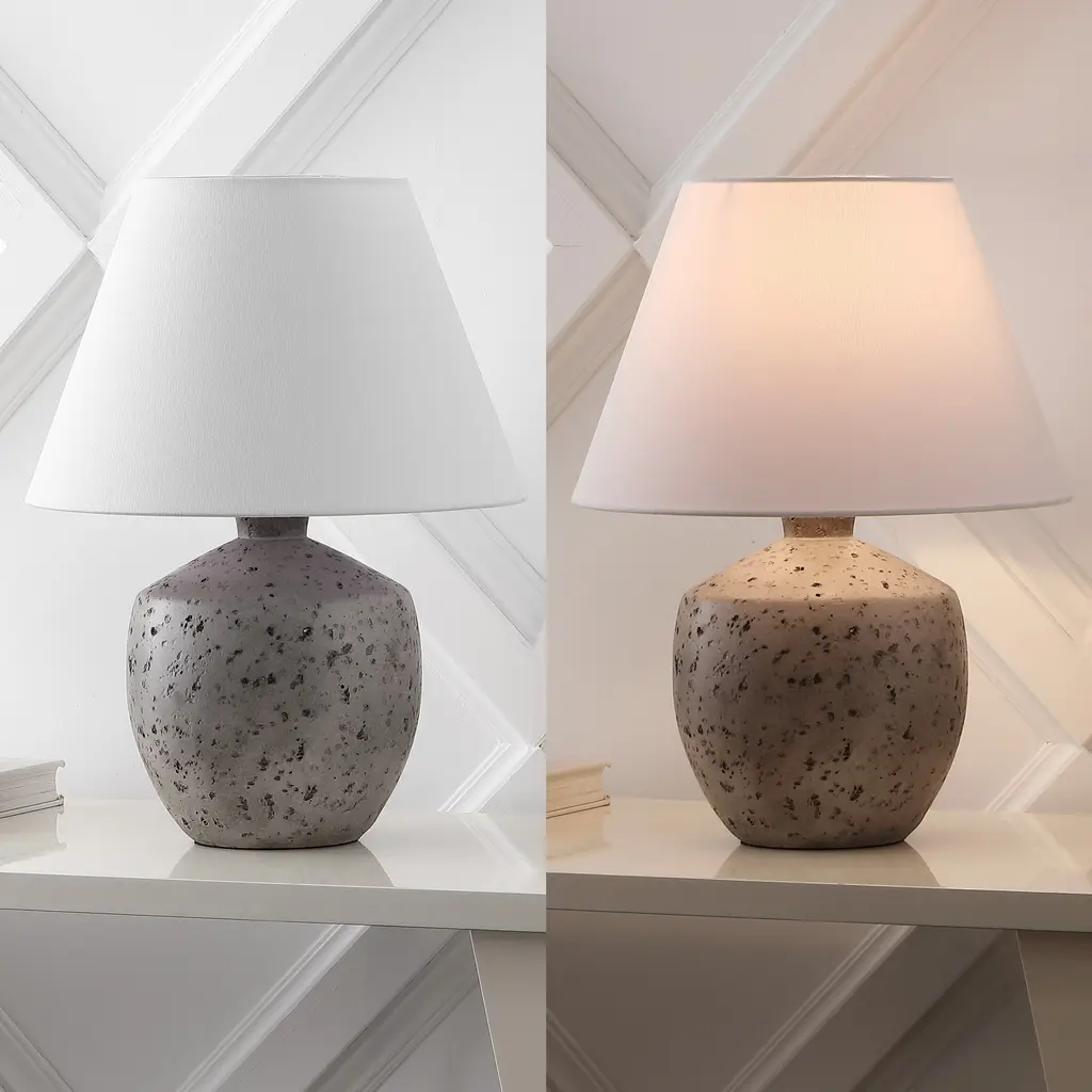 Our minimalist lamps add texture and interest with details inspired by Scandinavian design. Heavy resin bases in an abstract jar shape are topped with empire-shaped linen shades. The speckled finish adds subtle contrast to a bedroom, office or living room.-Contemporary antique gray resin base in a matte finish, with a linen shade in white-Classic lamp design is perfect for reading, with an LED bulb and rotary switch-These transitional lamps add vintage flair to a sofa, or make a statement in the bedroom-Eco-friendly 9W LED bulb included-Takes 1 bulb and compatible with TYPE "A" 100W or CFL 23W or LED 12WColor: Antique Gray with White Shade-Body Material: Resin-Includes: Two (2) lampsAssembly RequiredLamp: 18 inches high x 14 inches wide x 14 inches deepAbout us: You see a lamp.We see a decorative work of art.A perfectly curved shade casts a dramatic shadow on a floor. Compatible with LED lightbulbs: as easy on the environment as they are on the eyes. The JONATHAN Y Lighting collection considers every detail from impeccably sourced materials to designer styling. And our prices are so attractive, we've transformed a functional necessity into a fashion accessory.JONATHAN Y Lighting - a fashion revolution in home decor.