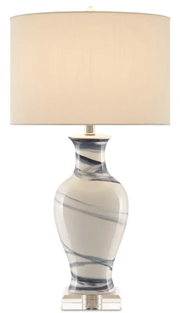 Our Myrtle Table Lamp is made of white and blue ceramic with whispery motifs that read as floral in nature. Sitting atop a clear optic crystal base, the white lamp has a decidedly feminine appeal. Metal hardware in a polished nickel finish and an optic crystal finial fasten the off-white linen drum shade to this table lamp. Ships In 7-10 Business Days This image is for illustrative purposes only. The colors shown are accurate within the constraints of lighting, photography, and the color accuracy of your screen.