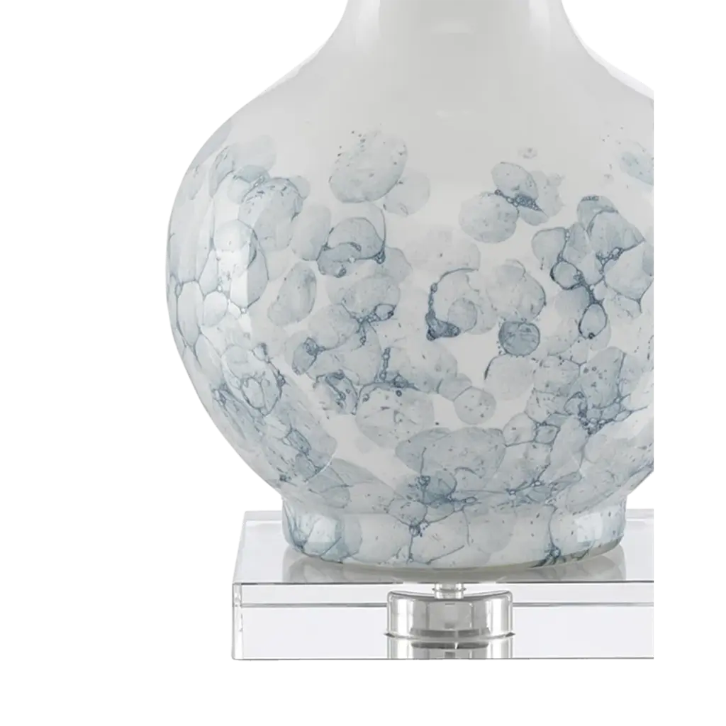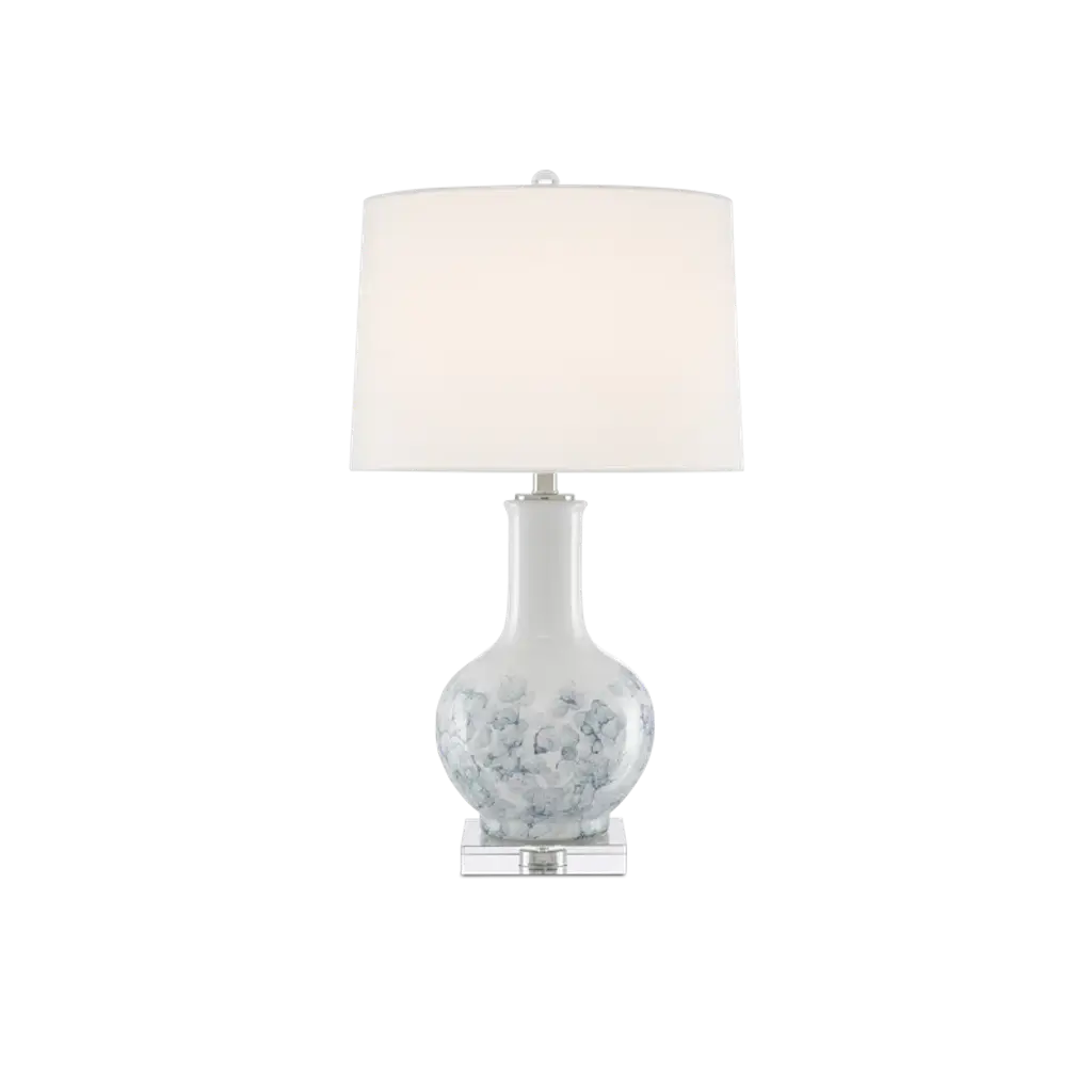 The Lynton Table Lamp, a modernized version of a classically styled ceramic lamp, has a cream crackle finish. The warm glow of the brass mountings and coordinating finial contrast the body and the off-white linen shade.