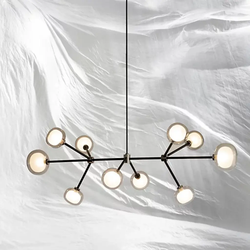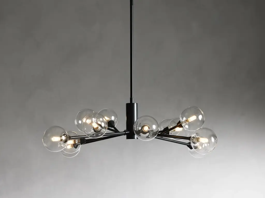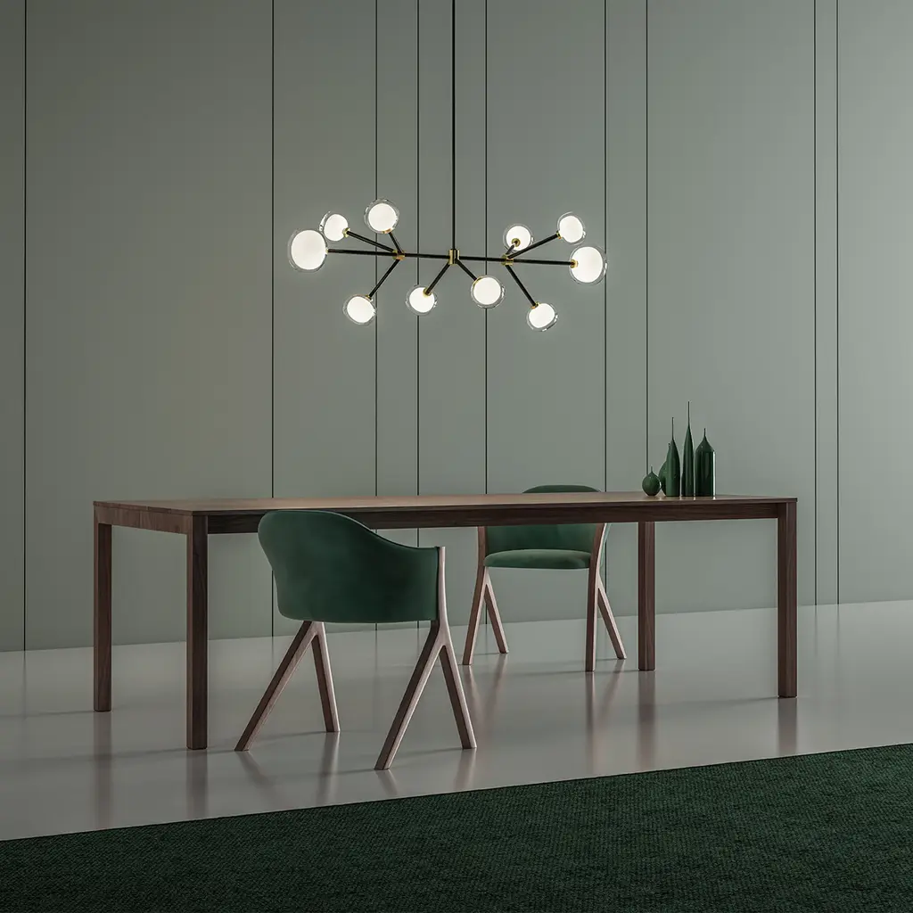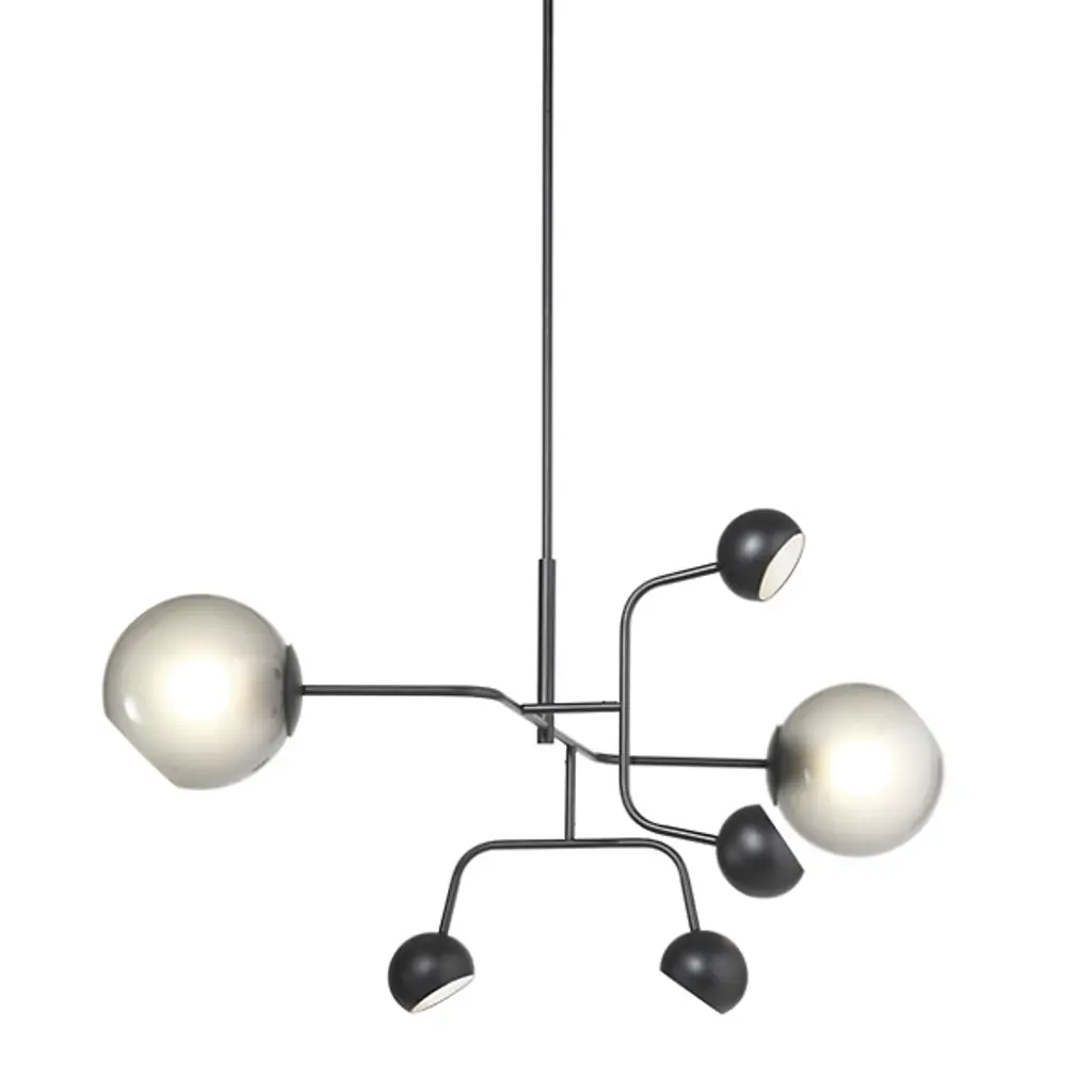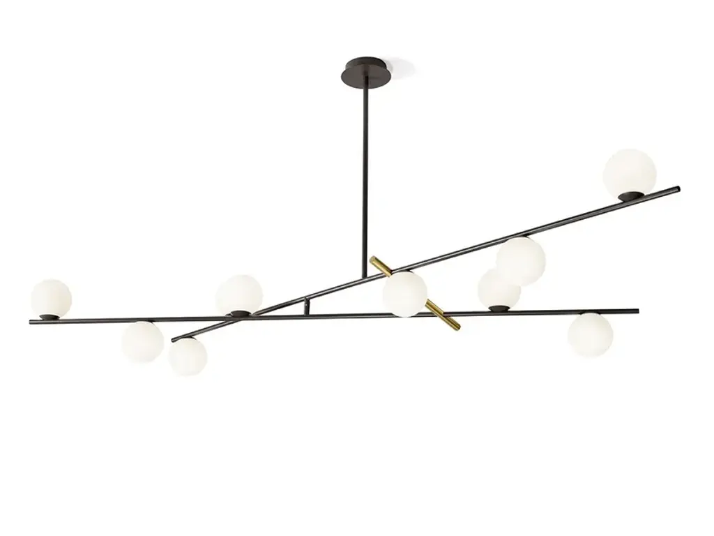 50s inspired collection of elegant and sophisticated lamps representing the detail to enrich any location. A double-sided spherical bright object in borosilicate glass makes these lamps available in different compositions and a structure made by metal coated with epoxy powder enriched with brushed brass or black chrome details. Different varieties are available for any situation: chandeliers (in five different models) or table lamp, bedside (smaller), floor or wall (available in three different models for single or composite personalized installation). Richness and sobriety all in one single element.