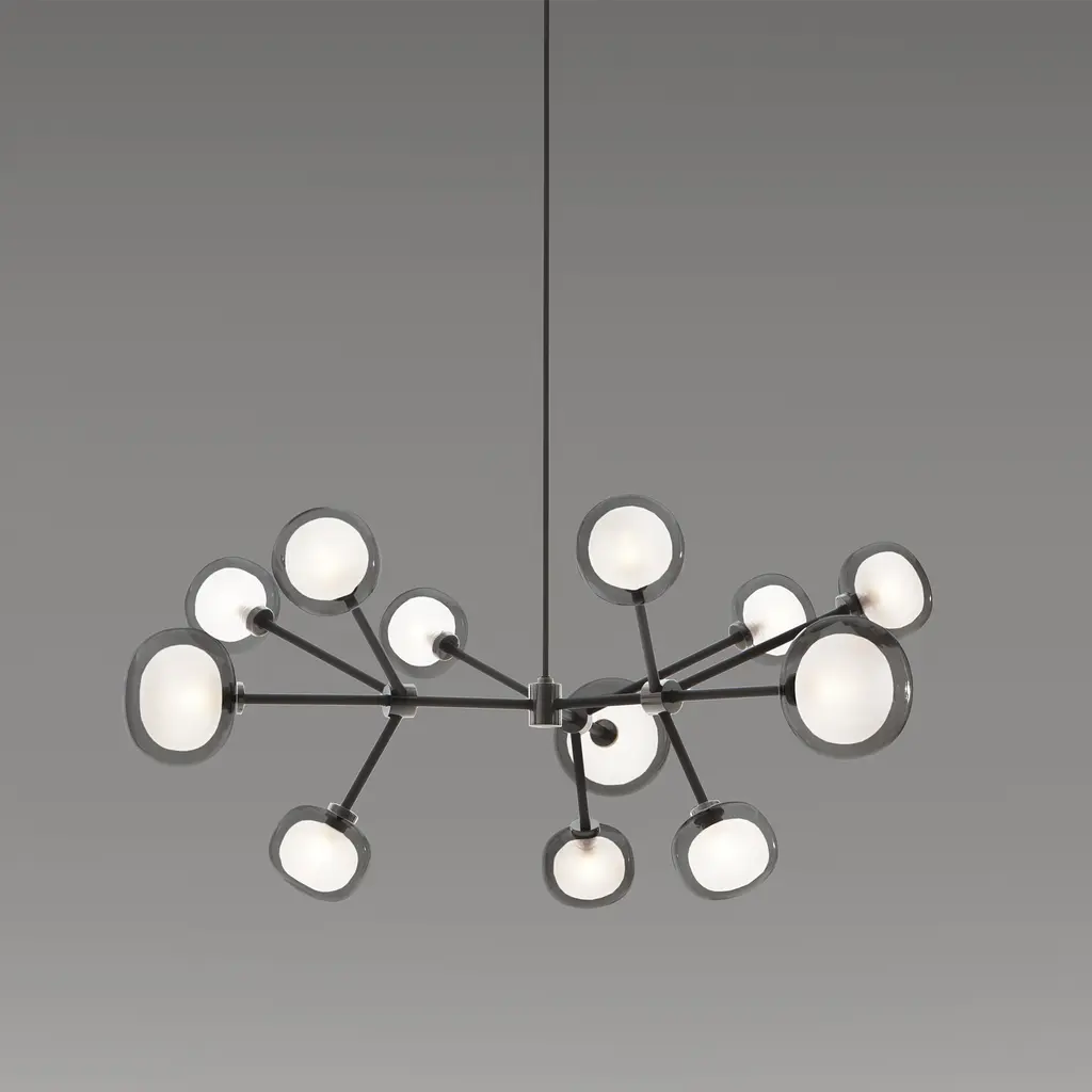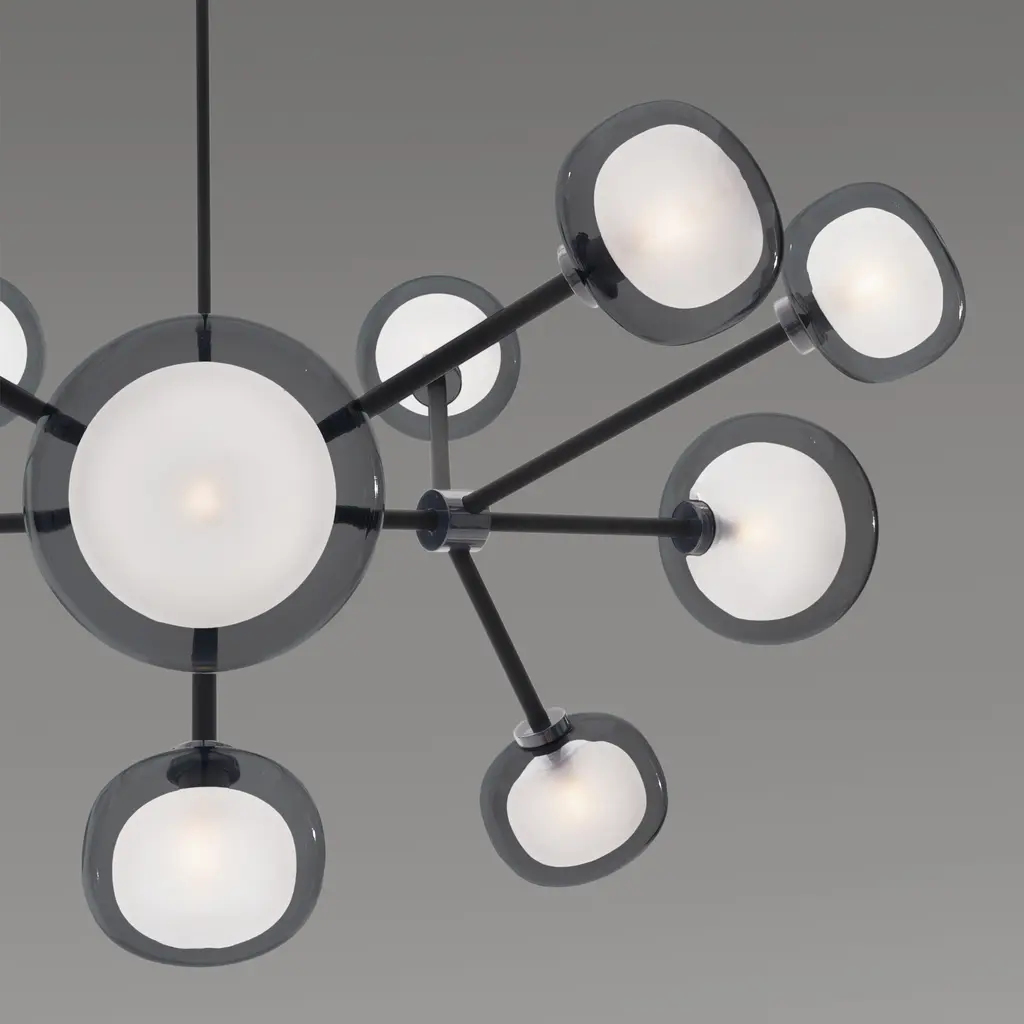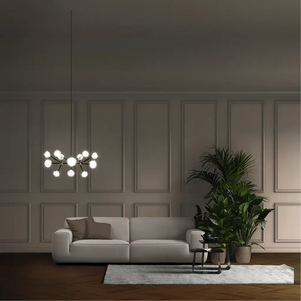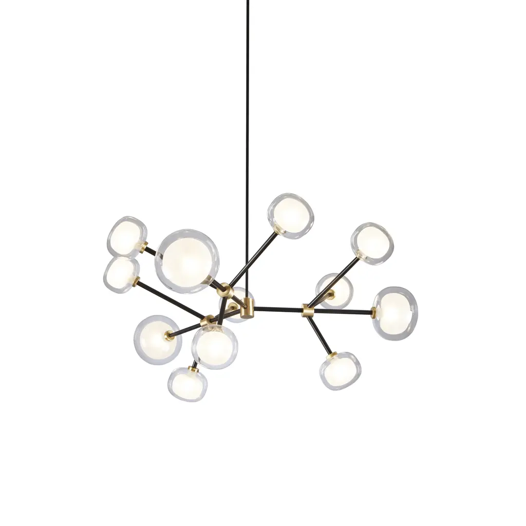 50s inspired collection of elegant and sophisticated lamps representing the detail to enrich any location. A double-sided spherical bright object in borosilicate glass makes these lamps available in different compositions and a structure made by metal coated with epoxy powder enriched with brushed brass or black chrome details. Different varieties are available for any situation: chandeliers (in five different models) or table lamp, bedside (smaller), floor or wall (available in three different models for single or composite personalized installation). Richness and sobriety all in one single element.