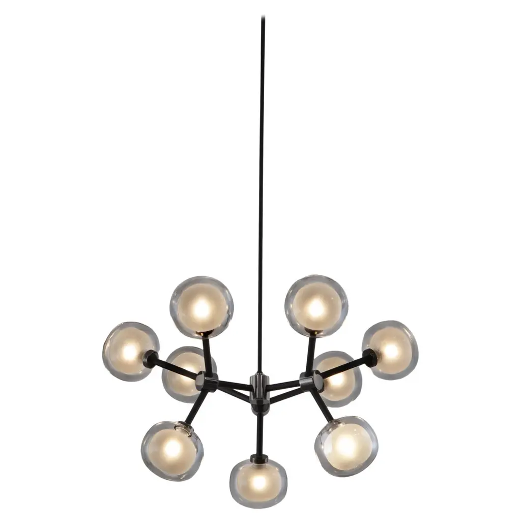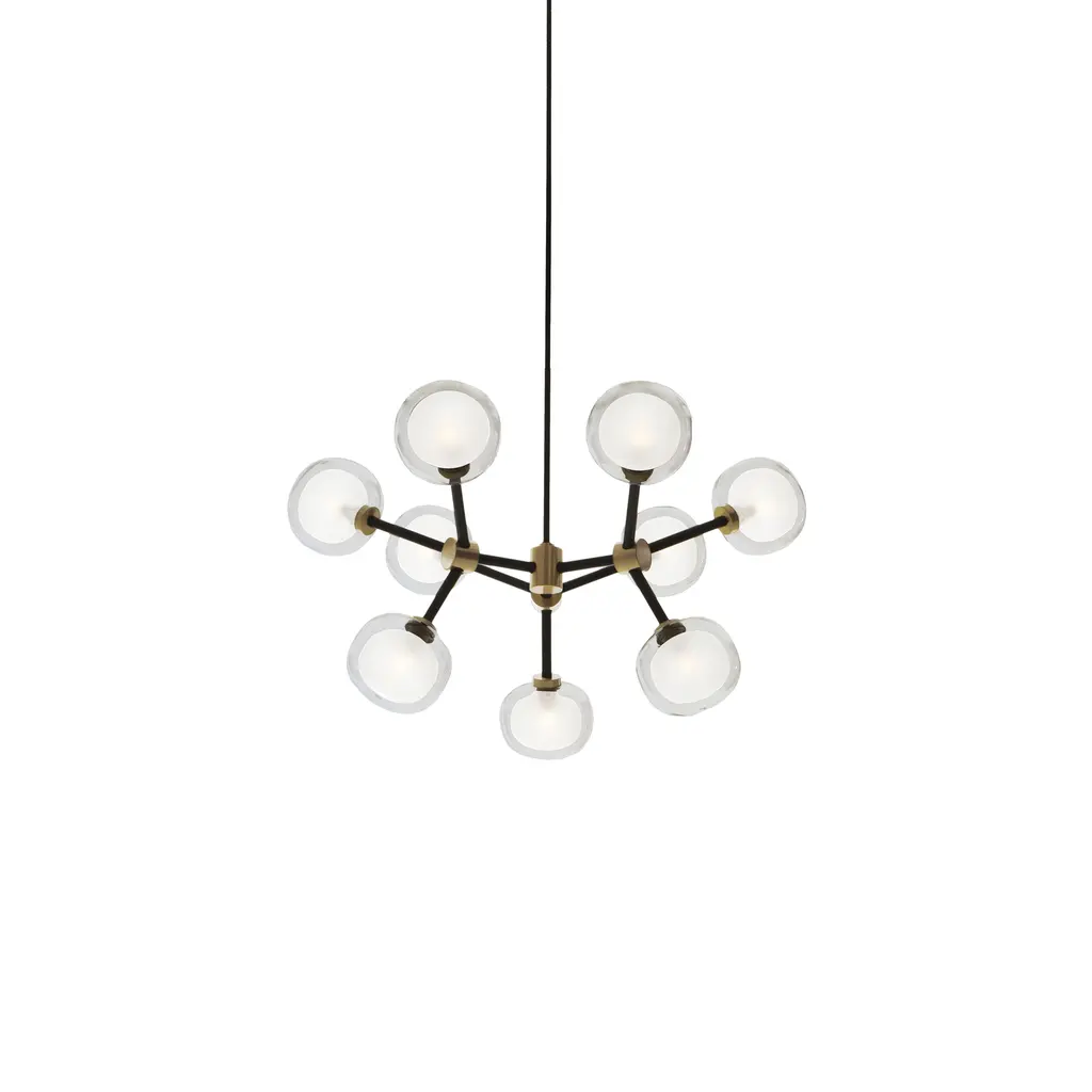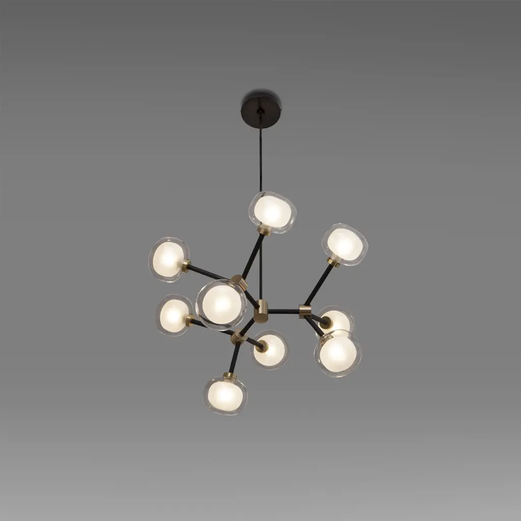 50s inspired collection of elegant and sophisticated lamps representing the detail to enrich any location. A double-sided spherical bright object in borosilicate glass makes these lamps available in different compositions and a structure made by metal coated with epoxy powder enriched with brushed brass or black chrome details. Different varieties are available for any situation: chandeliers (in five different models) or table lamp, bedside (smaller), floor or wall (available in three different models for single or composite personalized installation). Richness and sobriety all in one single element.