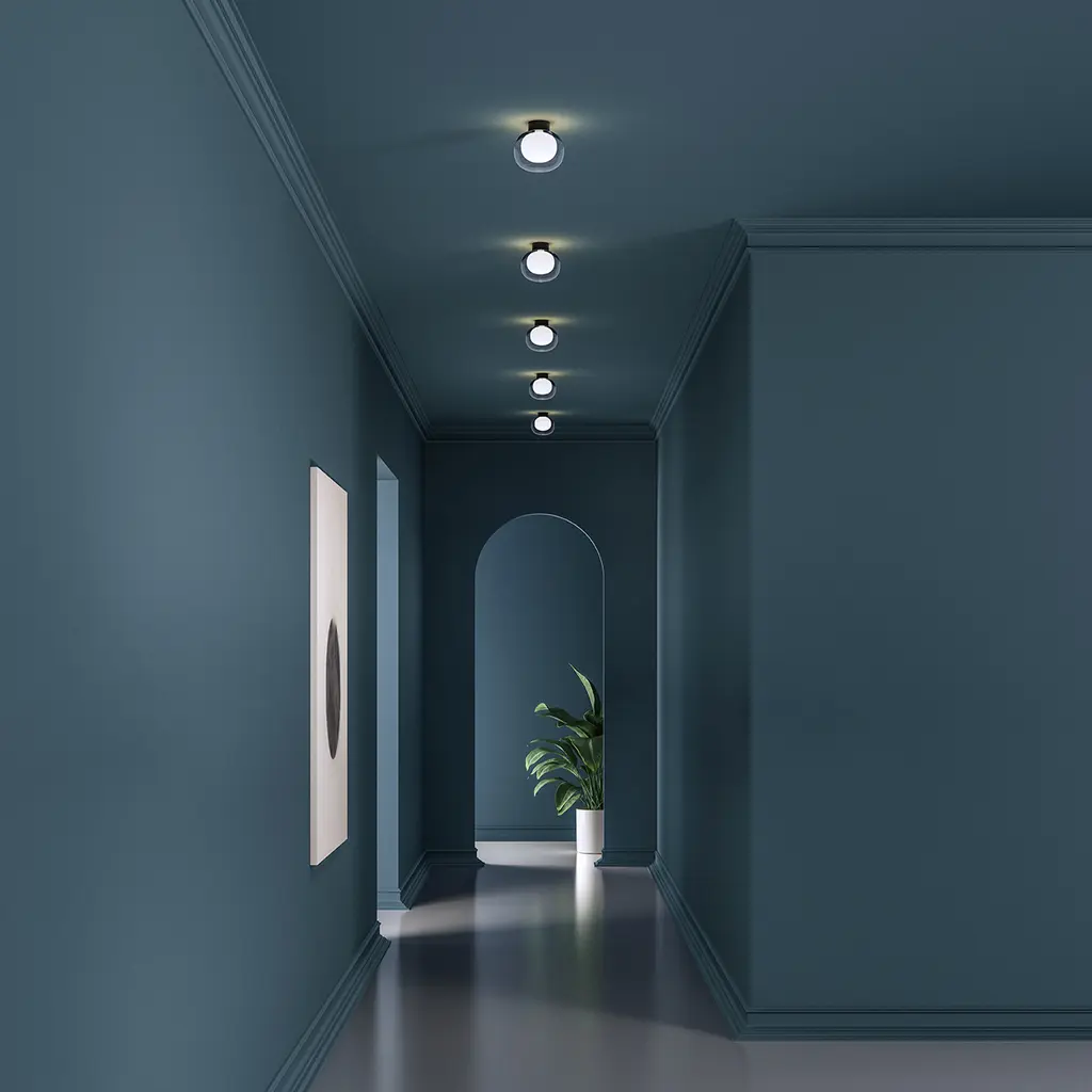 50s inspired collection of elegant and sophisticated lamps representing the detail to enrich any location. A double-sided spherical bright object in borosilicate glass makes these lamps available in different compositions and a structure made by metal coated with epoxy powder enriched with brushed brass or black chrome details. Different varieties are available for any situation: chandeliers (in five different models) or table lamp, bedside (smaller), floor or wall (available in three different models for single or composite personalized installation). Richness and sobriety all in one single element.