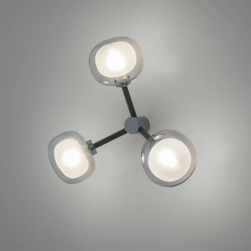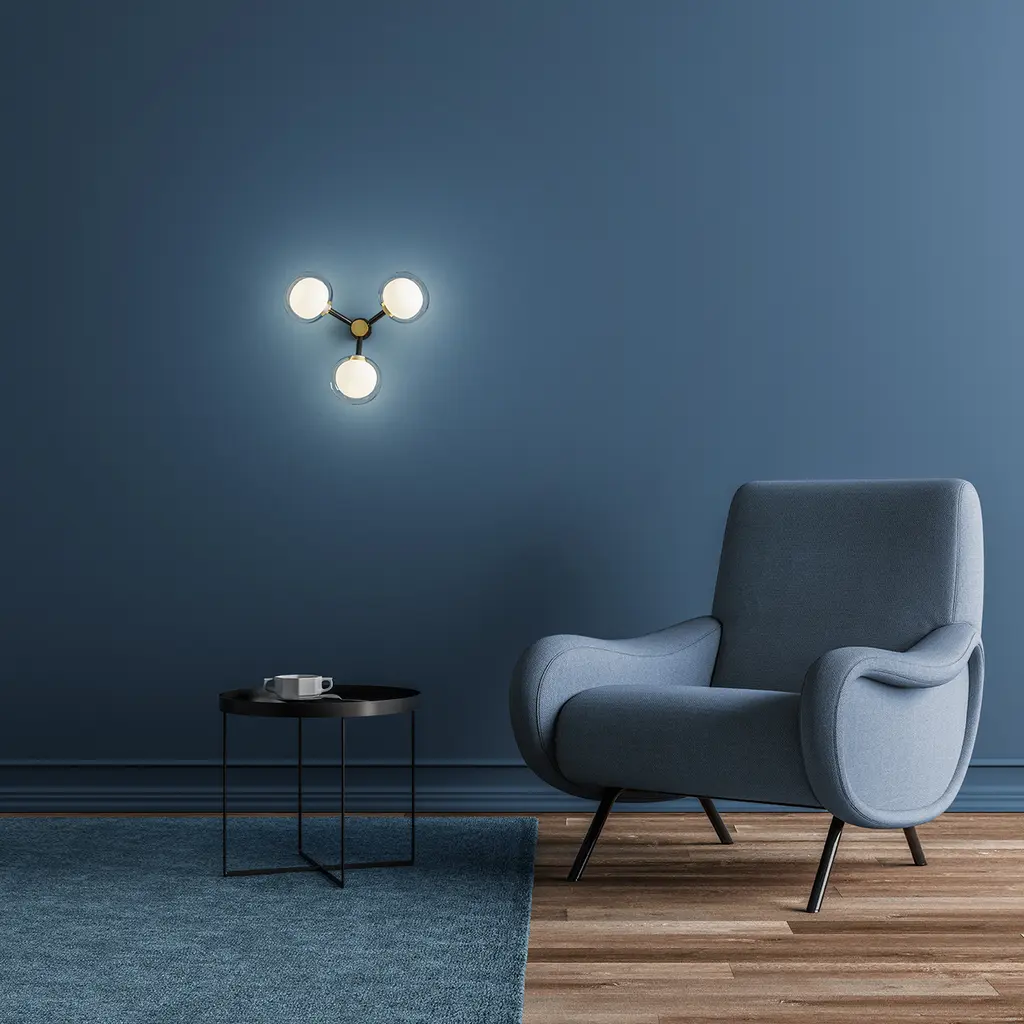 50’s inspired collection of elegant and sophisticated lamps representing the detail to enrich any location. A double-sided spherical bright object in borosilicate glass makes these lamps available in different compositions and a structure made by metal coated with epoxy powder enriched with brushed brass or black chrome details. Different varieties are available for any situation: chandeliers (in five different models) or table lamp, bedside (smaller), floor or wall (available in three different models for single or composite personalized installation). Richness and sobriety all in one single element.