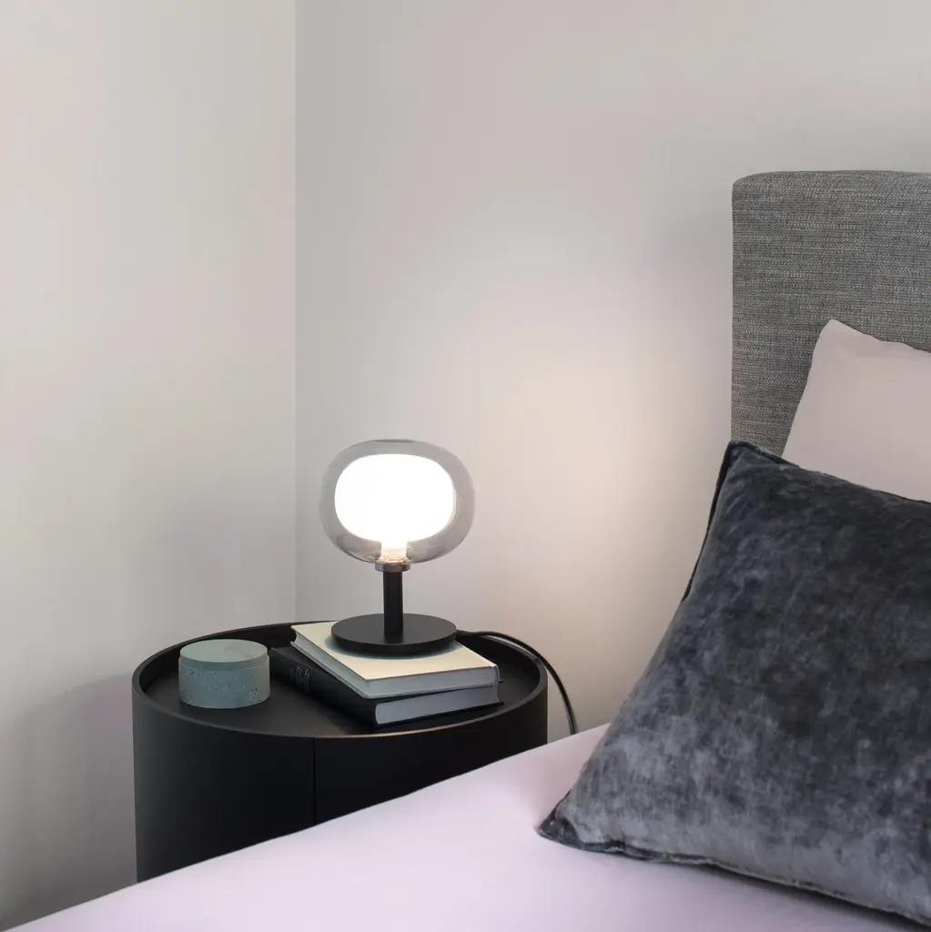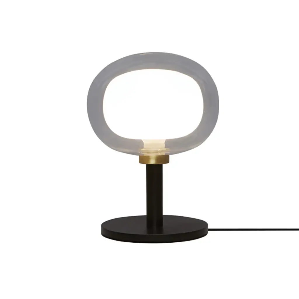 Illuminate your space with welcomed glow of the Nabila Table Lamp from TOOY. Inspired by the 1950s space-race, its Matte Black base and Black Chrome or Brushed Brass accents exude mid-century sophistication. Its Smoke or Clear borosilicate glass adds a modern touch, perfect for any contemporary office or bedside table. On/off switch conveniently located on the cord. Highlights