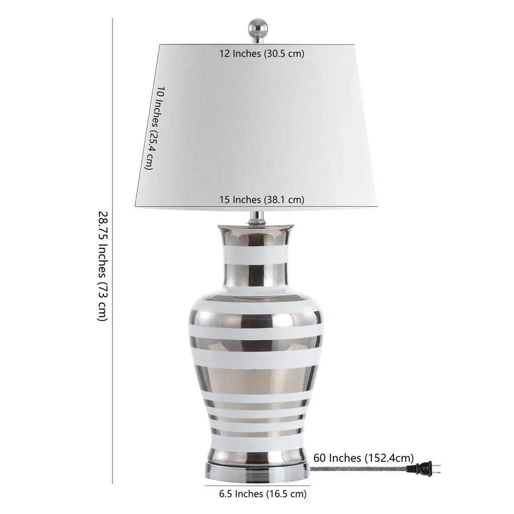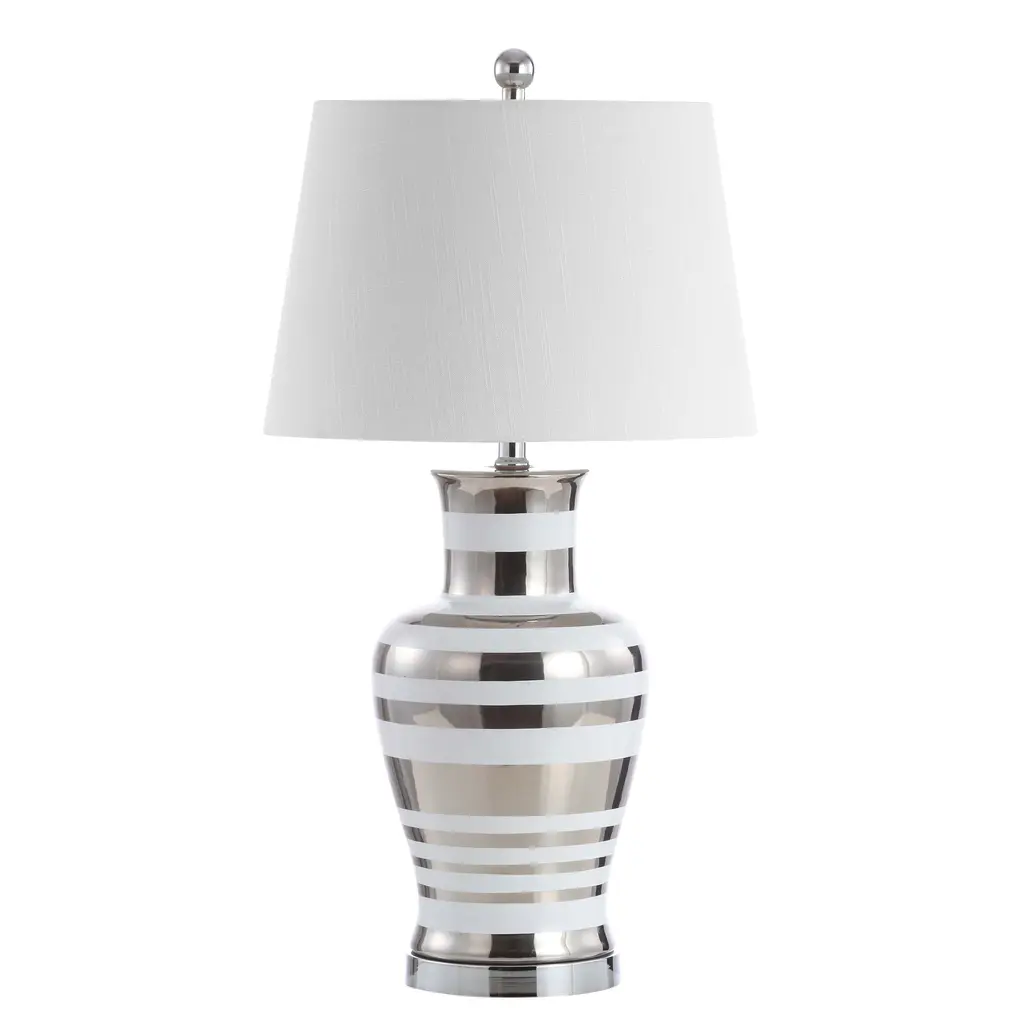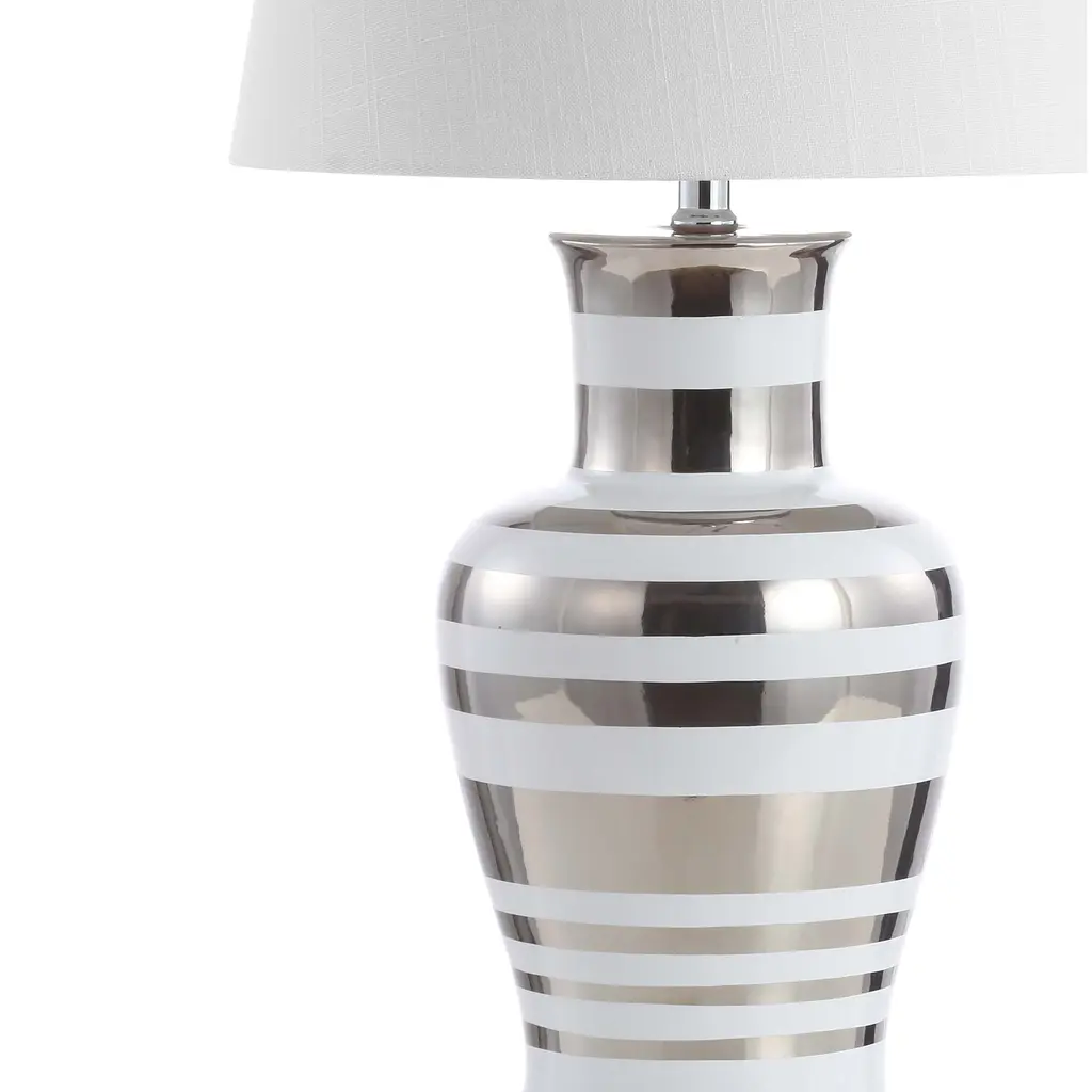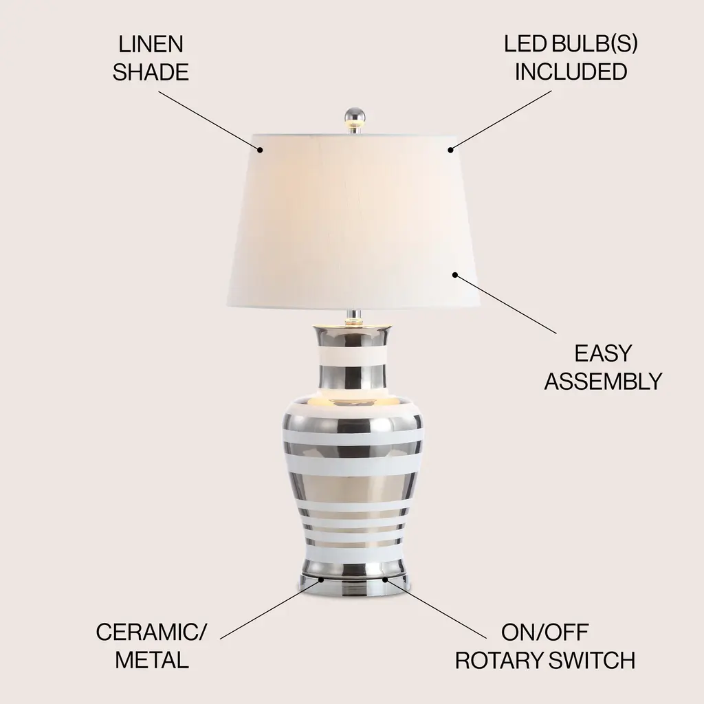 Our modern take on a classic lamp features silver stripes on a white ceramic base. Try a pair of these fresh, modern lamps in a bedroom, living room, or entry console. Add sparkle to a Hollywood Regency room; the drum shade suits modern interiors. Includes an energy-saving LED bulb.Features:Dimensions:About us:You see a lamp.We see a decorative work of art.A perfectly curved shade casts a dramatic shadow on a floor. A silk cord you never want to hide. Compatible with LED lightbulbs: as easy on the environment as they are on the eyes. The JONATHAN Y Lighting collection considers every detail from impeccably sourced materials to designer styling. And our prices are so attractive, we've transformed a functional necessity into a fashion accessory.JONATHAN Y Lighting - a fashion revolution in home decor.