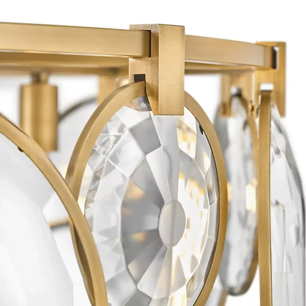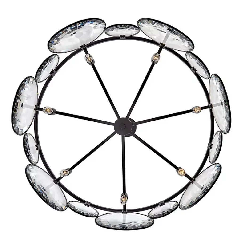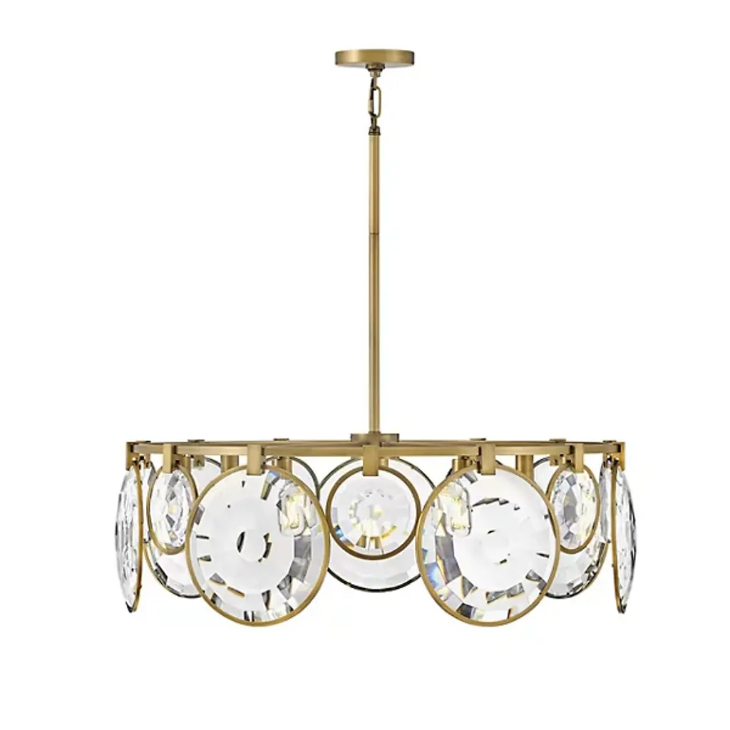 The Nala Chandelier from Fredrick Ramond offers an airy, inspired presence with an even, wide-reaching ambiance. A low-profile disc canopy secures the fixture from above, while a short length of fine chain connects it to a slender downrod terminating in a horizontally-held ring structure. Illumination is provided by an array of short candelabra lamps, and an array of large and small metal rings sweeps down from the lower edge of the horizontal ring. Bevel-edged optical crystal pucks rest inside each ring frame, sparkling with pleasing warmth.