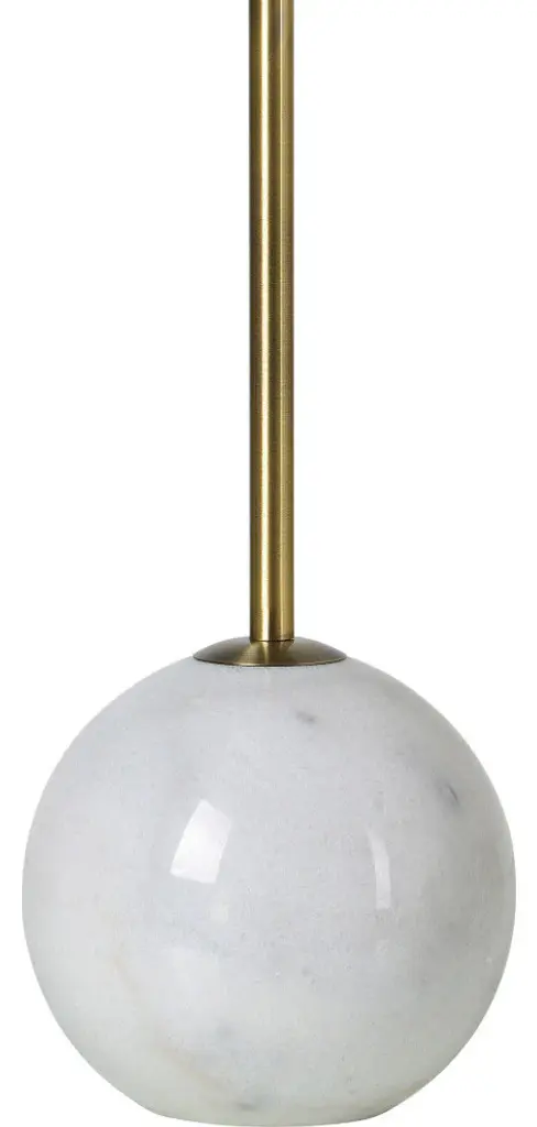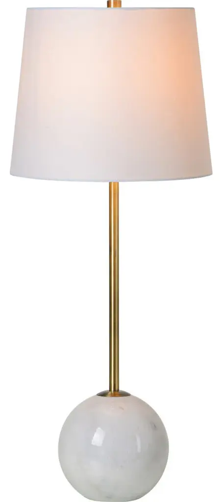 Classical structure and modern simplicity intersect in this set of table lamps. Arranged on bedside tables in the contemporary bedroom, it adds to the serene quality to the space. Composed of an off-white cotton shade, natural white marble, and antique brass plated iron, each lamp has an ideal blend of warm and cool tones.