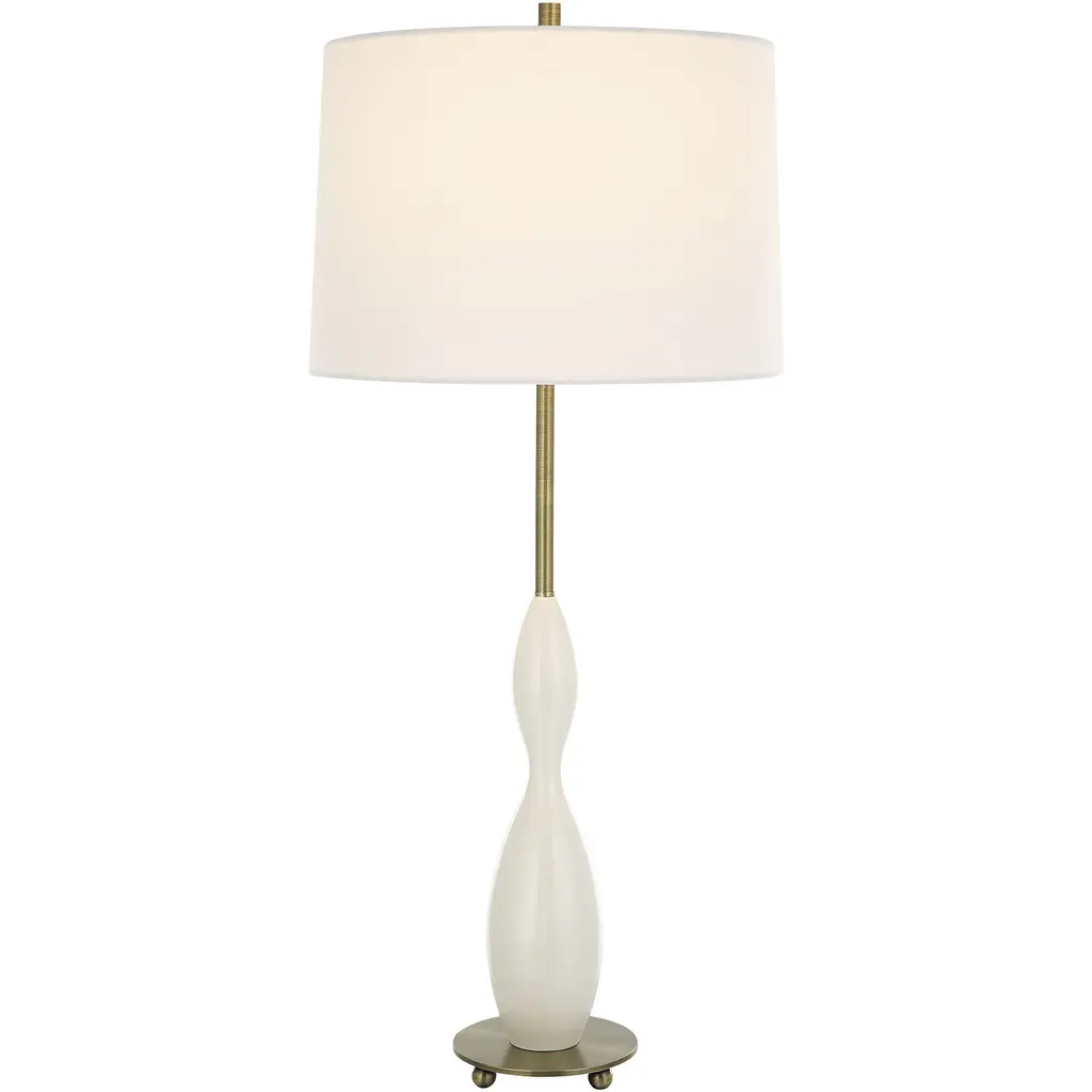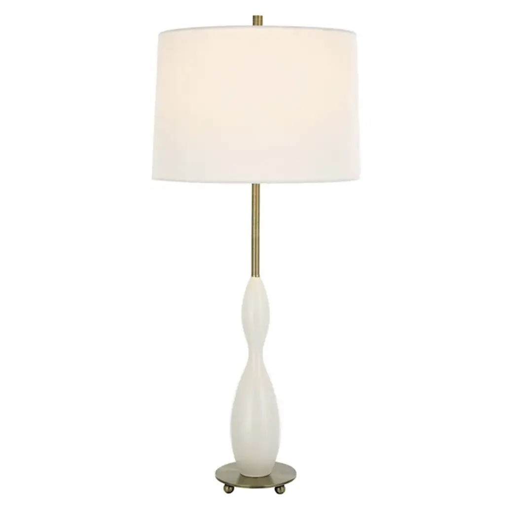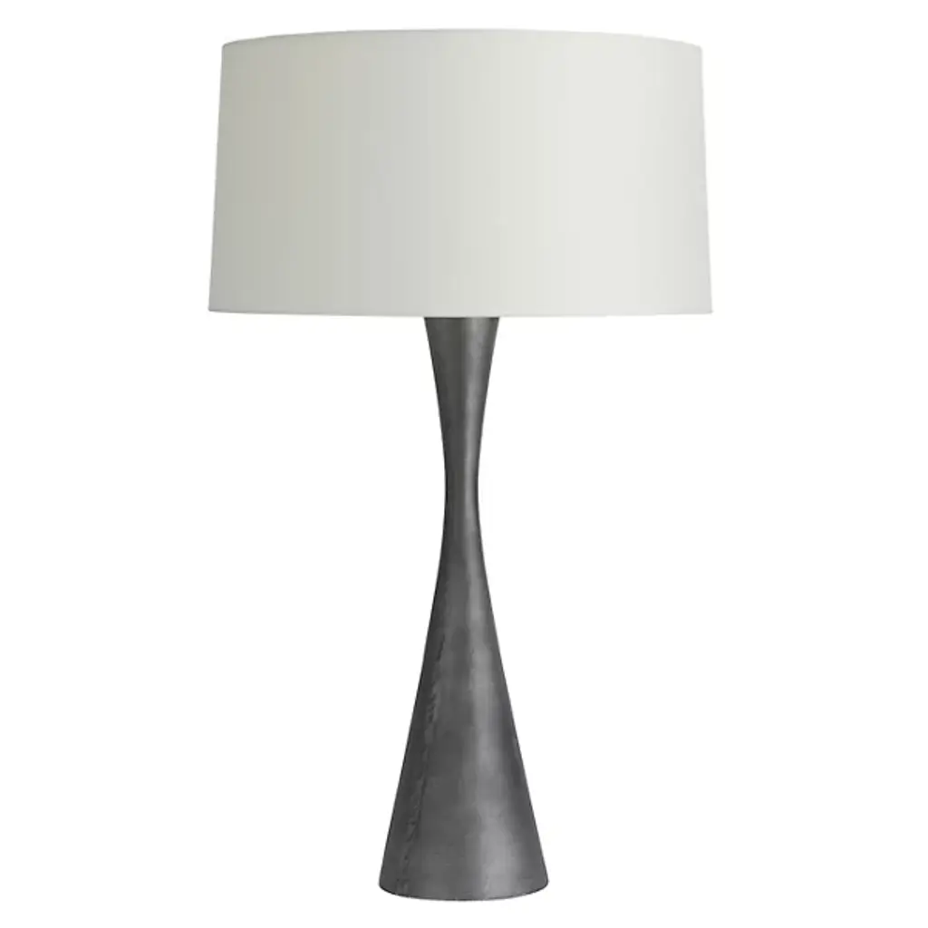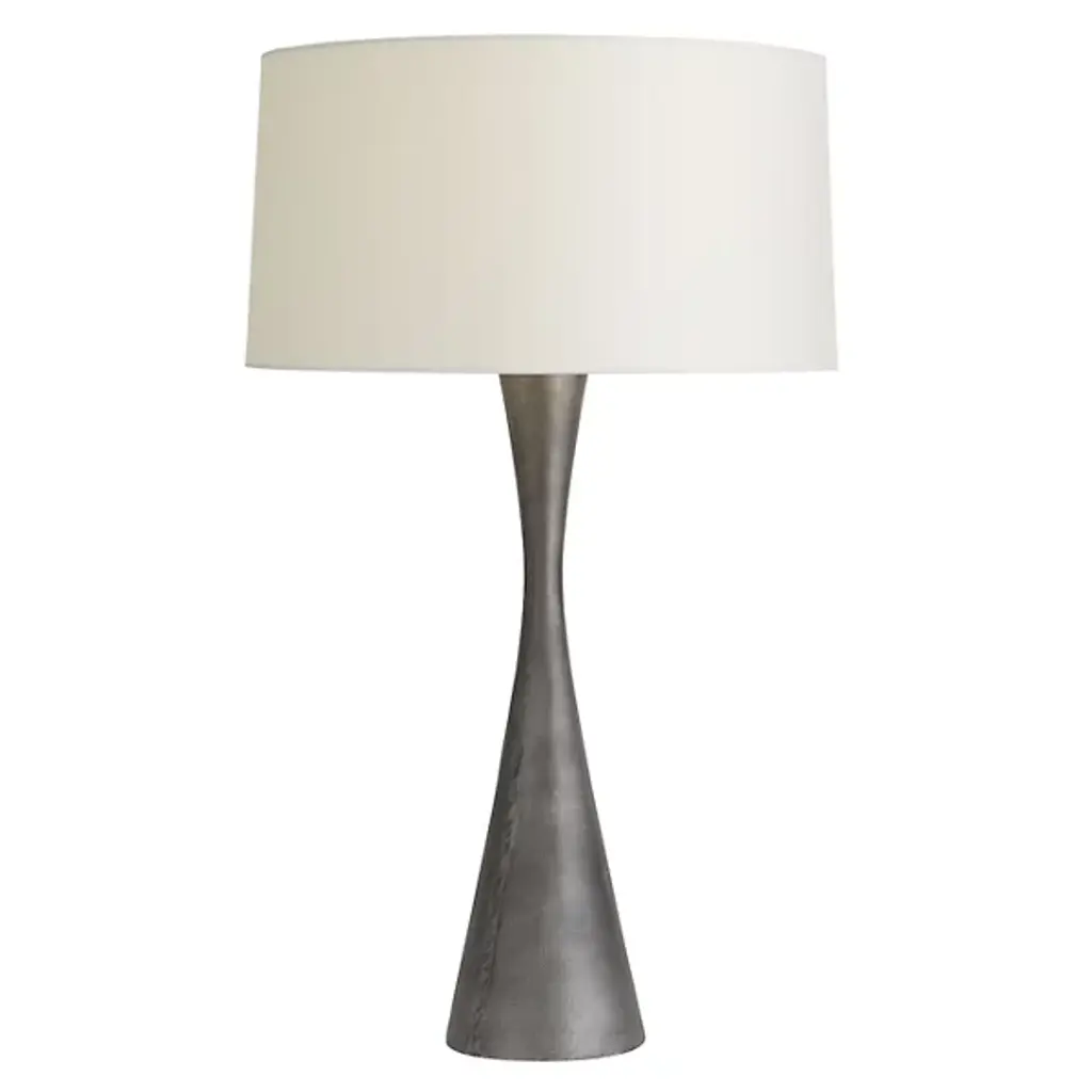 Make a modern minimalist enhancement to your interiors with the smooth and striking Narsi Table Lamp from Arteriors. Based on a body fashioned from cast aluminum, its extended hourglass narrows extremely toward the piece’s midpoint before flaring out to place its lamping beneath a rounded drum shade fashioned from cotton. This translucent layer reduces horizontal glare to an even ambiance, while a bronze-textured finial offers a final, contrasting note to the fixture.