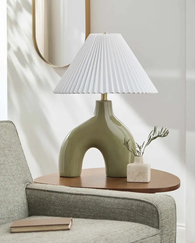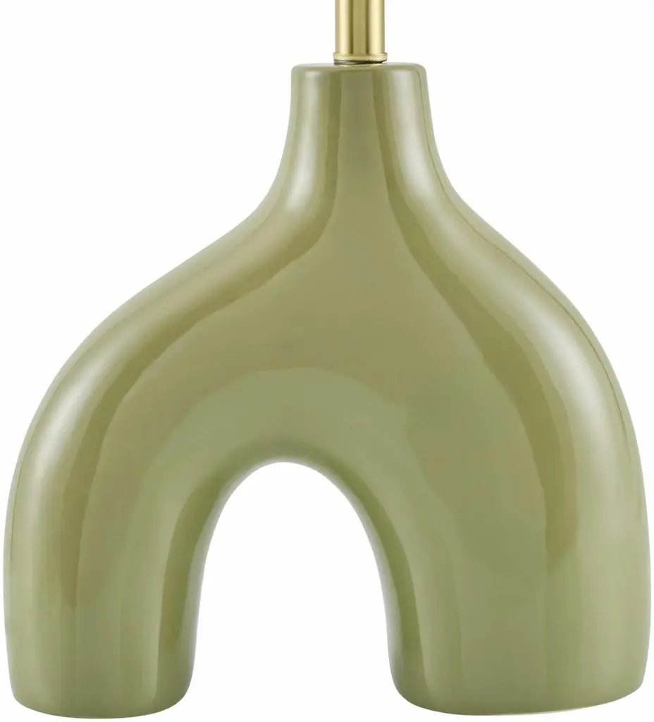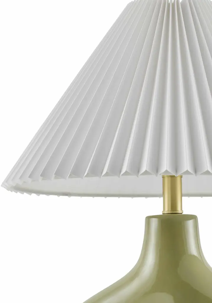 Collection: Nassandres Colors: Green, White, Metallic - Brass, Translucent Material: Body: Ceramic / Shade (Outside): Polyester / Shade (Inside): Polyester / Finial: Iron Styles: Traditional Made In: China Lighting Type: Accent Table Lighting Shade Material: Polyester, Polyester Shade Color: White, White Cord Length: 6' Switch Type: Rotary Number of Bulbs: 1 Socket Type: E-26 Bulb Wattage: 100W