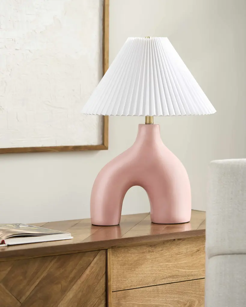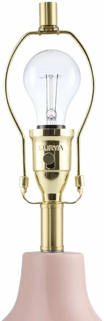 Collection: Nassandres Colors: Pink, White, Metallic - Brass, Translucent Material: Body: Ceramic / Shade (Outside): Polyester / Shade (Inside): Polyester / Finial: Iron Styles: Traditional Made In: China Lighting Type: Accent Table Lighting Shade Material: Polyester, Polyester Shade Color: White, White Cord Length: 6' Switch Type: Rotary Number of Bulbs: 1 Socket Type: E-26 Bulb Wattage: 100W
