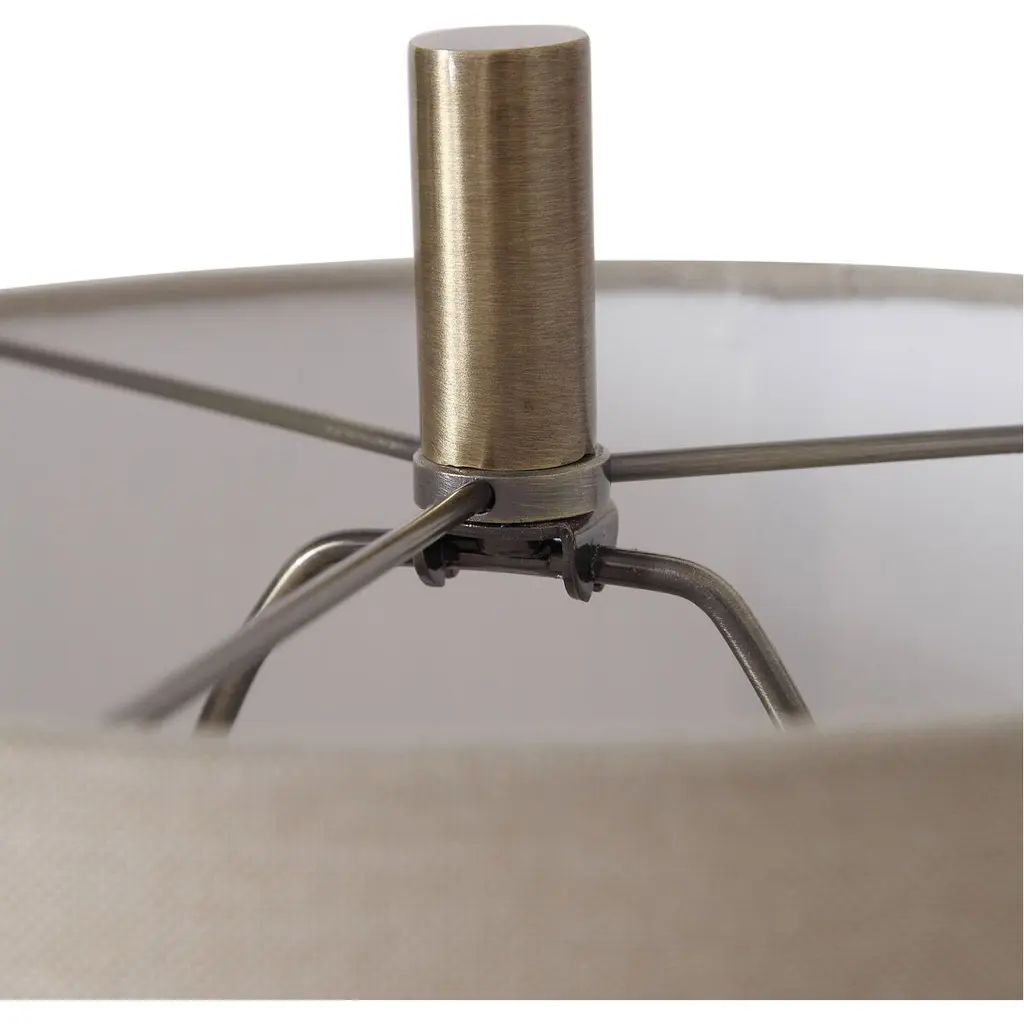 This Buffet Lamp Features A Delicate Design With Traditional Elements That Showcase Polished White Marble Details, Paired With Antique Brass Plated Accents. The Round Hardback Shade Is A Warm Khaki Linen Fabric.