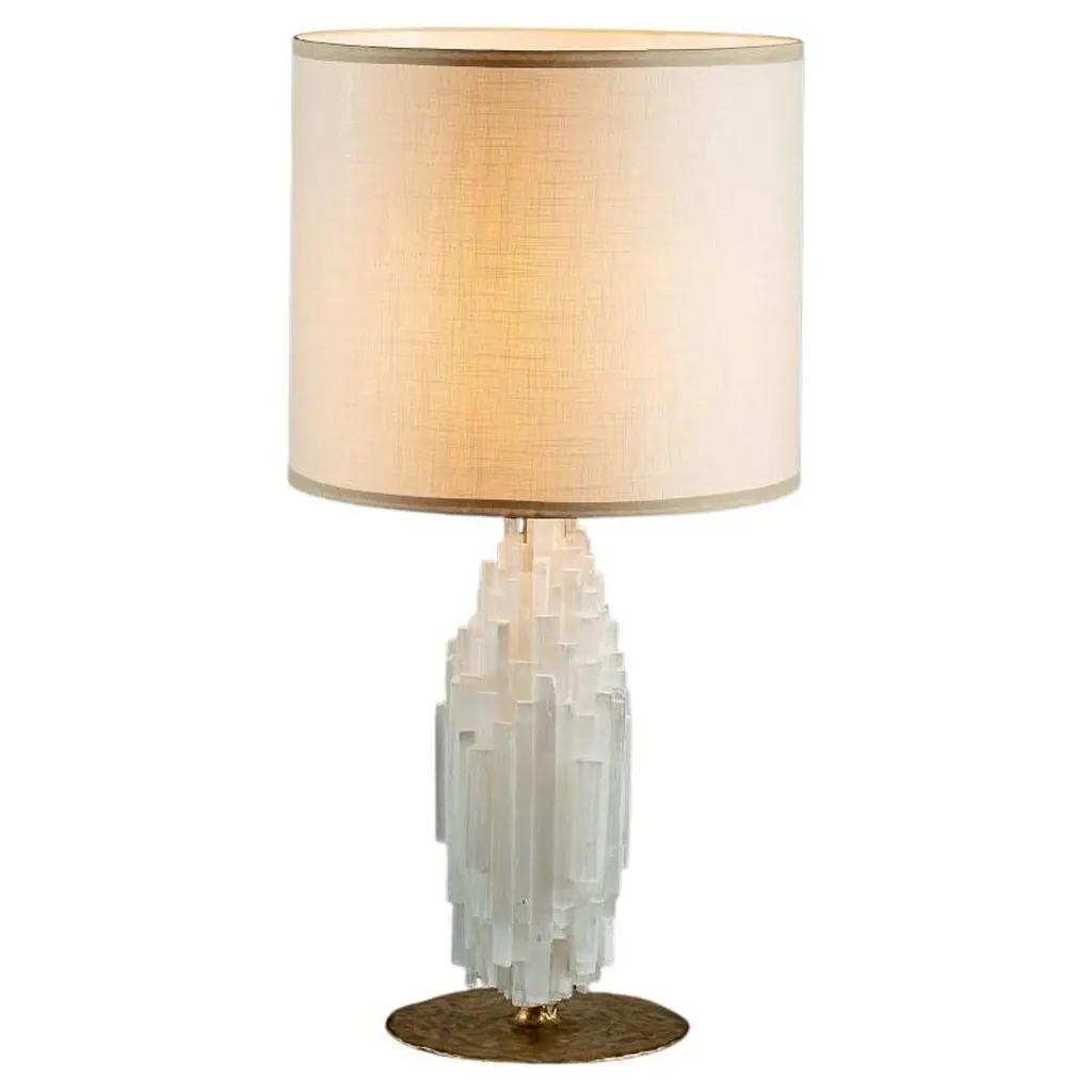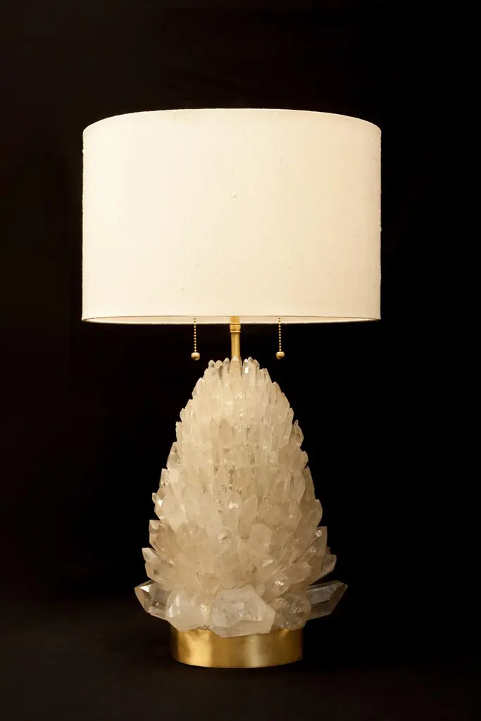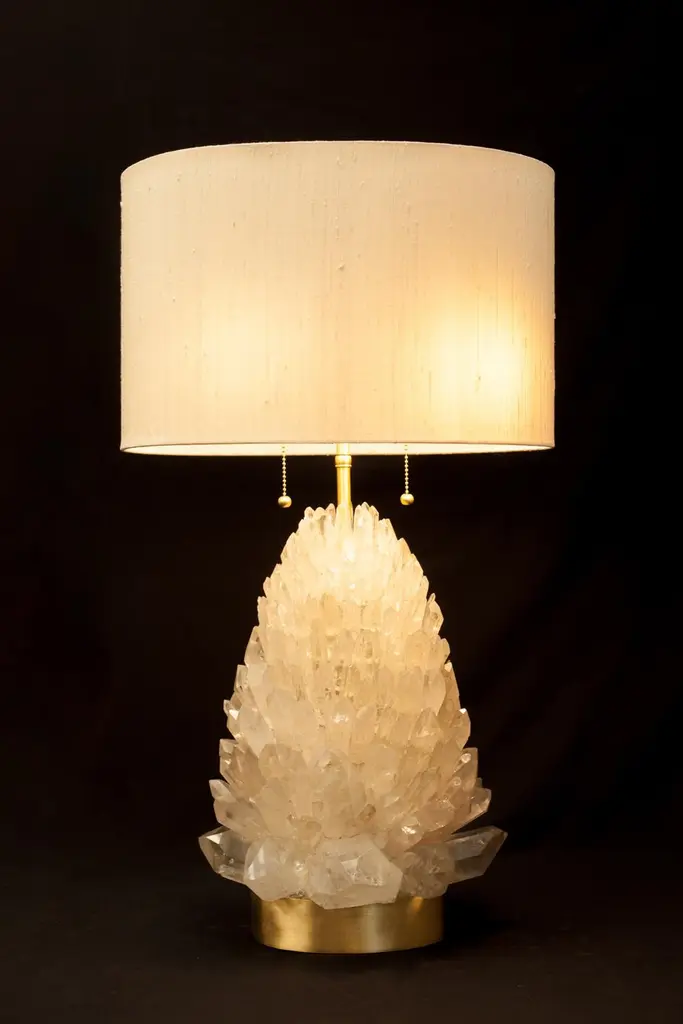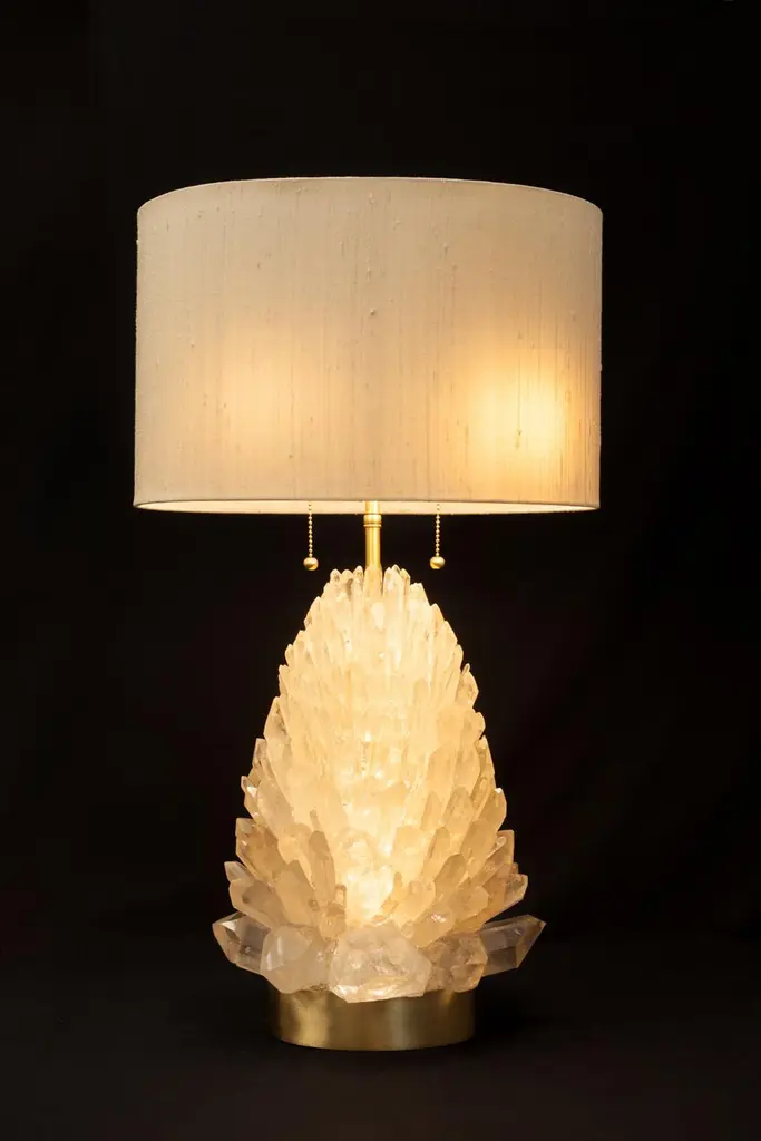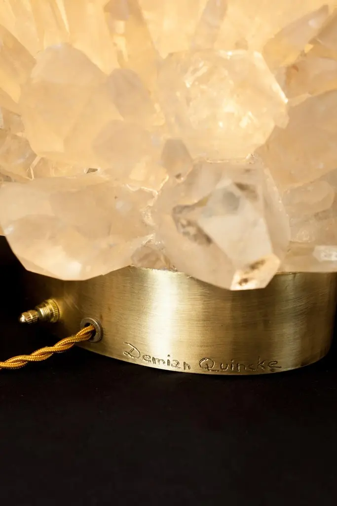 Natural rock crystal table lamp, signed by Demian Quincke.Natural rock crystal assembled and sculpted on brass base.Dimensions: 70 x 30 x 26 cm.Brass 2lt.cluster with large body, includes pull chain sockets, swivels, body.top adjustable shade rest . + 8ft Long Gold Twisted 18 Gauge /SPT-2 type UL listed twisted power cord with antique style phenolic plug.Wire and power cord assembled in the USA.UL listed file number E355225 2X8W BI-VOLT LED +1X4,2W BI-VOLT LED.Demian Quincke develops unique handmade decorative objects d’art from precious stones that are carefully selected and perfectly fitted together, creating amazing forms of brilliance and beauty. The final appearance is like a bouquet of beautifully illuminated flowers, rendered in natural quartz, unfolding their petals.Demian’s artistry is a product of hard work, natural ability, and the unique artistic and cultural environment in which he was raised. Born in France to Uruguayan parents, Demian was exposed early to art by his artist mother and his father, who was a merchant in high decor and antique objects.When Demian was two years old, he relocated with his family to Uruguay, which began the process of broadening his world-view and developing his multi-cultural identity. After stops in California and Germany, he eventually arrived in Brazil at the age of 14, with an appreciation for the wide expanse of the world and his place in it.From the outset of his career, Demain worked to developed his unique style of artistic expression, all the while learning from other artists through observation. In 2010, upon returning from a study tour and research in New York City, he began to create, develop and produce his own pieces.In love with the natural beauty of semi-precious Brazilian stones, Demian uses them as the predominant material of his work. With them, he creates objects d’art that remind the viewer of the Earth’s natural beauty, even though the material has been transformed by his artistry. Internal or external lights enhance the brightness and beauty of the stones, and highlight their artistic metamorphosis.