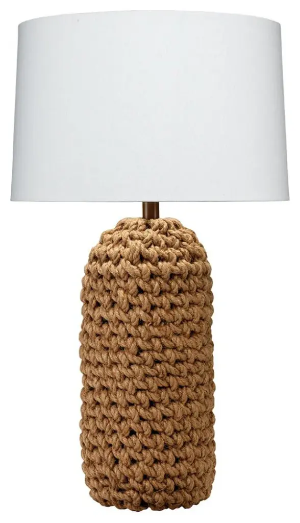 This thick natural rope table lamp executed with intricate nautical woven knot patterns is a great coastal accent for the room. The tapered shade is off white linen fabric.16"L x 16"W x 27"H. Weighs 7 lbs.Hand Finished Natural Rope. Linen Fabric Shade. Very few threads of mixed material and color may be intertwined in rope as a result from the production process in rare instances. Natural rope will fray slightly.UL listed. Uses one max 150W Type A bulb (not included). 3 way socket switch.Heirloom Quality - Expertly hand crafted and hand finished. Due to the hand crafted nature of this piece, each piece may have subtle differences.