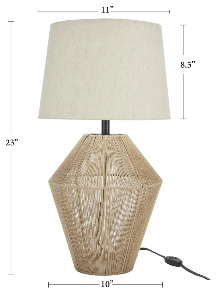 Bring natural vibes to your home with this jute table lamp. With its handwoven, pointed urn shape and tapered drum shade, it diffuses a warm glow that adds a grounded feel to coastal, boho and contemporary settings alike. As each table lamps carries the unique signature of its creator, some variations in appearance may occur. Its distinctive design serves not just as a source of light, but as a centerpiece of conversation, adding a touch of elegance and sophistication to any room. Crafted with meticulous attention to detail, this lamp promises to illuminate your space while also elevating its aesthetic appeal.Product dimensions: 12-in x 12-in x 23-inTan natural jute table lamp with rope textureThis lamp features a light beige linen drum shadePlace on a side or console table to brighten up your living room, bedroom, dining room, or entrywayOn/off switch located on 80-in black cordBulb Not Included: Requires standard 60W E26 bulb not included, LED Compatible
